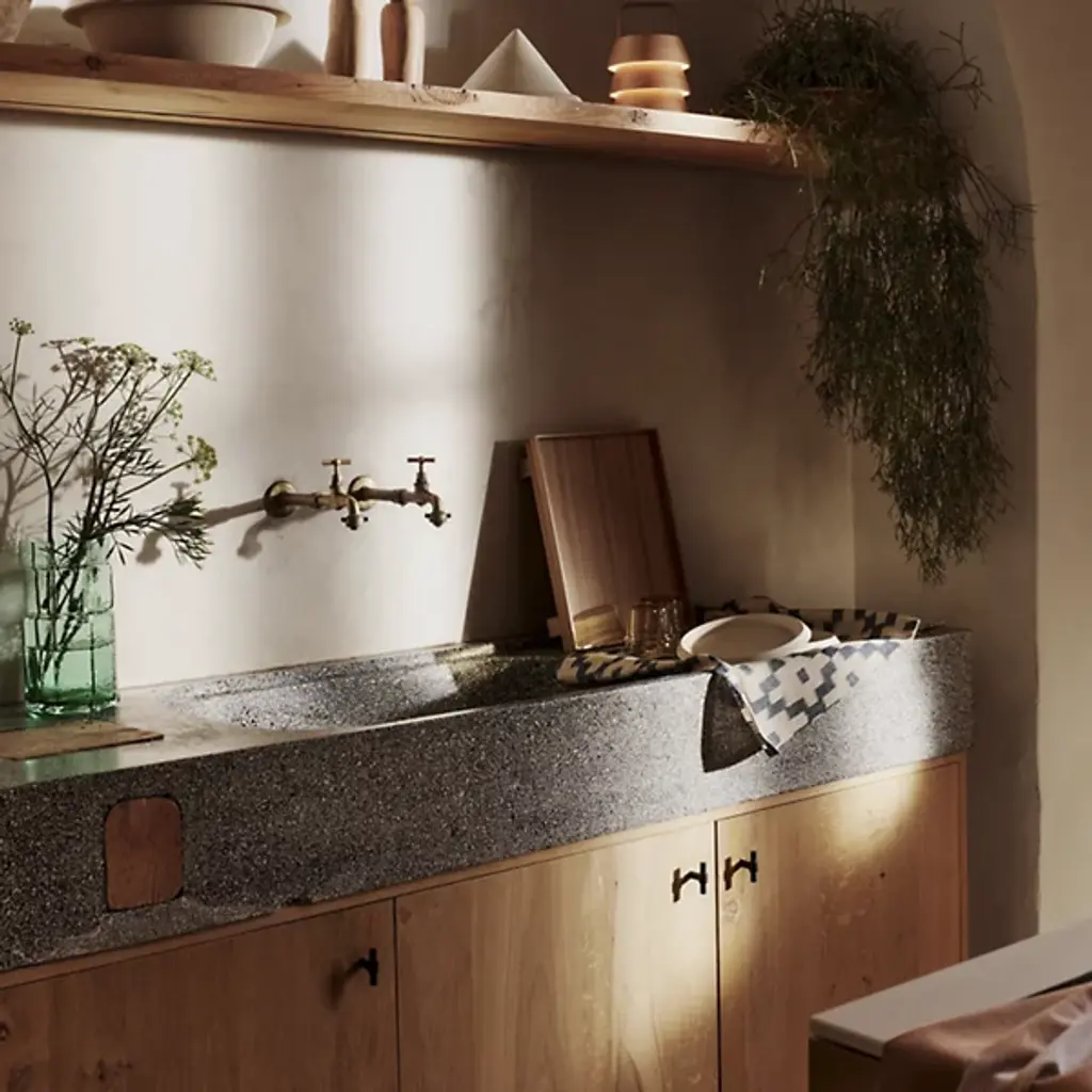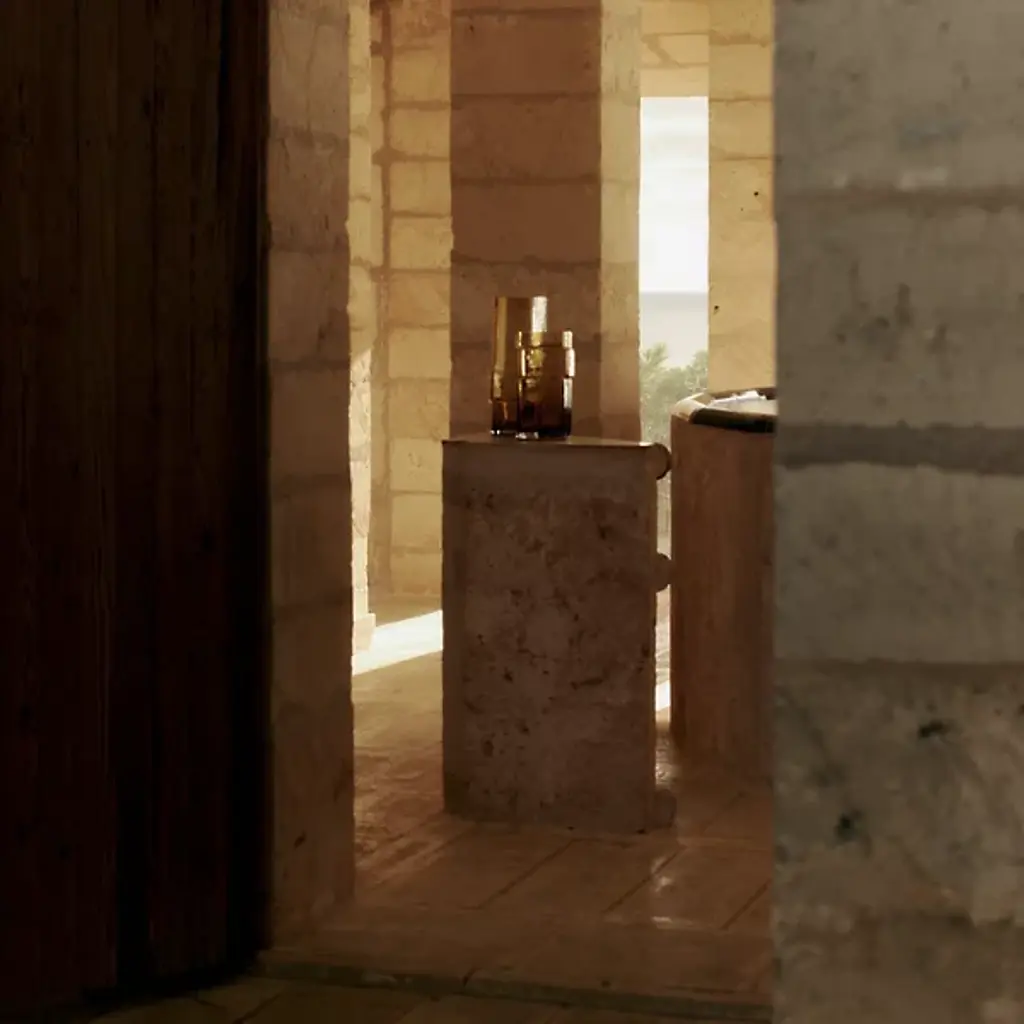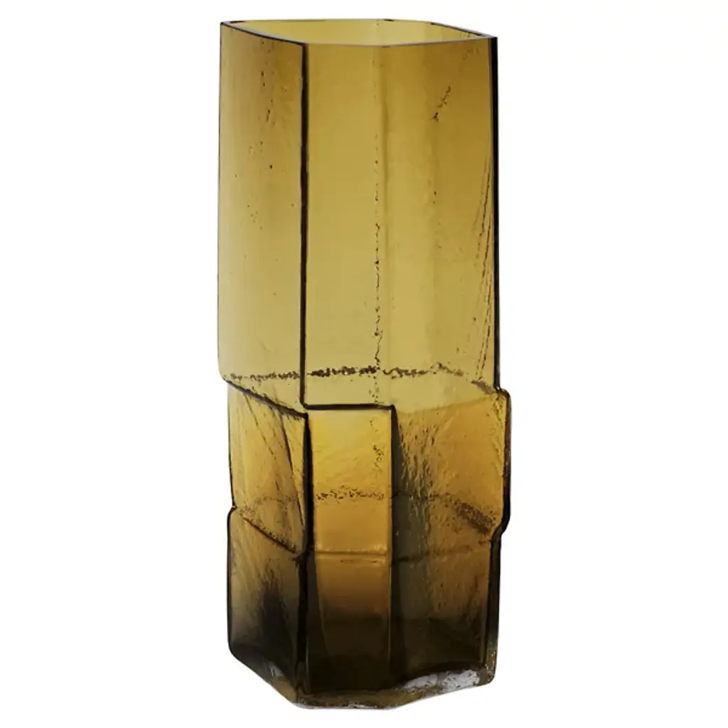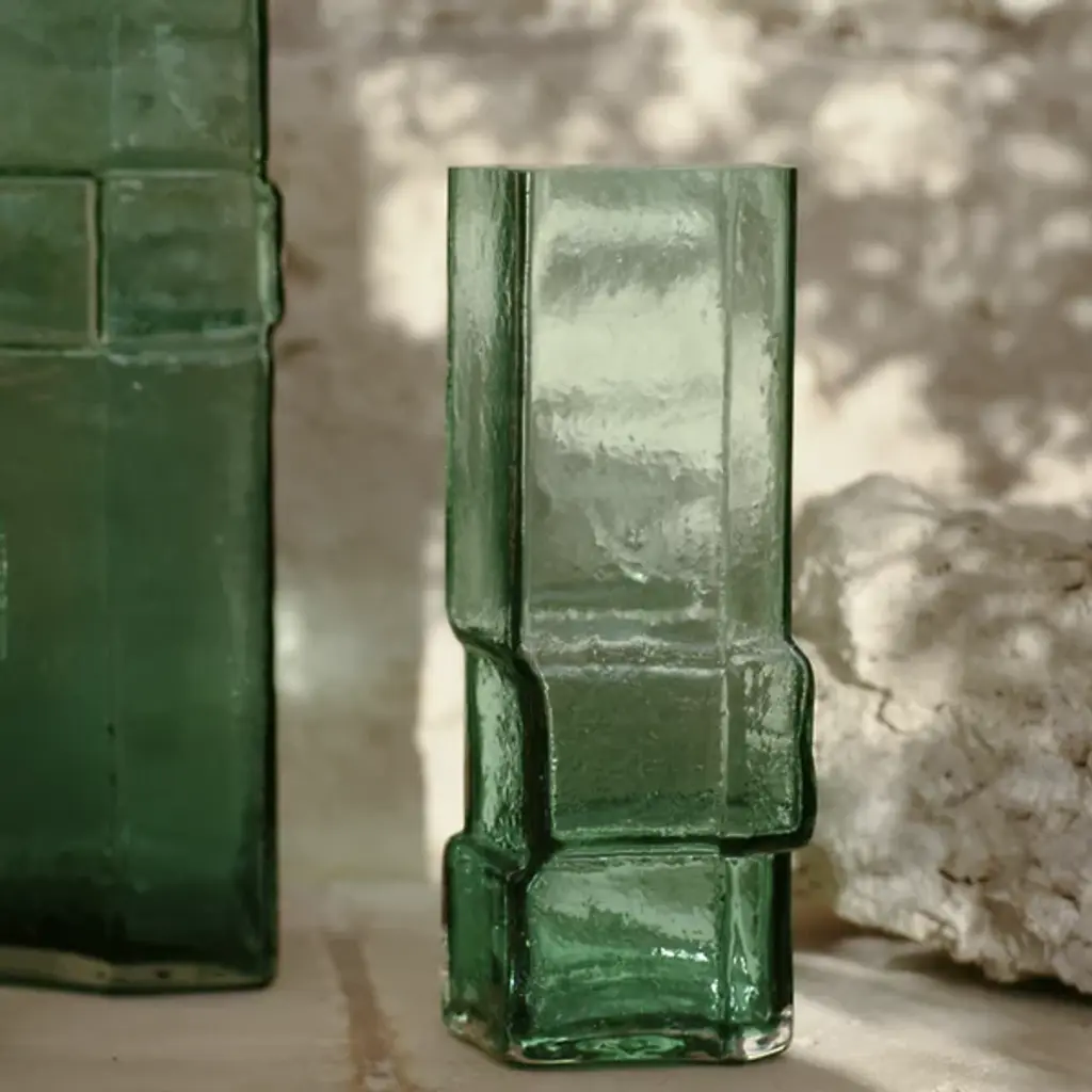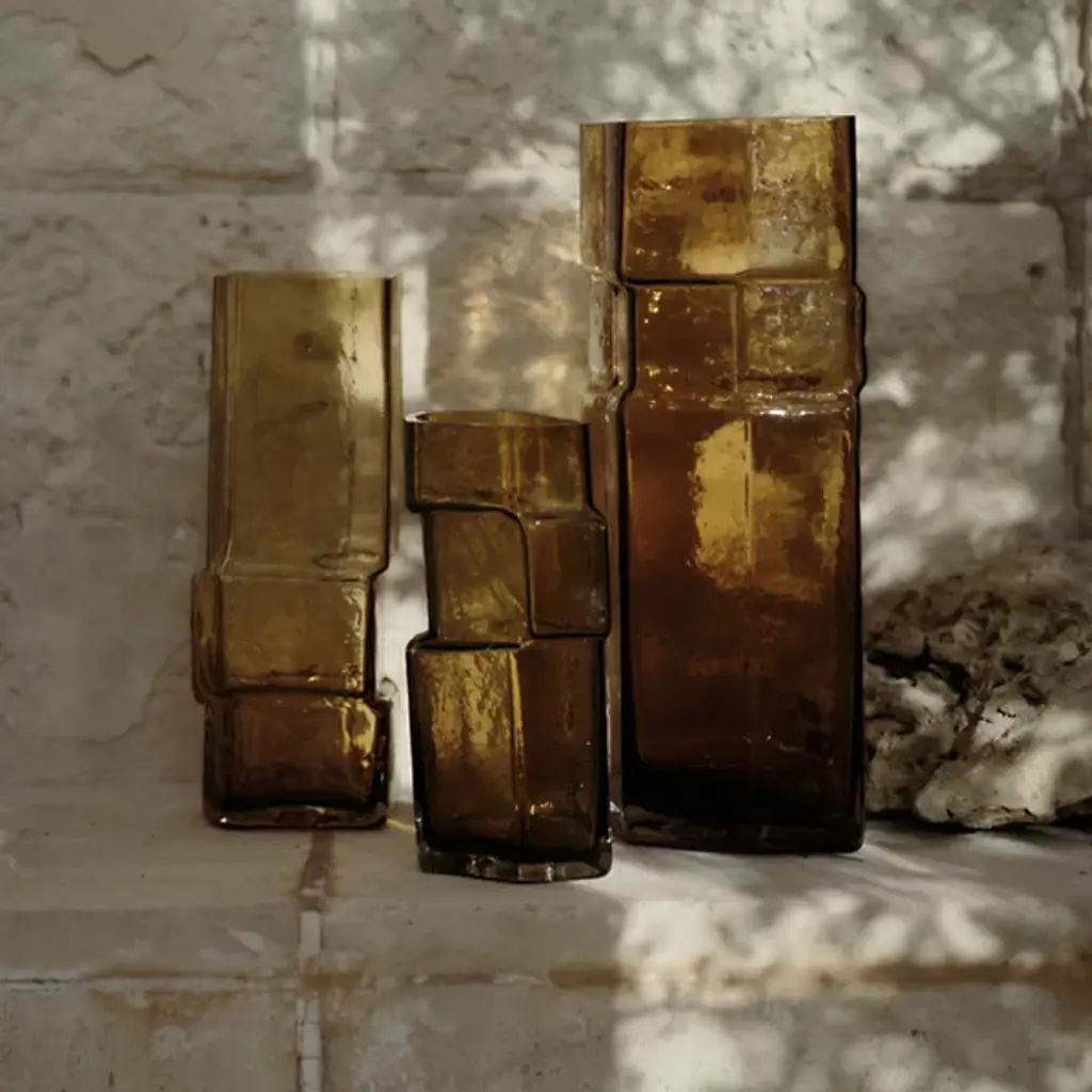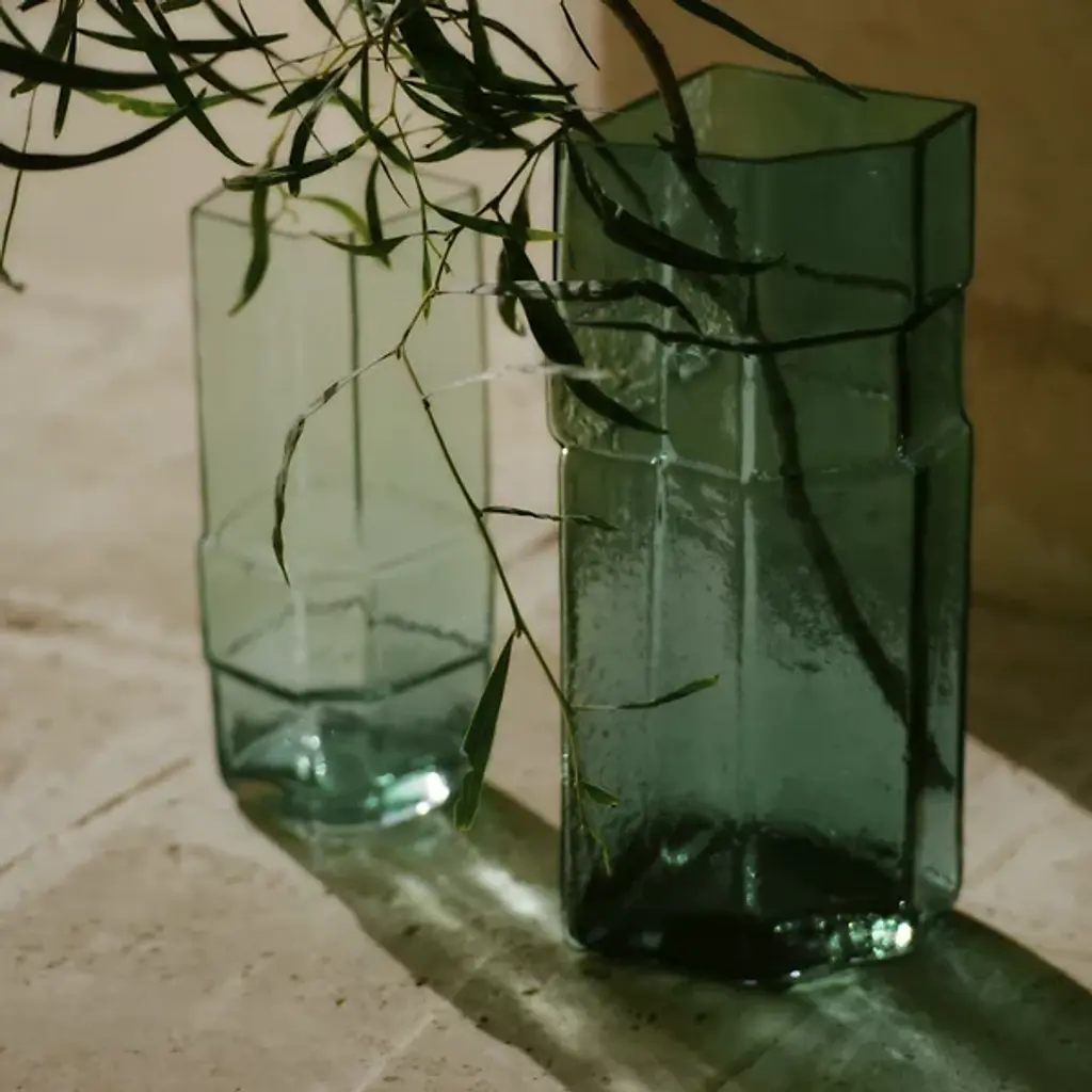 The Muro Vase from Ferm LIVING emerges from a collaboration with architect Jørn Utzon's legacy, taking its name from the Spanish word for "wall." Craftspeople create each piece by pressing recycled glass into molds made from actual bricks, capturing the rough texture and angular edges of masonry. The mouth-blowing process ensures that no two vases are identical, giving each one unique variation in thickness and form. This architectural inspiration translates into a vessel that works equally well holding fresh flowers or standing empty as sculptural art.