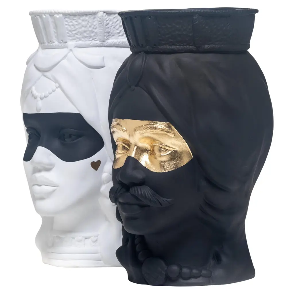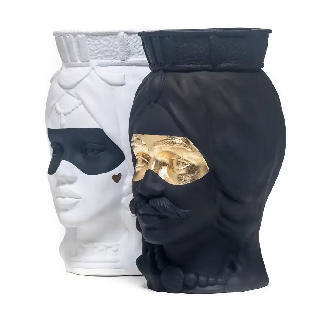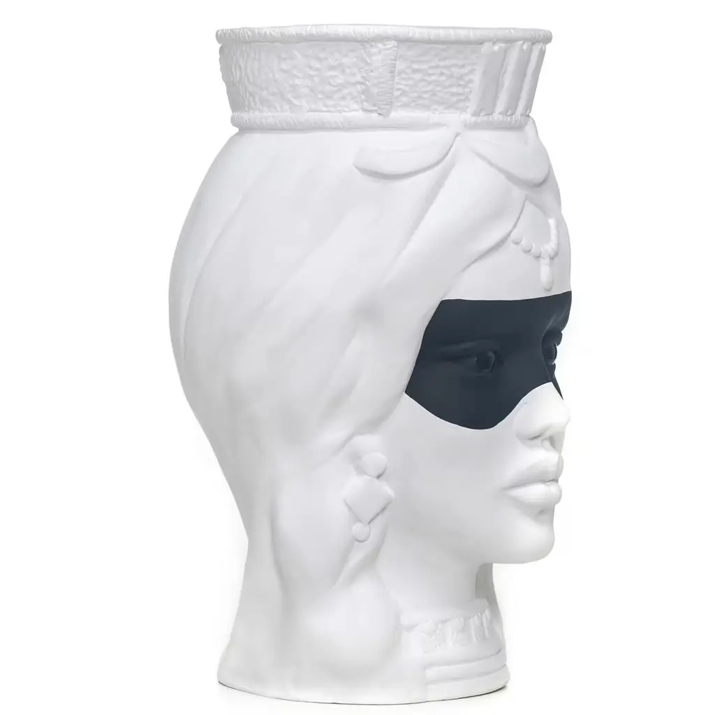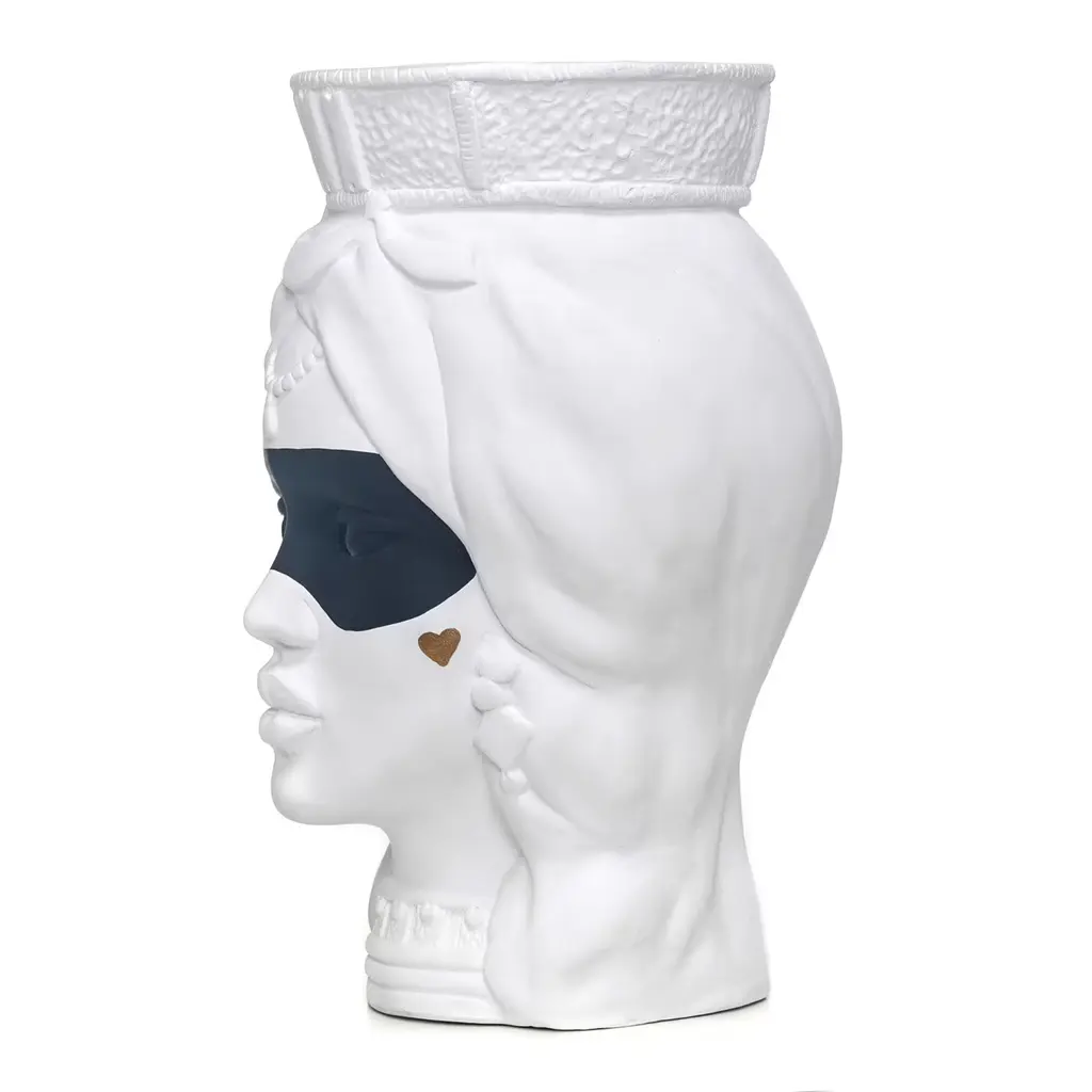 Rich in artistic and historical significance, this anthropomorphic vase is an iconic homage to Sicily's rich Moorish influence. Entirely handmade of terracotta, this vase of Musidora (Greek for "gift of the muses") boasts a bold countenance: the hair is gathered by a supple turban and framed by a fez and jewels, while the deep eyes and sumptuous lips emphasize the piercing gaze. The white matte glaze strikingly contrasts with the black band placed across the eyes, creating intense color and textural depth. Best showcased in a foyer or living room for an eye-catching effect. The vase cannot be filled with water.