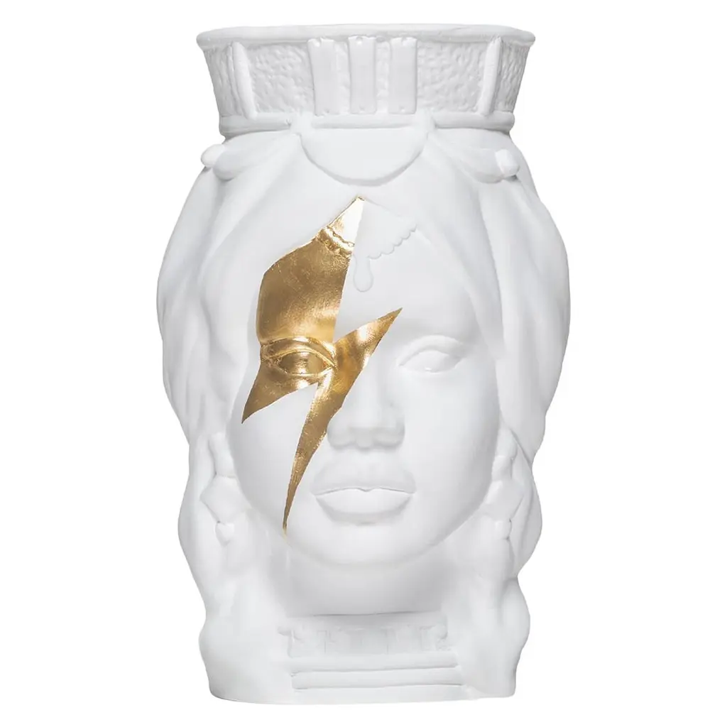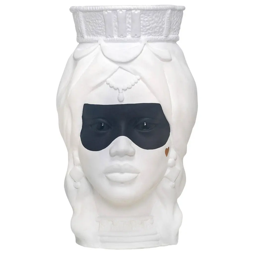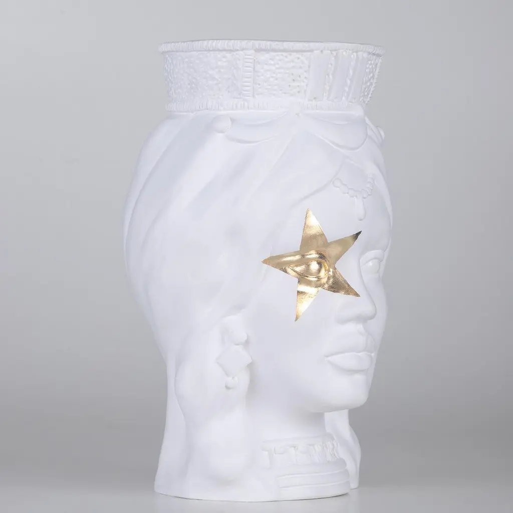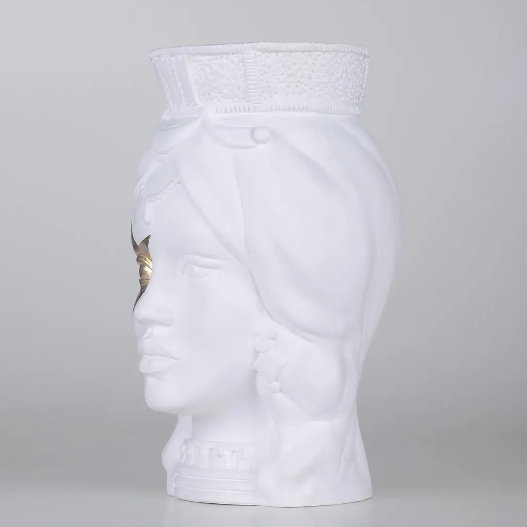 Entirely handmade of terracotta, this anthropomorphic vase depicts Musidora (Greek word for "gift of the muses"), a young woman wearing a crown with her hair gathered in a soft turban. Her noble visage, framed by jewels, is characterized by piercing eyes and voluptuous lips to emphasize her bold expression. Finished by hand with white matte glaze, a gold foil star is placed on one of her eyes to enhance her striking gaze.
