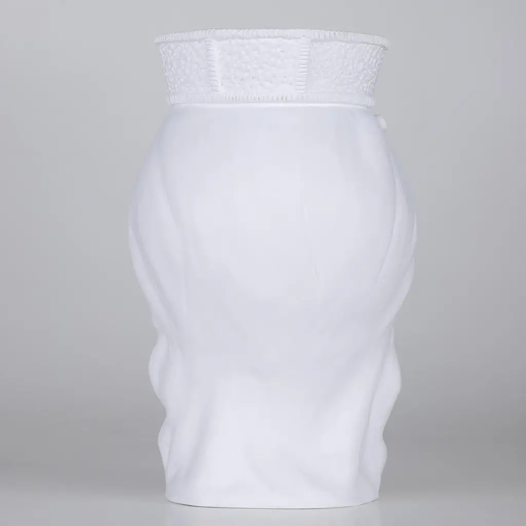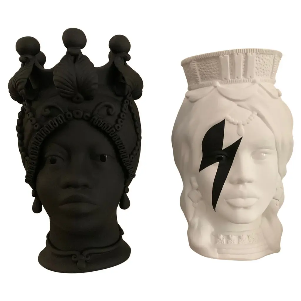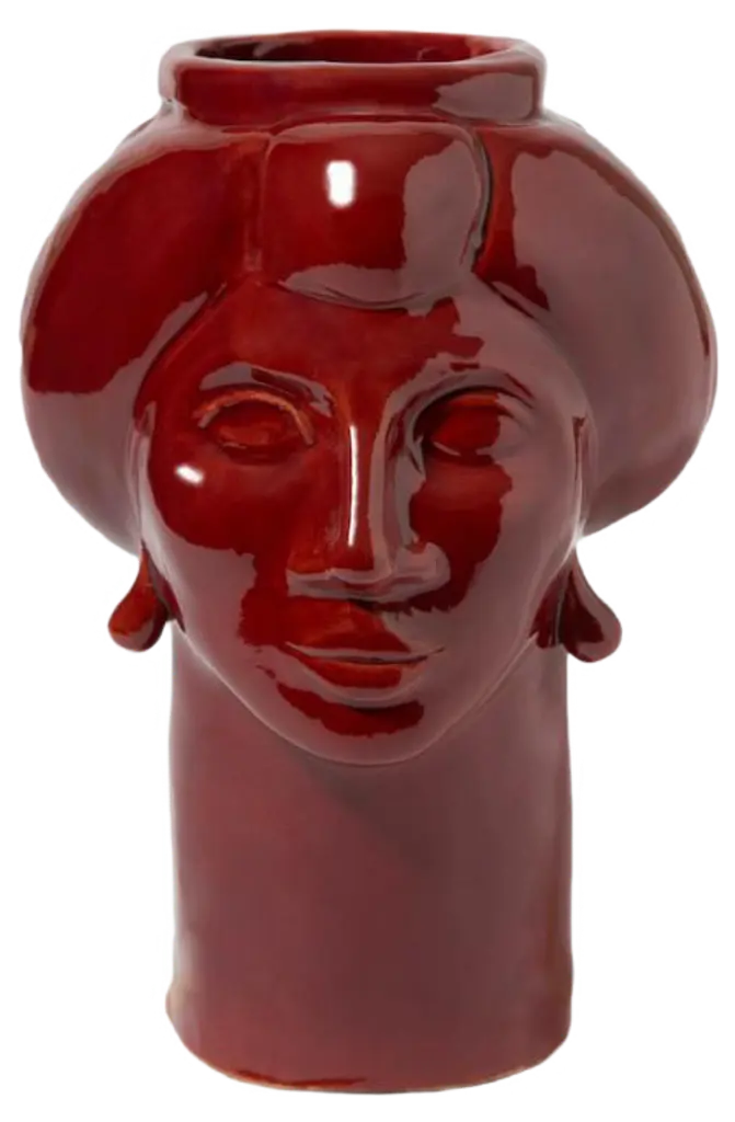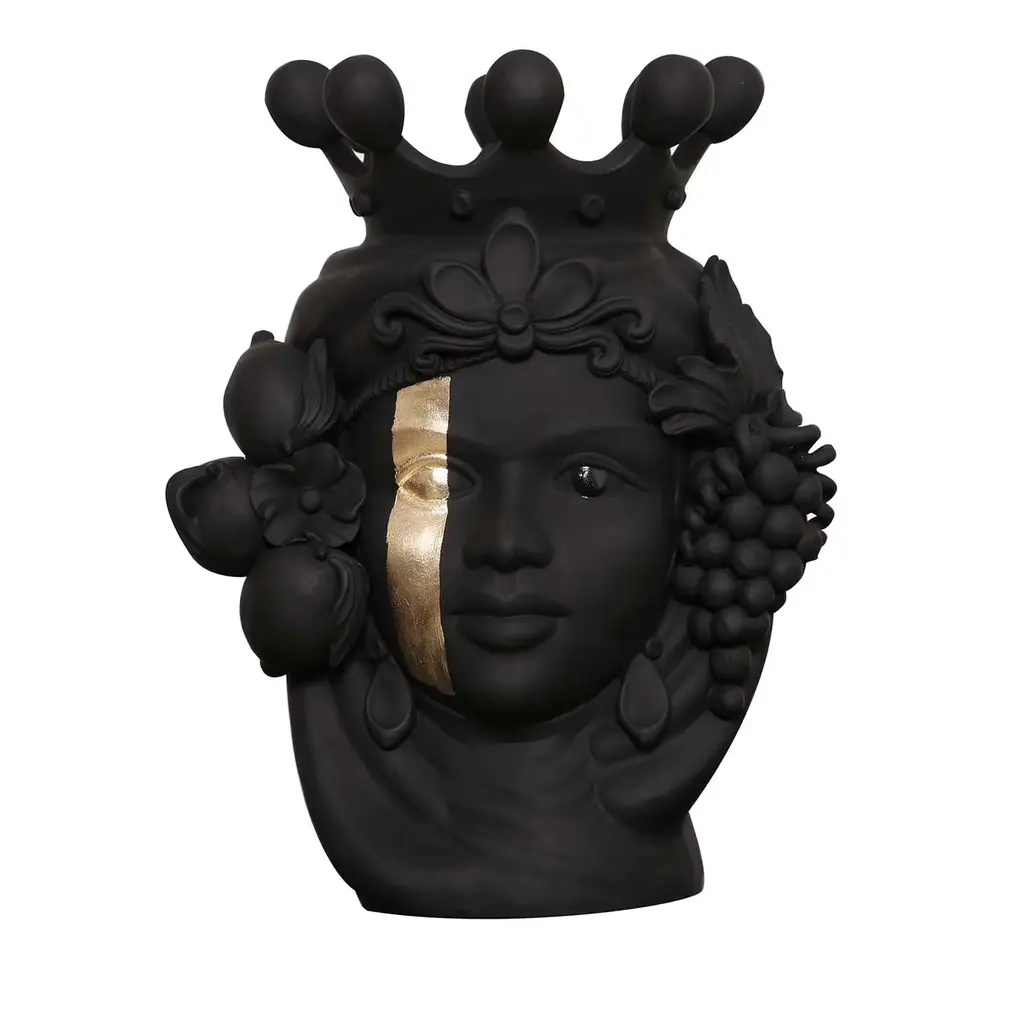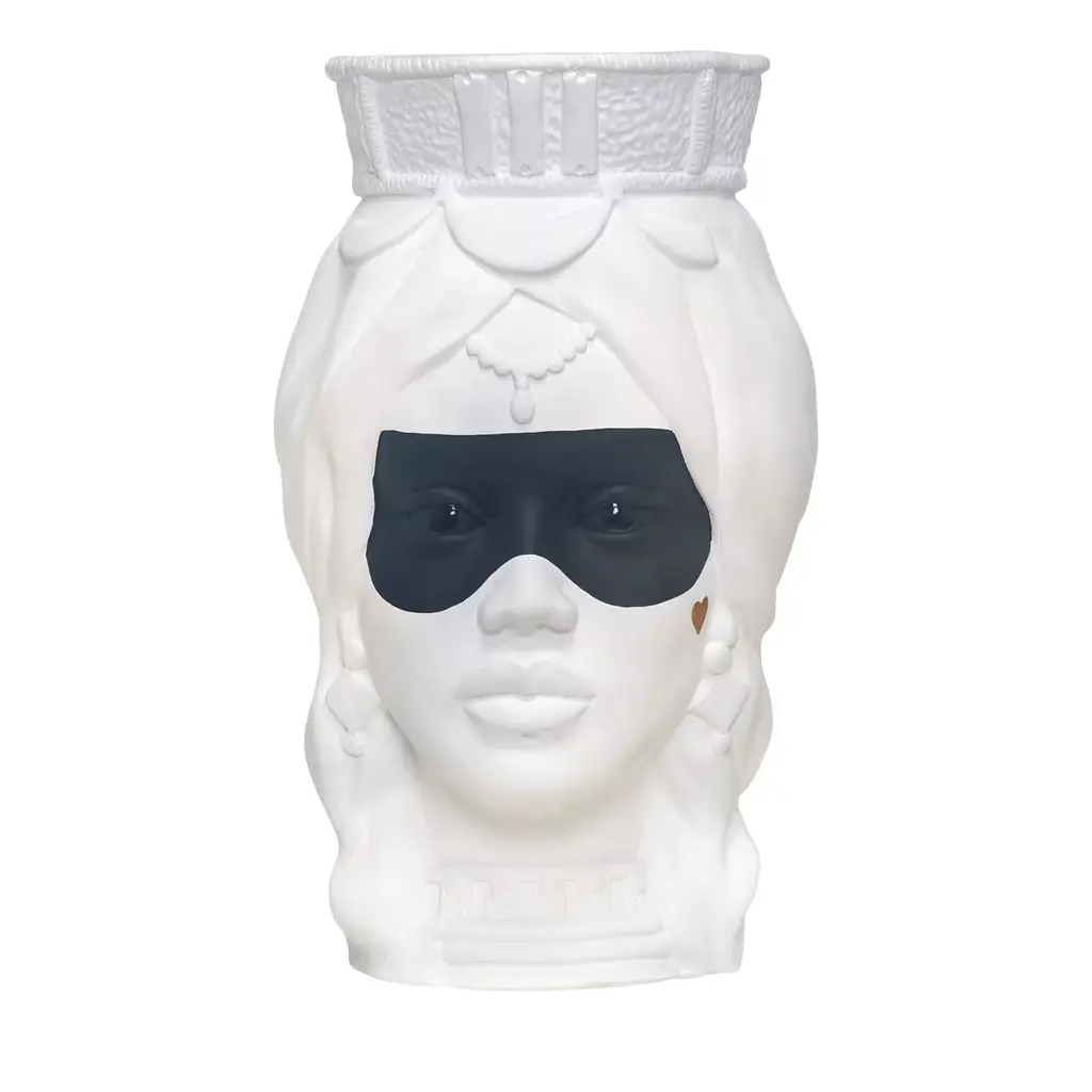 Entirely handmade of terracotta, this anthropomorphic vase depicts Musidora (Greek word for "gift of the muses"), a young woman wearing a crown with her hair gathered in a soft turban. Her noble visage, framed by jewels, is characterized by piercing eyes and voluptuous lips to emphasize her bold expression. Finished by hand with white matte glaze, a gold foil star is placed on one of her eyes to enhance her striking gaze.