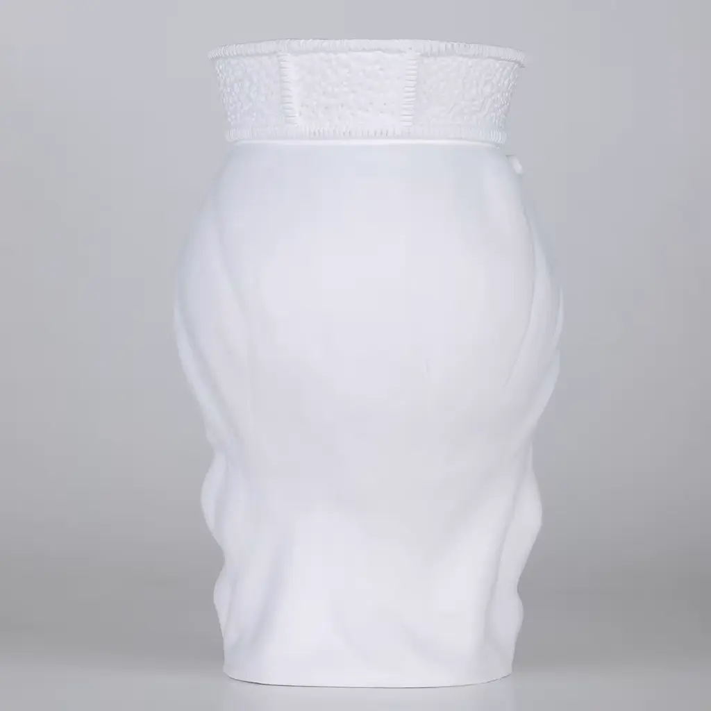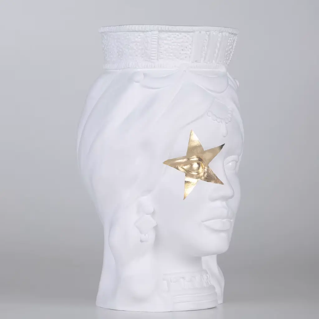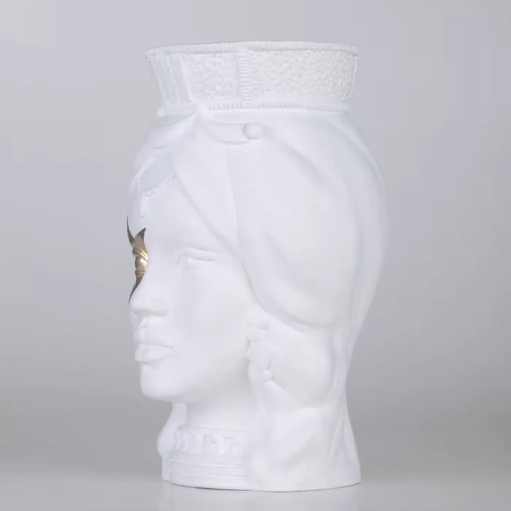 Entirely handmade of terracotta, this anthropomorphic vase depicts Musidora (Greek word for "gift of the muses"), a young woman wearing a crown with her hair gathered in a soft turban. Her noble visage, framed by jewels, is characterized by piercing eyes and voluptuous lips to emphasize her bold expression. Finished by hand with white matte glaze, a gold foil star is placed on one of her eyes to enhance her striking gaze. The vase cannot be filled with water.