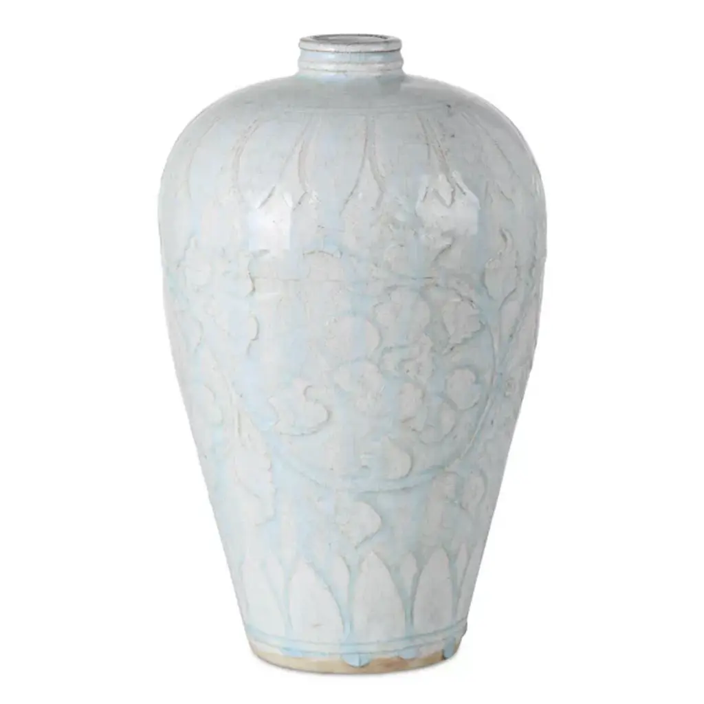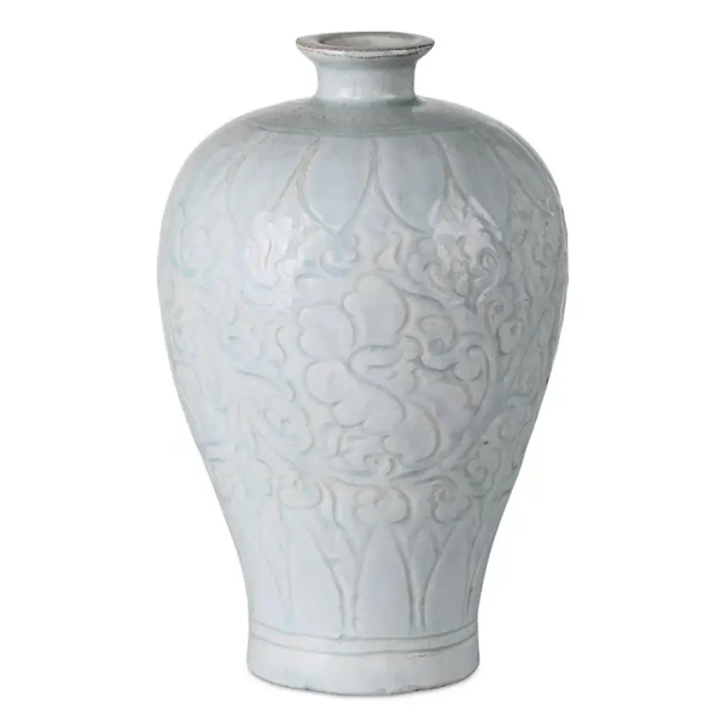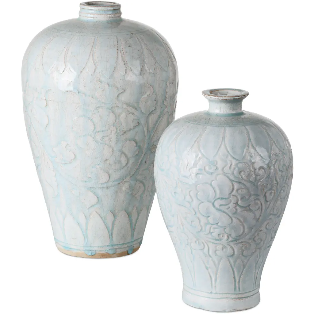 The Nanjing Vase, Set of 2 from Currey & Company reflects the rich tradition of Chinese ceramic artistry through distinct vessel forms. This set includes an urn vase and a plum vase, both modeled after ritual bottles from the Ming dynasty period. Delicate cloud and lotus motifs swirl across each surface, adding symbolic meaning alongside decorative appeal. The traditional glazing technique creates depth and visual interest while honoring historical craftsmanship methods.