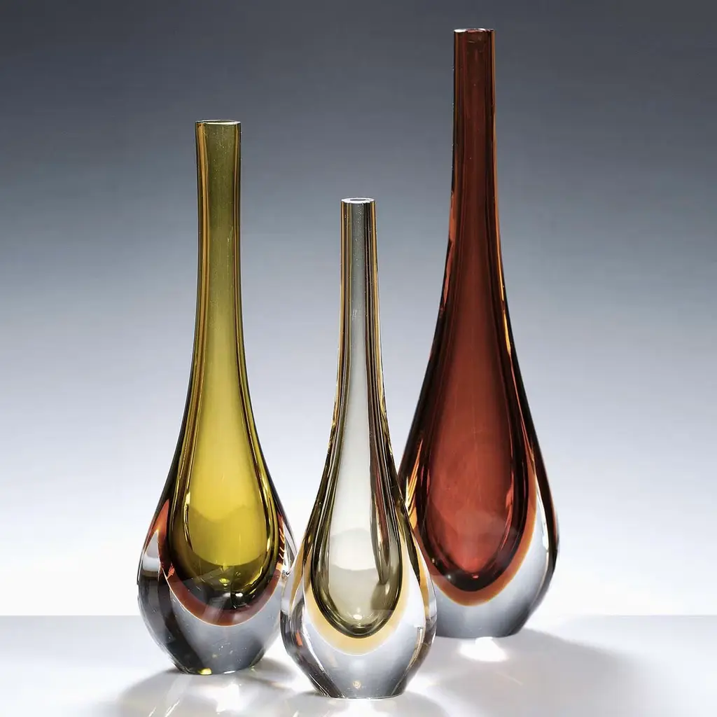An effortless combination of classic materials with a modern aesthetic, this handmade Murano glass vase will elevate the timeless appeal of a post-modern or minimalist decor. Entirely handmade, the vase is characterized by its warm amber glass hue and the subtle gradient revealed by the clear glass. The teardrop silhouette, complete with a slender neck and wide base, accentuates the color and visual balance of the piece. This piece is best displayed with other pieces from the Narciso Collection for a cohesive look.