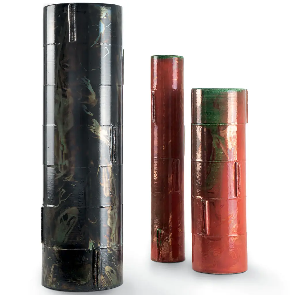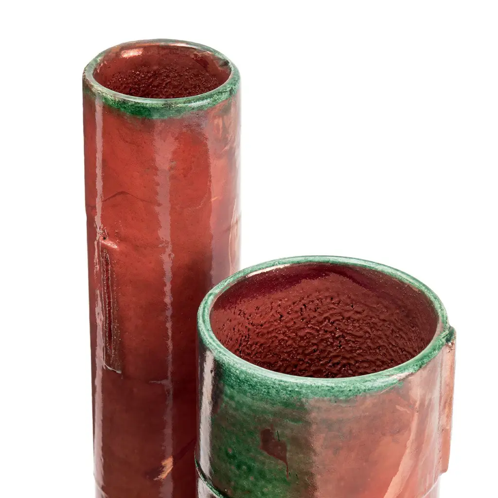 Poetically inspired by bamboo canes, this singular ceramic vase belongs to a series of stunning ceramic pieces sealed by luminous metallic glazes. A warm and stylish oxidized copper finish marks the design, a choice enhancing the textural detailing of its phytomorphic-inspired silhouette. Two more size variants are available, please contact the Conciege for information.