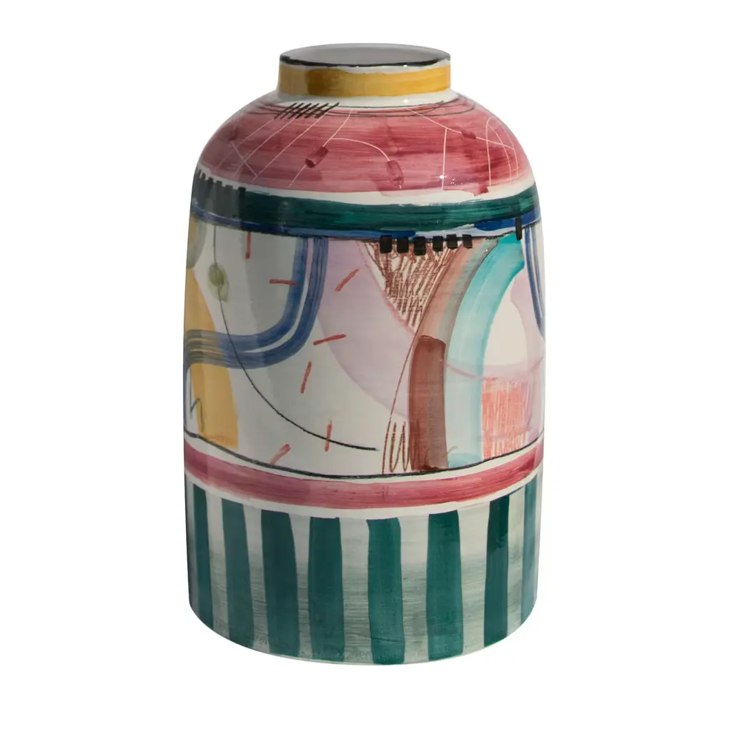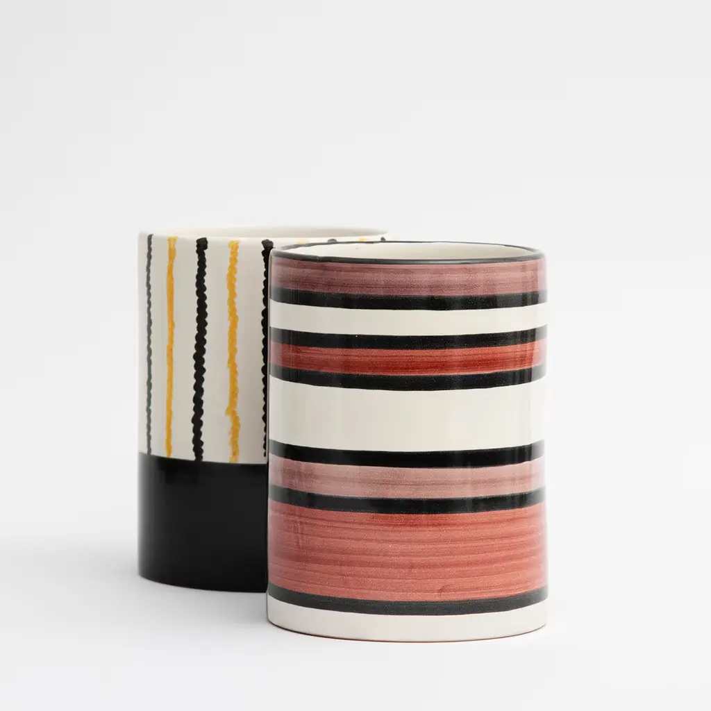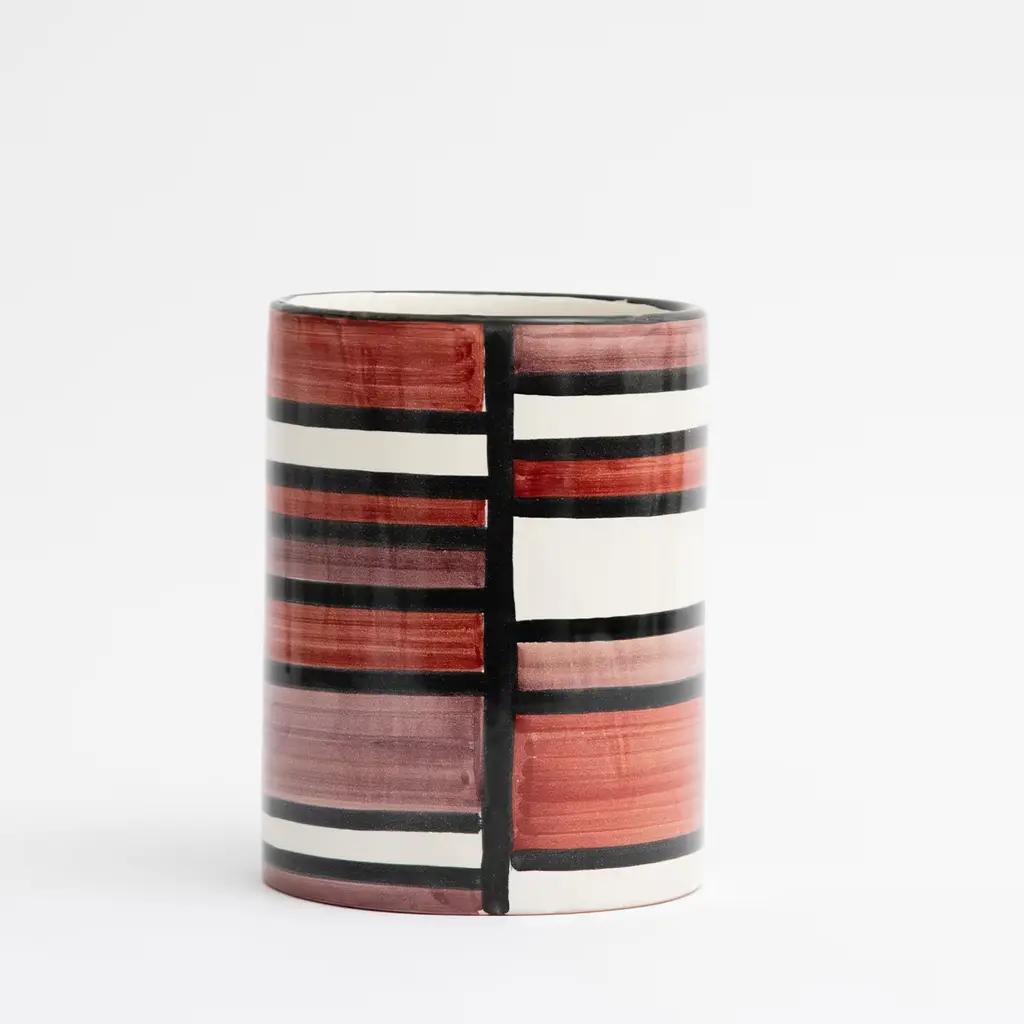 Deftly crafted and decorated by hand, this cylindrical ceramic vase results from the synthesis between elementary geometric volumes and singular warm-toned brushstrokes. Different rust shades are illuminated by white-glazed blocks, a pattern outlined by linear black contours. Potential imperfections are a natural consequence of its artisan quality.