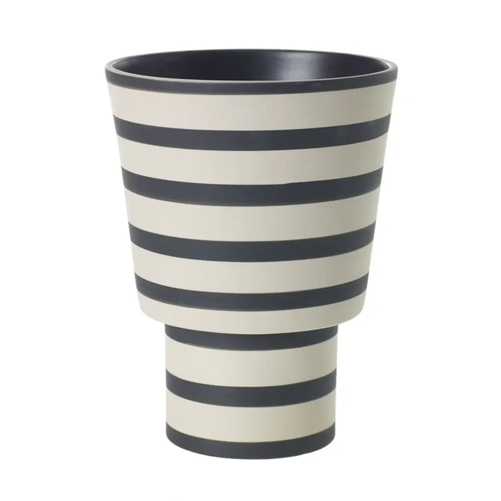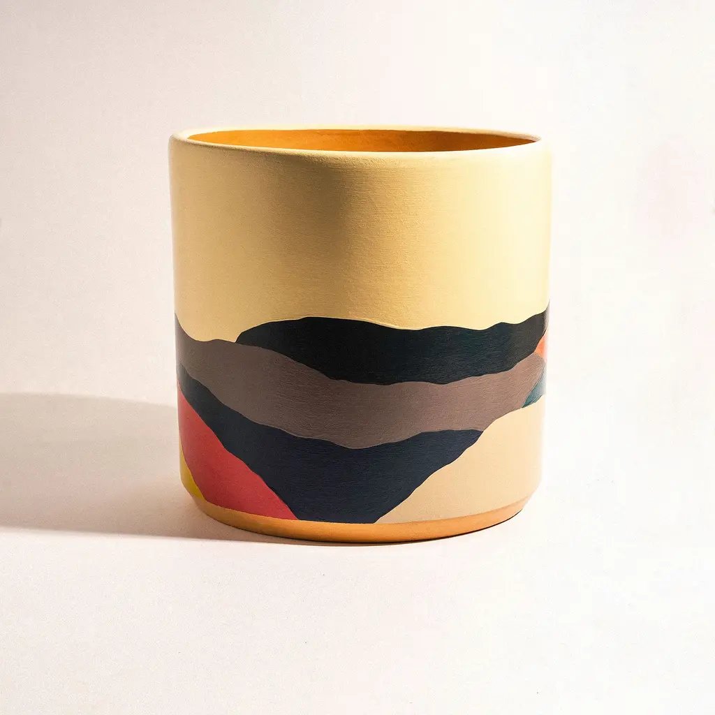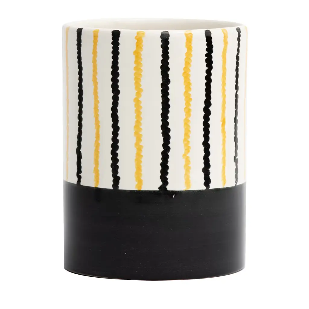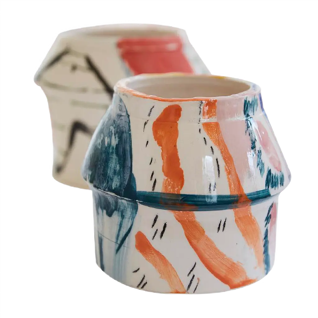 Deftly crafted and decorated by hand, this cylindrical ceramic vase results from the synthesis between elementary geometric volumes and singular warm-toned brushstrokes. Different rust shades are illuminated by white-glazed blocks, a pattern outlined by linear black contours. Potential imperfections are a natural consequence of its artisan quality.