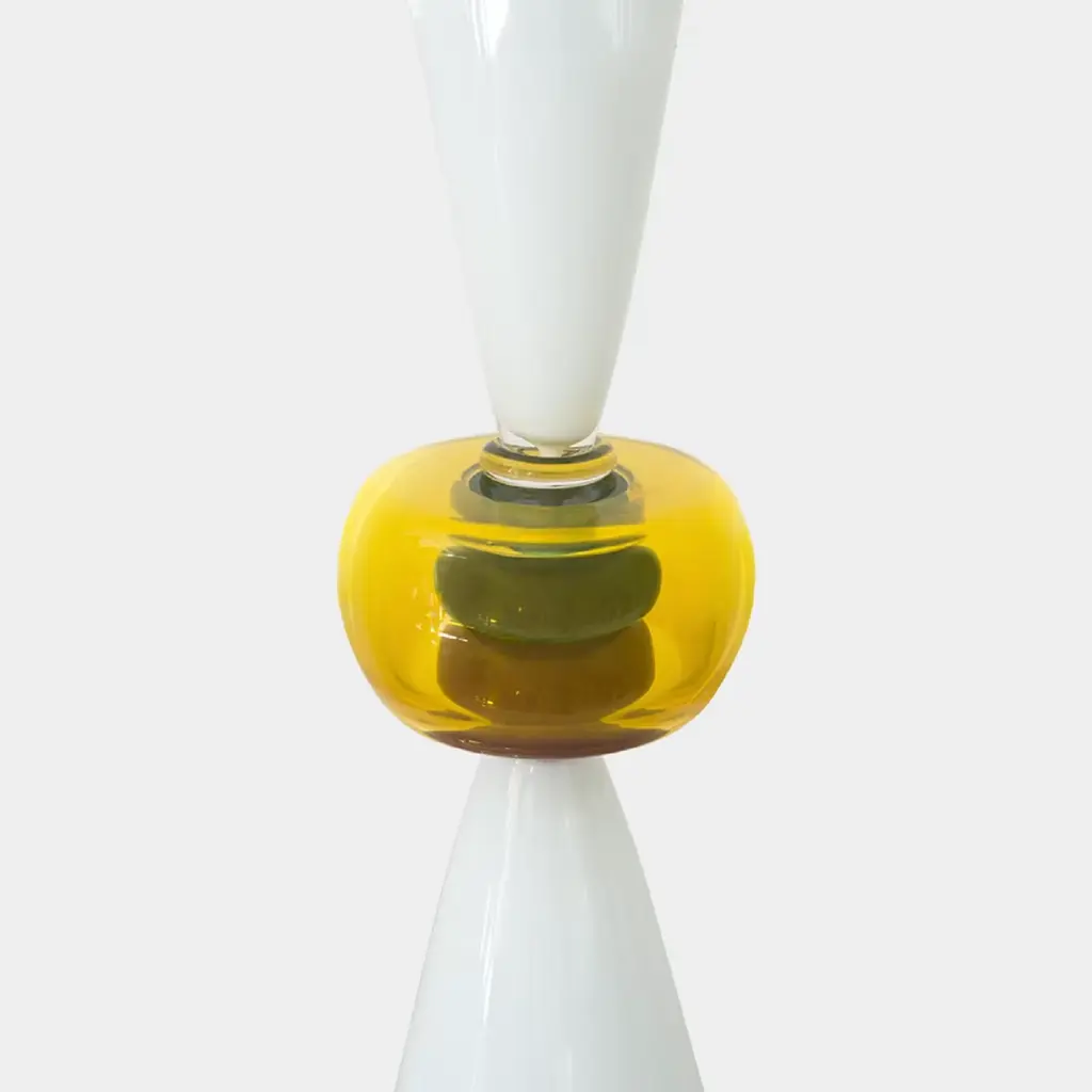 Designed in 1986 by Ettore Sottsass, this superb vase is crafted of blown glass. Its exquisite silhouette features a flared base, signed with the name of the artist, supporting an elongated white cone with a dramatic black flared mouth, while in the center a round yellow element encloses red and green spherical decorations. Colors and measurements might slightly vary, due to the hand-crafting methods used to produce it.