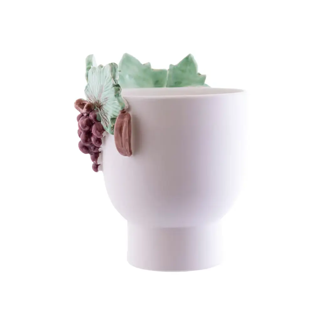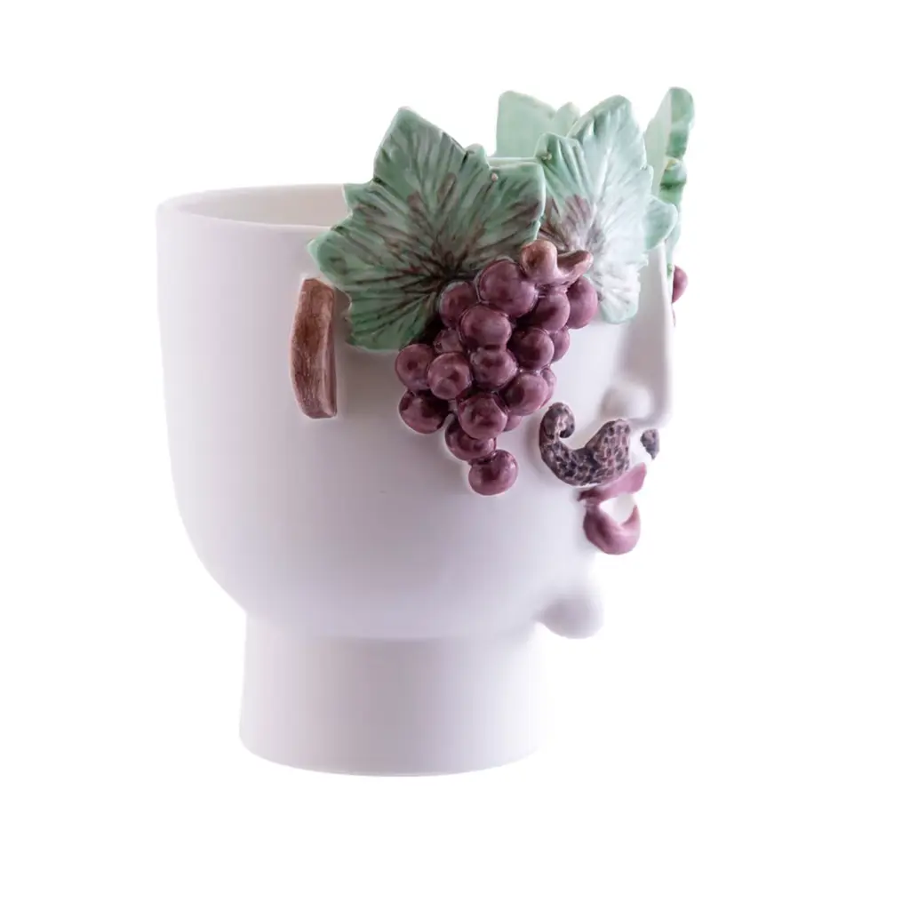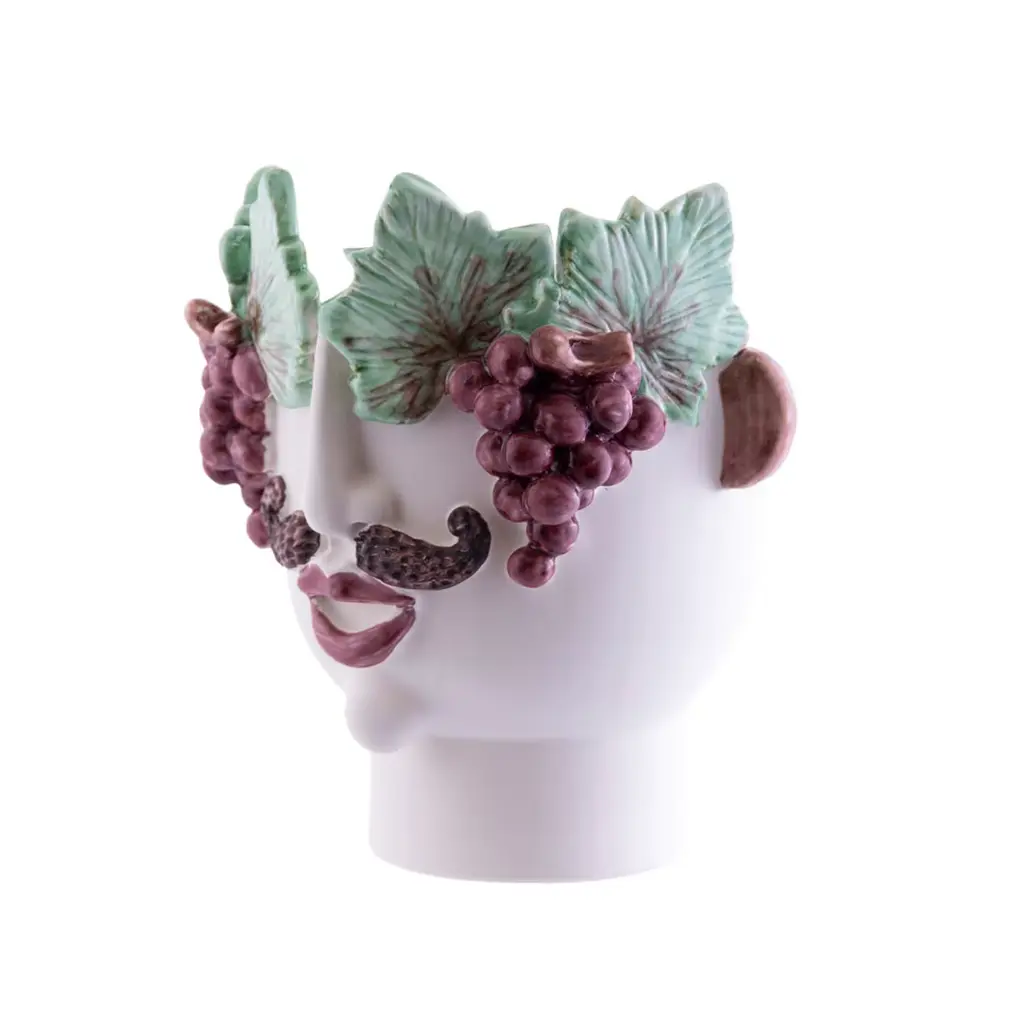 Nerello is a young Sicilian grape seller. He brings happiness and joy wherever he goes and his wine is sweet and fragrant like his bunches of Sicilian nerello. The vase is crafted from white clay, fired twice in a kiln, and glazed with a matte light cream glaze and colored crystalline in green and burgundy. Each piece is handmade without the use of molds or semi-industrial techniques, ensuring that every head, while following the same design, is unique and different from the others, making each a one-of-a-kind piece.