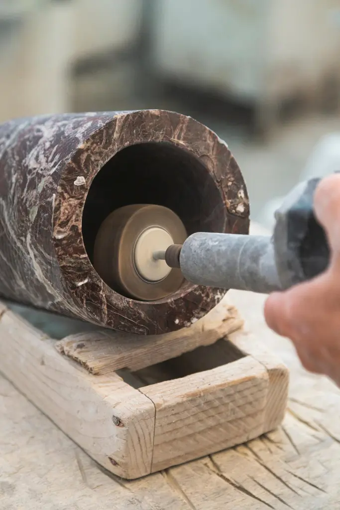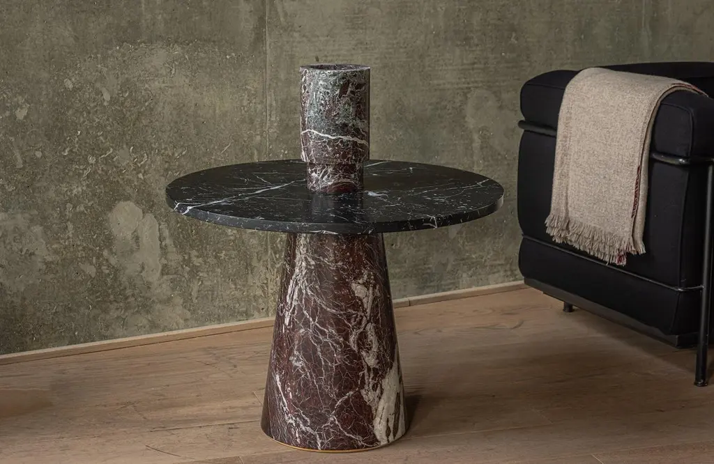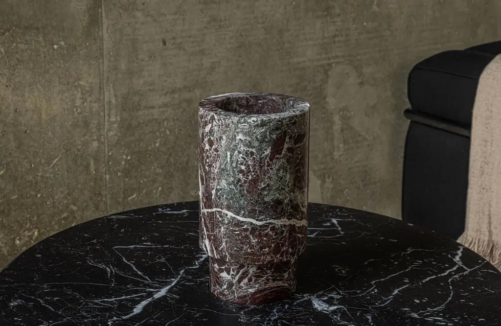 The value of change in a simple act. Karen Chekerdjian’s new creation puts design front and centre: from one foundation, multiple possibilities. Whether empty or filled with flowers, vases – seen as containers and gifts alike – always tell a tale of magic, of shapes and colours in perfect harmony with the surface holding them. The vase can be a top element for Inside Out Table as well as a furnishing accessory that stands on its own.Dimensions: 24 x Ø 8 cm. Commercial name: Inside Out Flower Vase, by the Lebanese designer Karen Chekerdjian. Red Levanto Marble. Also available with Black Marquinia and Blue Sodalite Marbles.Made in Italy, hand finished.MMAIRO marble products are made of valuable materials and need to be handled with care. Any difference between similar objects and from their picture on the catalogue are due to the nature of the marble, and costitute an additional value of each piece, making it truly unique and special. The contact with acid or corrosive substances may adversely affect the surface. Hand washing is recommended. Special stain treatment, where necessary food compatible.
