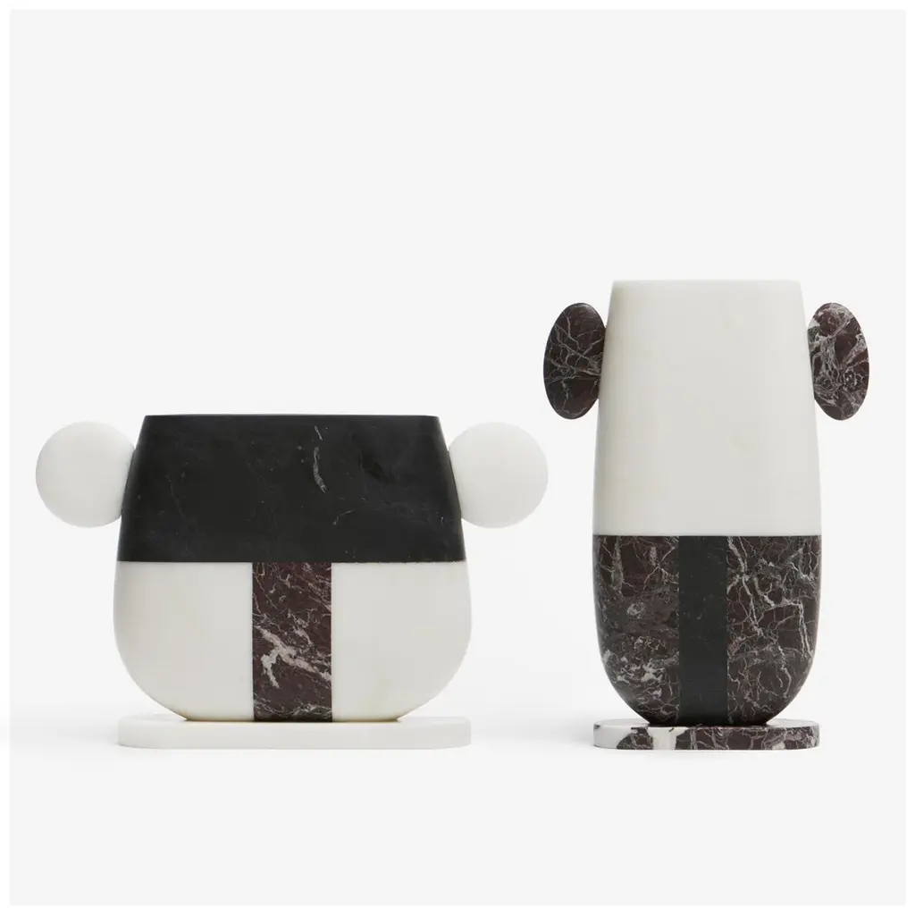 Vase in black Marquinia, Red Levanto and white Michelangelo marble,Size: 38.2 x 23.4 x 7.3 cm, smooth finishing. Commercial name: Tacca, Homage Collection by the Italian designer Matteo Cibic. Made in Italy, hand finished.Originating in Carrara, baroque and dichromatic. Cibic pays tribute to Tuscany’s great sculptural tradition in the wake of Pietro Tacca, epitome of Florentine baroque, with a vase that is pure delight; alternating black and white. And it may be that Tacca proves as lucky as Porcellino, one of the illustrious sculptor’s works. Vases made of various marbles cannot guarantee water tightness, better not to use for cut flowers unless with vials for each flower, an internal glass/plastic jar or gel water pearls.MMAIRO marble products are made of valuable materials and need to be handled with care. Any difference between similar objects and from their picture on the catalogue are due to the nature of the marble, and costitute an additional value of each piece, making it truly unique and special. The contact with acid or corrosive substances may adversely affect the surface. Hand washing is recommended. Special stain treatment, where necessary food compatible.