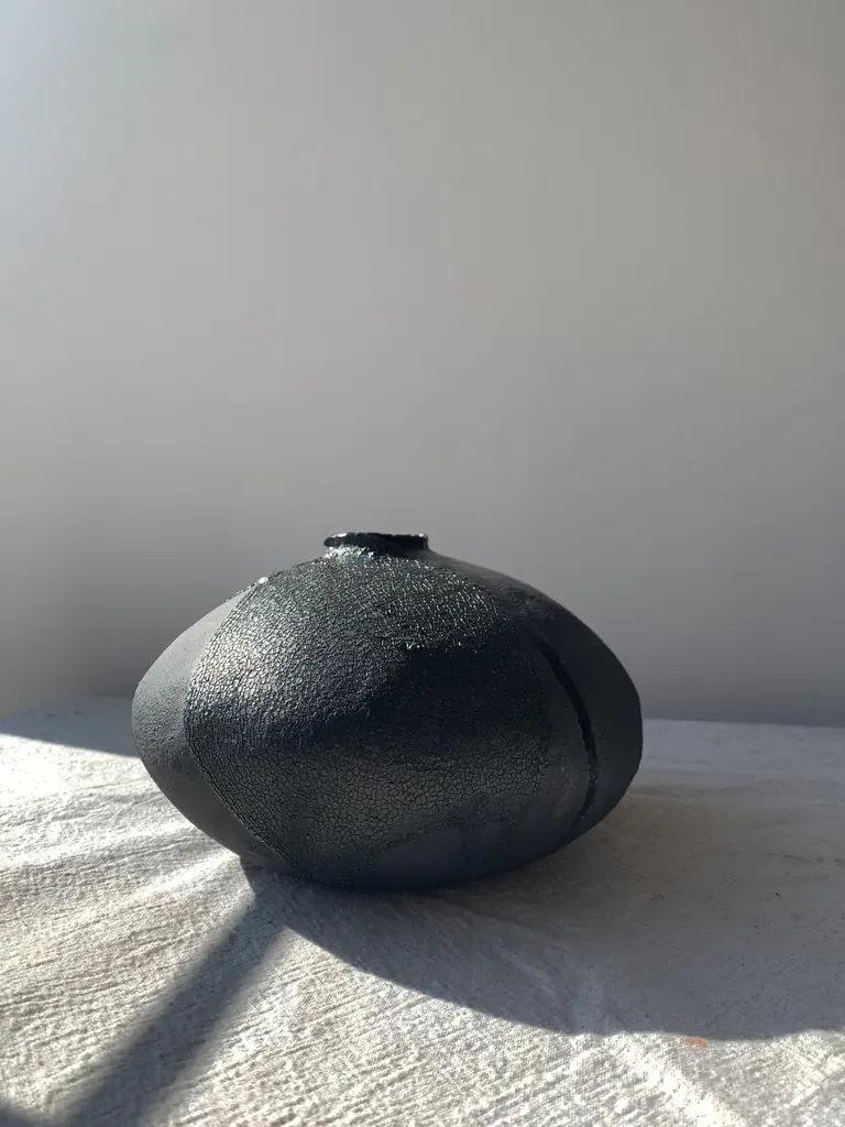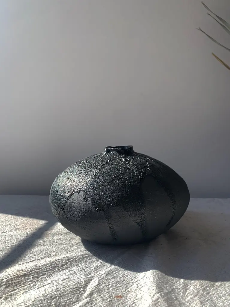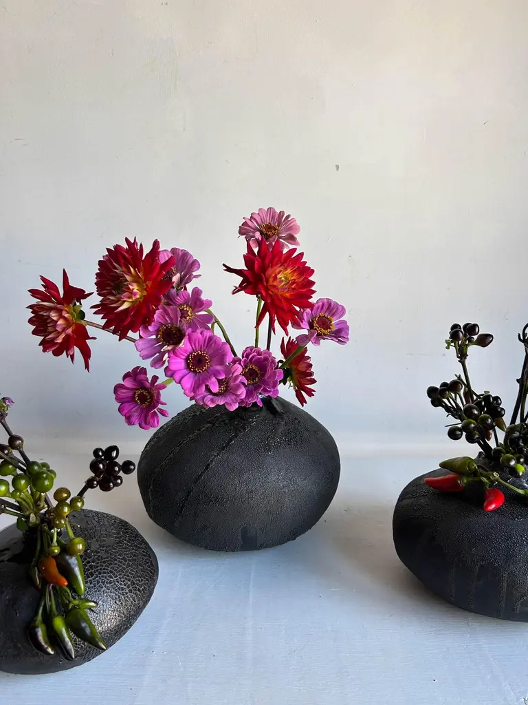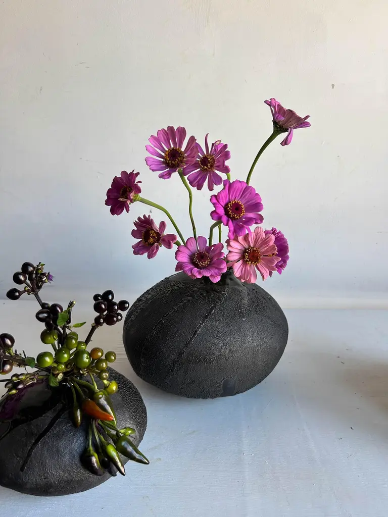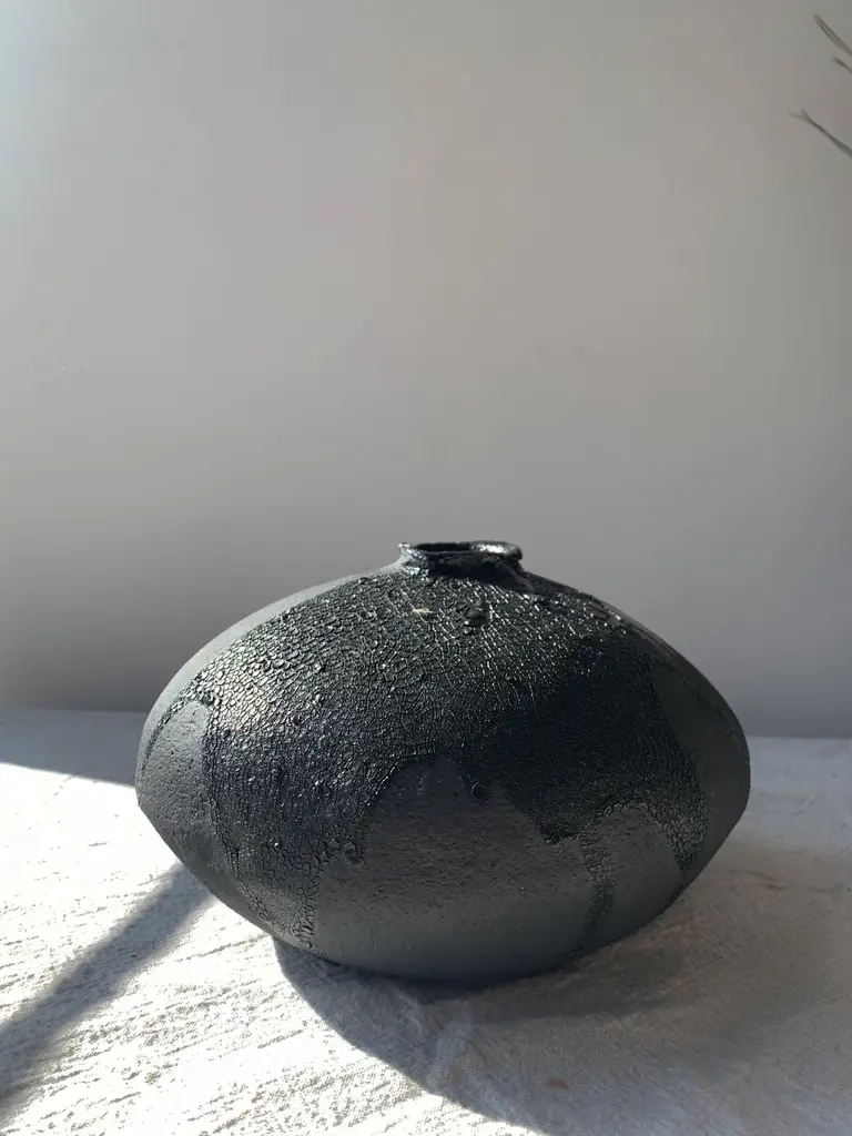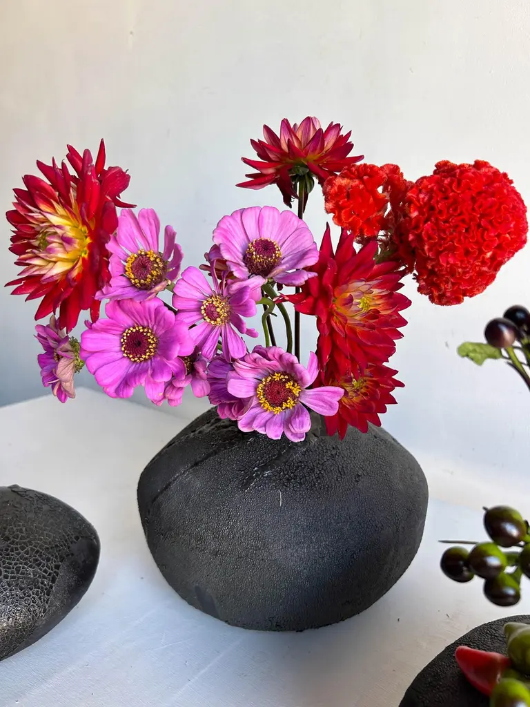 Handbuilt organic modern vase made from a groggy clay body covered in a matte black glaze with layers of glossy and crawling black glaze on top. Each vase is made by hand in our Brooklyn studio, and no two are ever exactly alike. The new moon vase is striking in its simplicity, and has an approximately 2" opening equally suited to one striking branch or a bouquet.