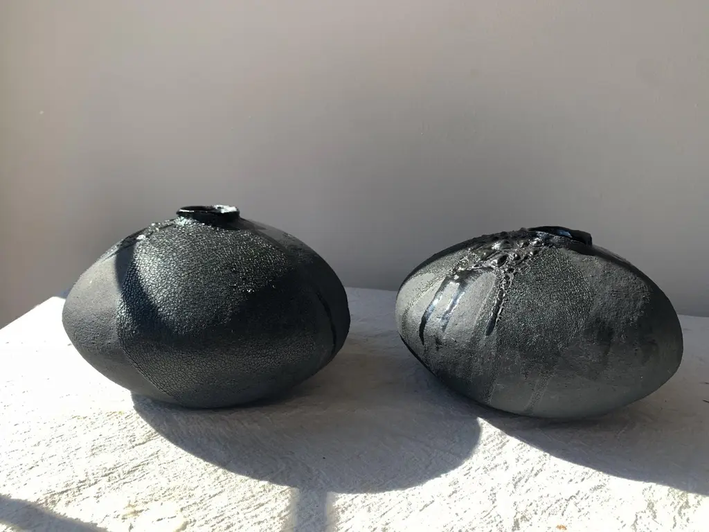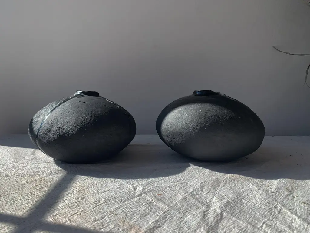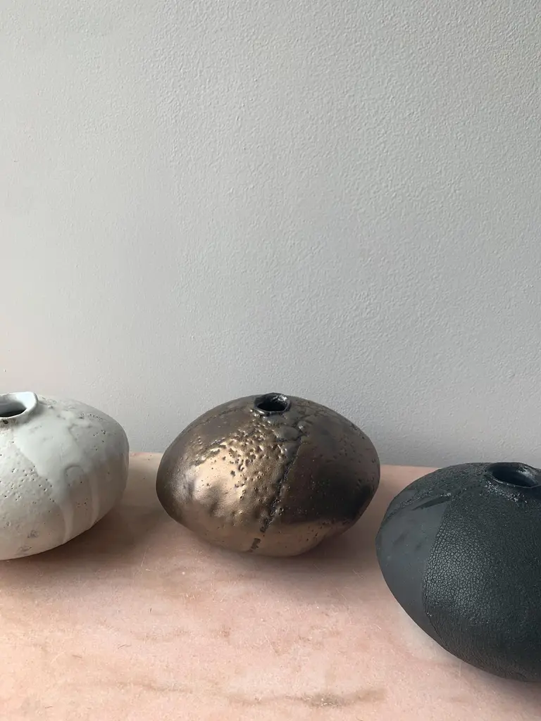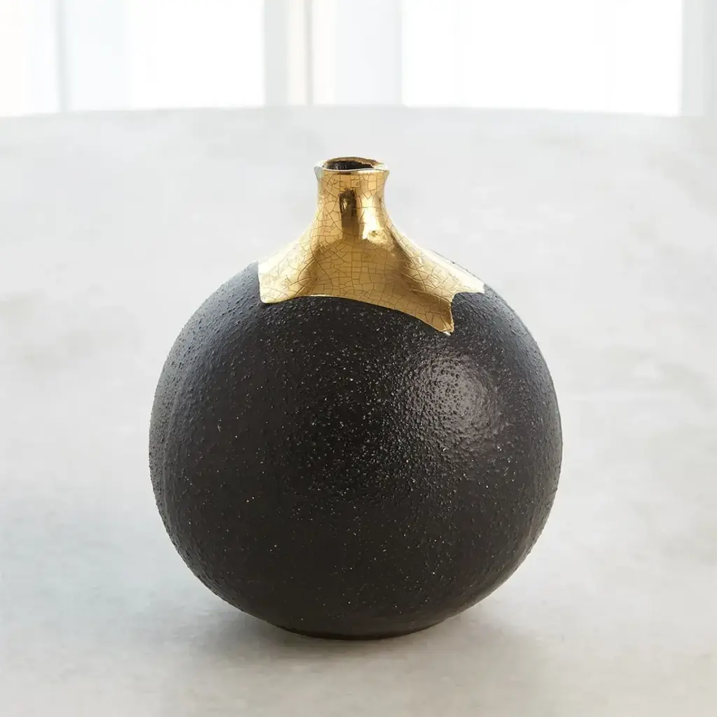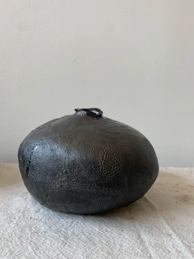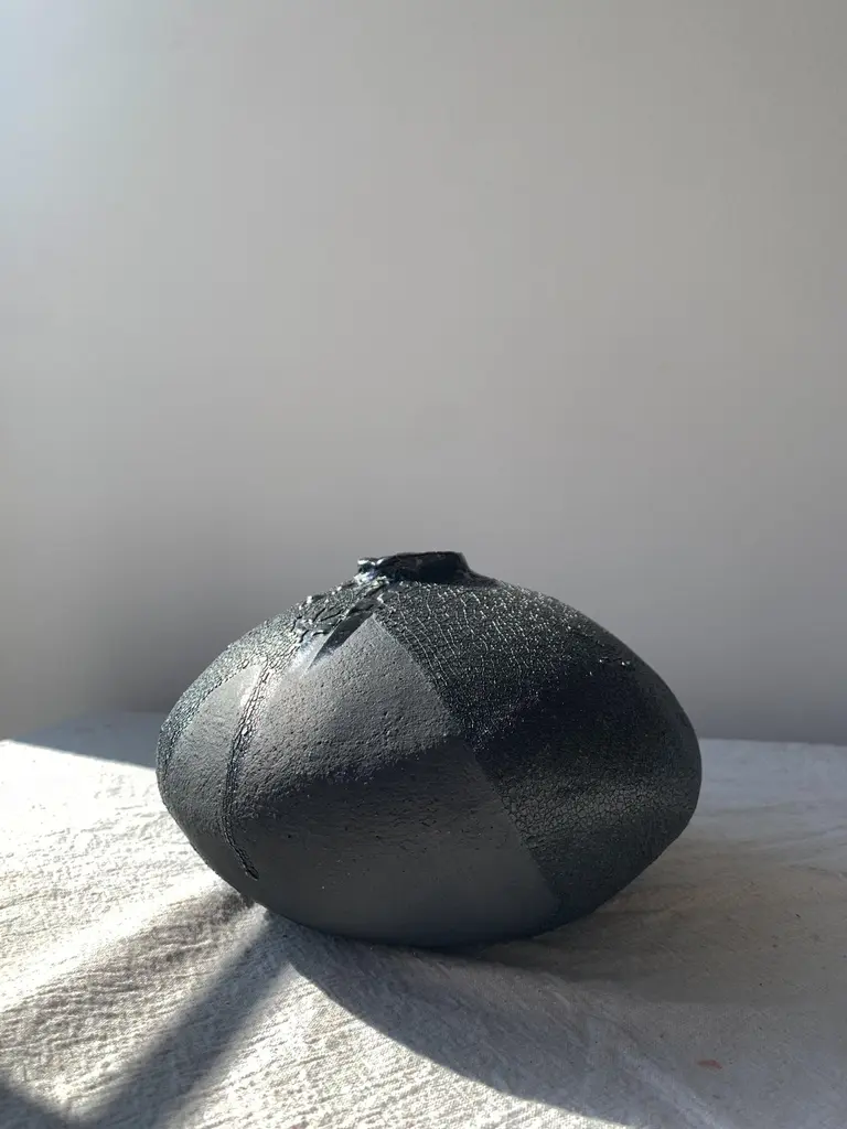 Handbuilt organic modern vase made from a groggy clay body covered in a matte black glaze with layers of glossy and crawling black glaze on top. Each vase is made by hand in our Brooklyn studio, and no two are ever exactly alike. The new moon vase is striking in its simplicity, and has an approximately 2" opening equally suited to one striking branch or a bouquet.