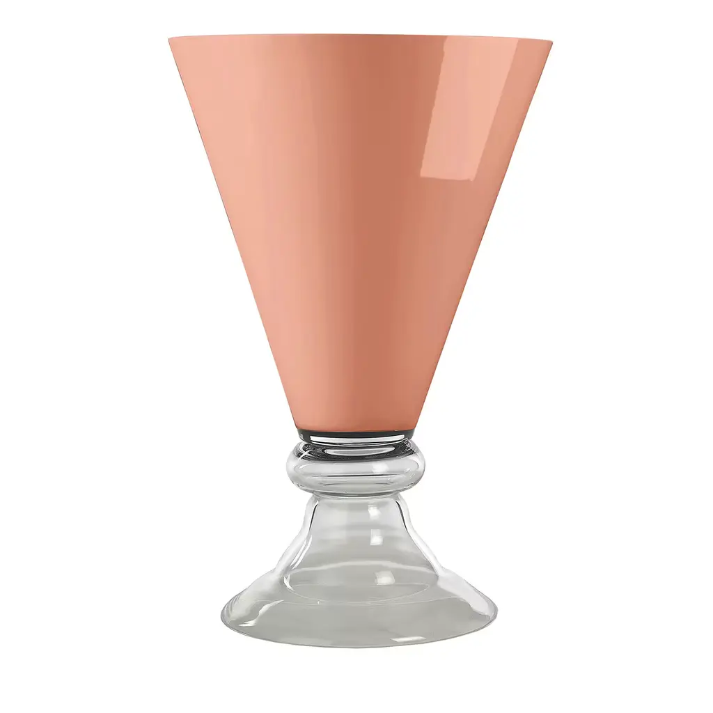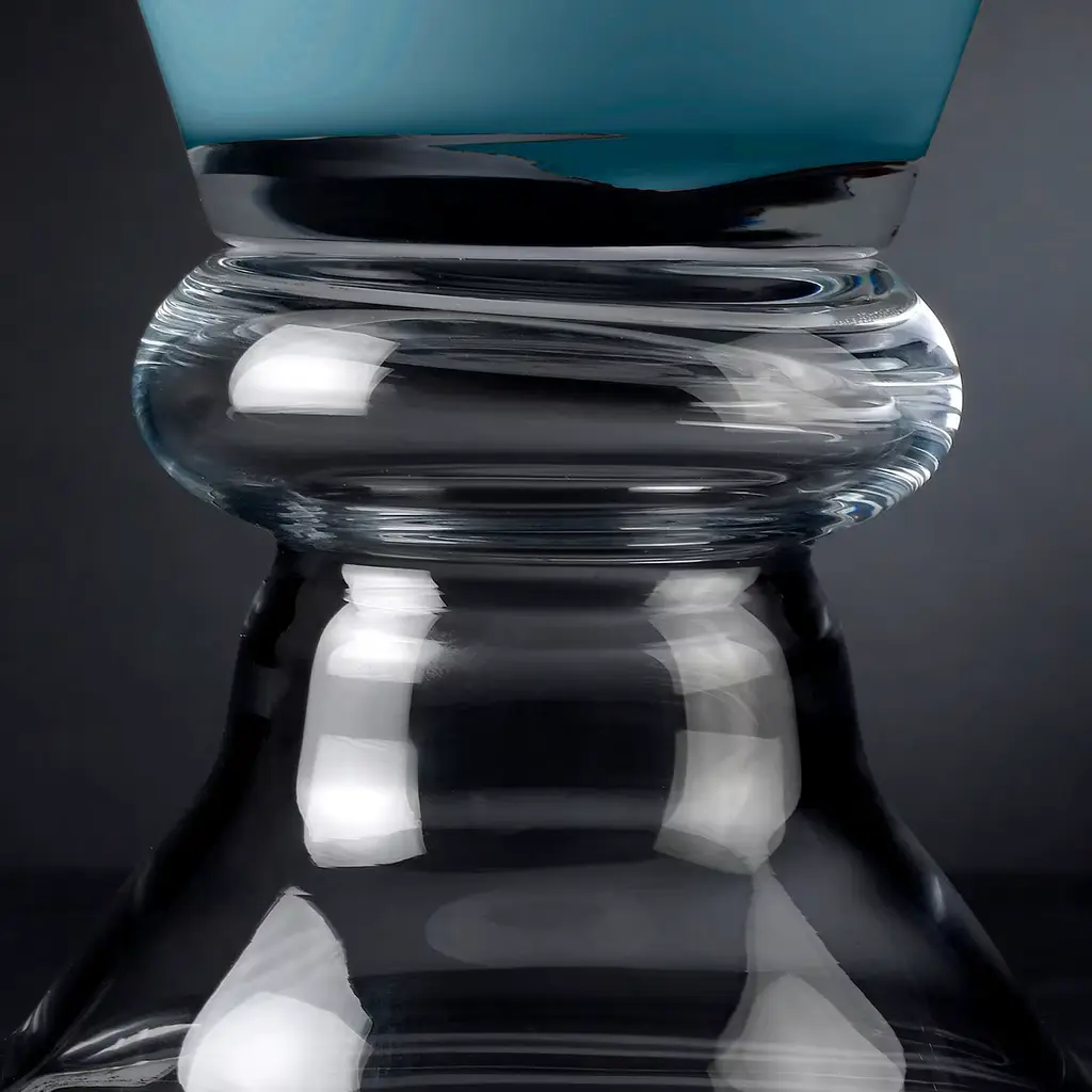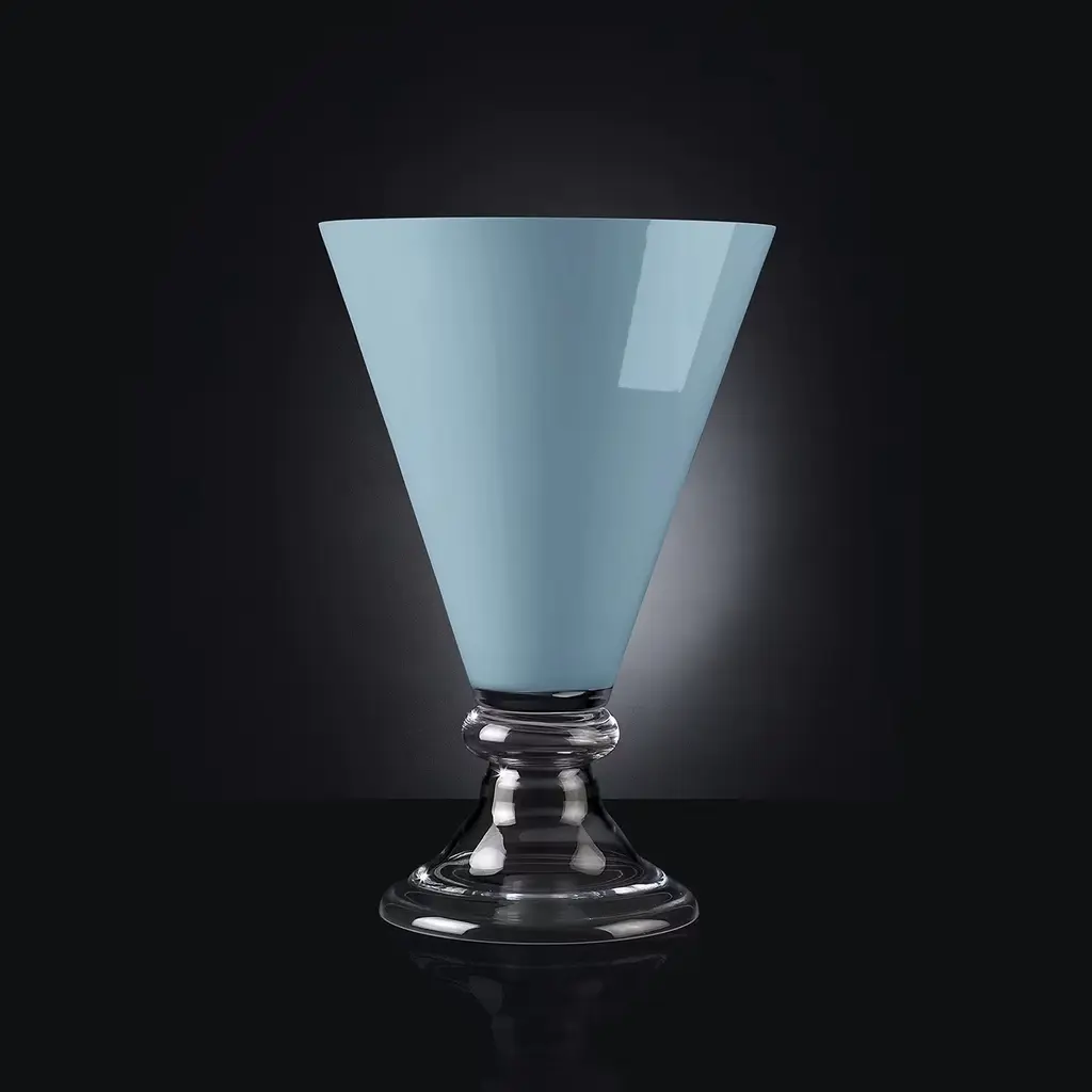 A superb interplay of clean and elegant lines and delicate, polished hues, this vase is part of a timeless and versatile series suitable for both modern or classic decors. Masterfully handcrafted by expert artisans, it features a clear glass round base, supporting a blue cone-shaped top.