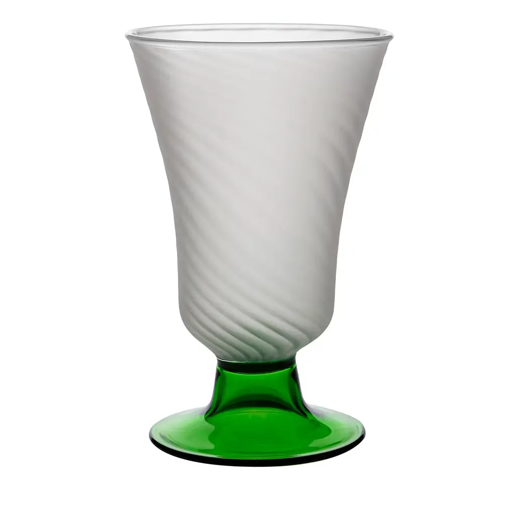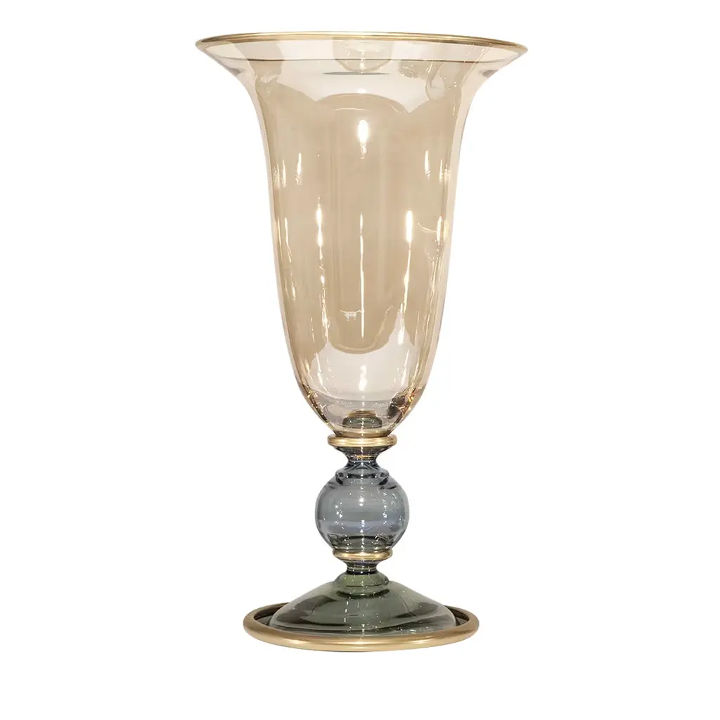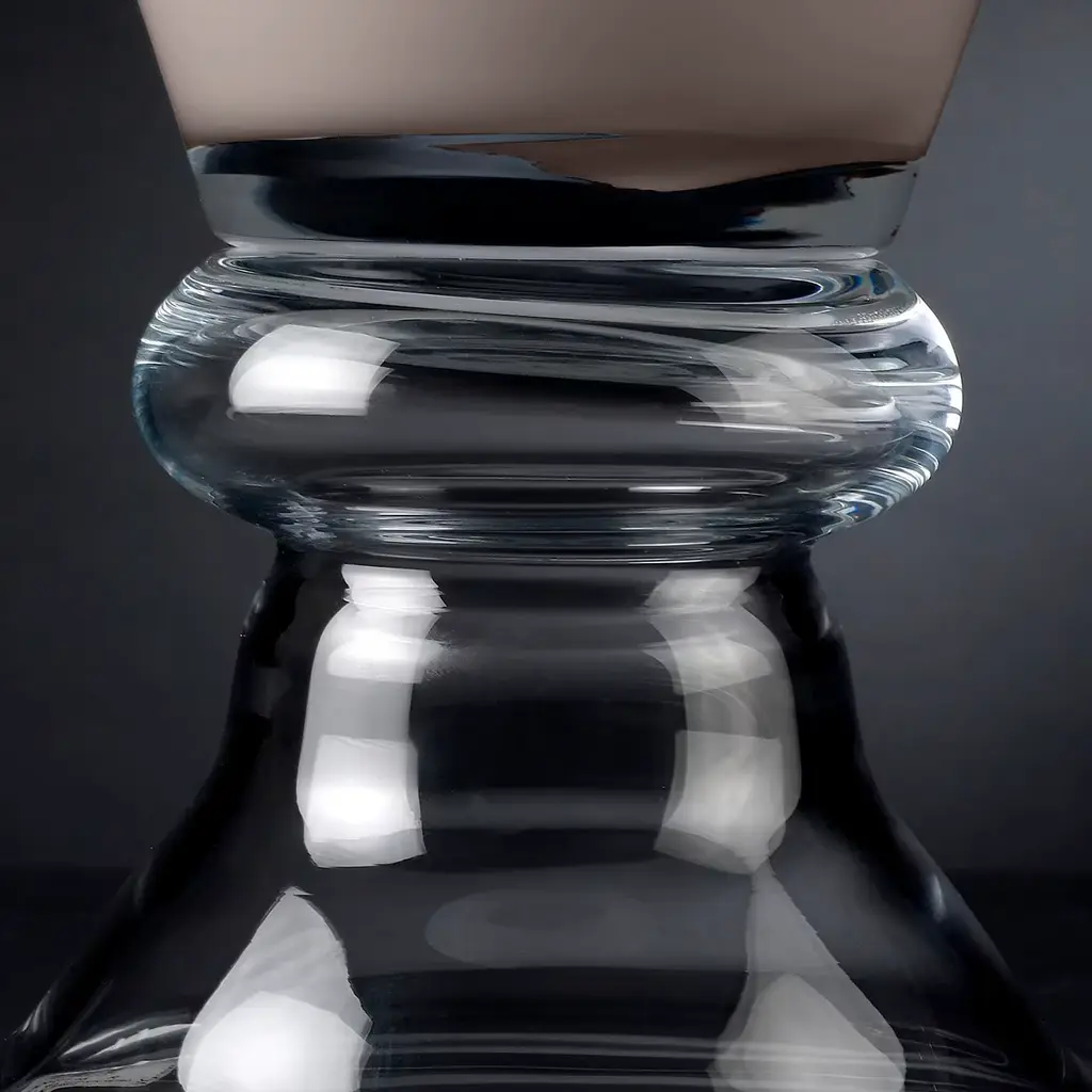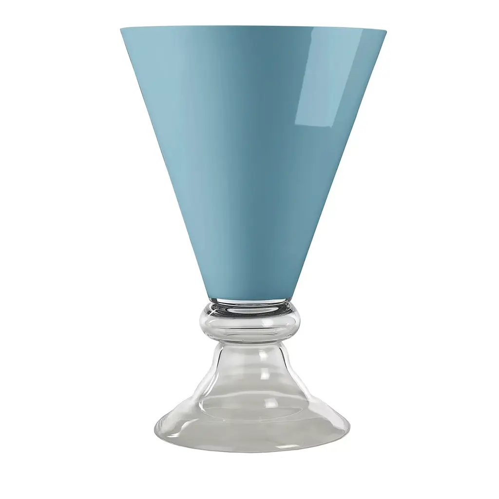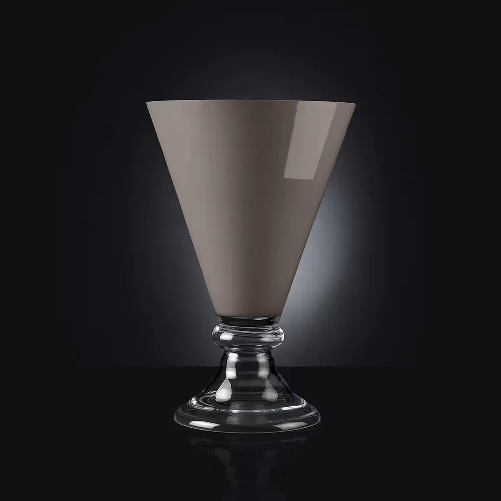 Defined by an elegant combination of clear glass and a polished dove-gray hue, this exquisite vase is ideally matched to the other colored and chalice-shaped pieces from the New Romantic Collection. This objet d'art flaunts a clean design of strong geometric value, marked by a round base supporting a cone-shaped top.