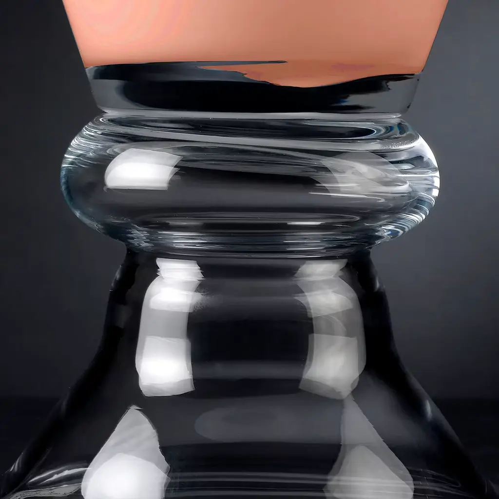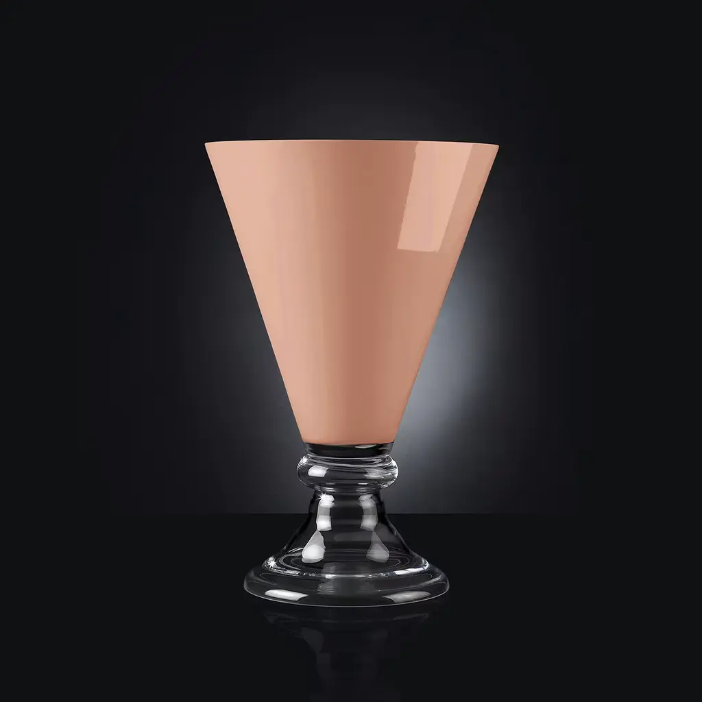 This exquisitely handcrafted vase boasts a clean silhouette composed of a slightly flared base in clear glass and a flared silhouette in cantaloupe orange glass. A striking piece of strong geometric value, it will add a lively and charming accent to both a modern or classic table arrangement.