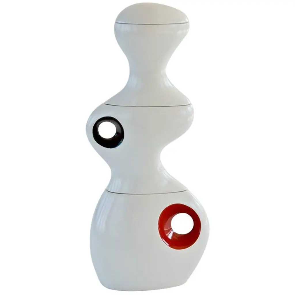 The Newson Vase, by Marc Newson, is made of white ceramic with a shiny finish. The vase is equipped with a removable lid with three holes, also making it suitable for use as a flower vase, both when covered and open.