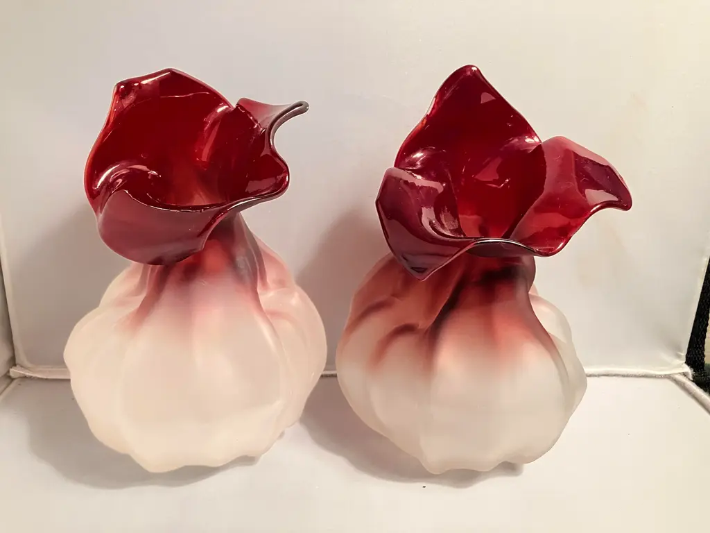 This listing is for one of the two-part art glass handkerchief vases. Both vases have a ruby glass handkerchief top which appears cinched and the glass shades to a light ruby to frosted colorless bulbous base. While difficult to read, each is signed on the bottom with a hand etched mark. The mark includes the maker’s name (Weinstein), date made (1990) and limited edition number (250/75 and 288/750). Both are in excellent condition. The vase was made at the Weinstein Studio in California. Price is for 1 vase.