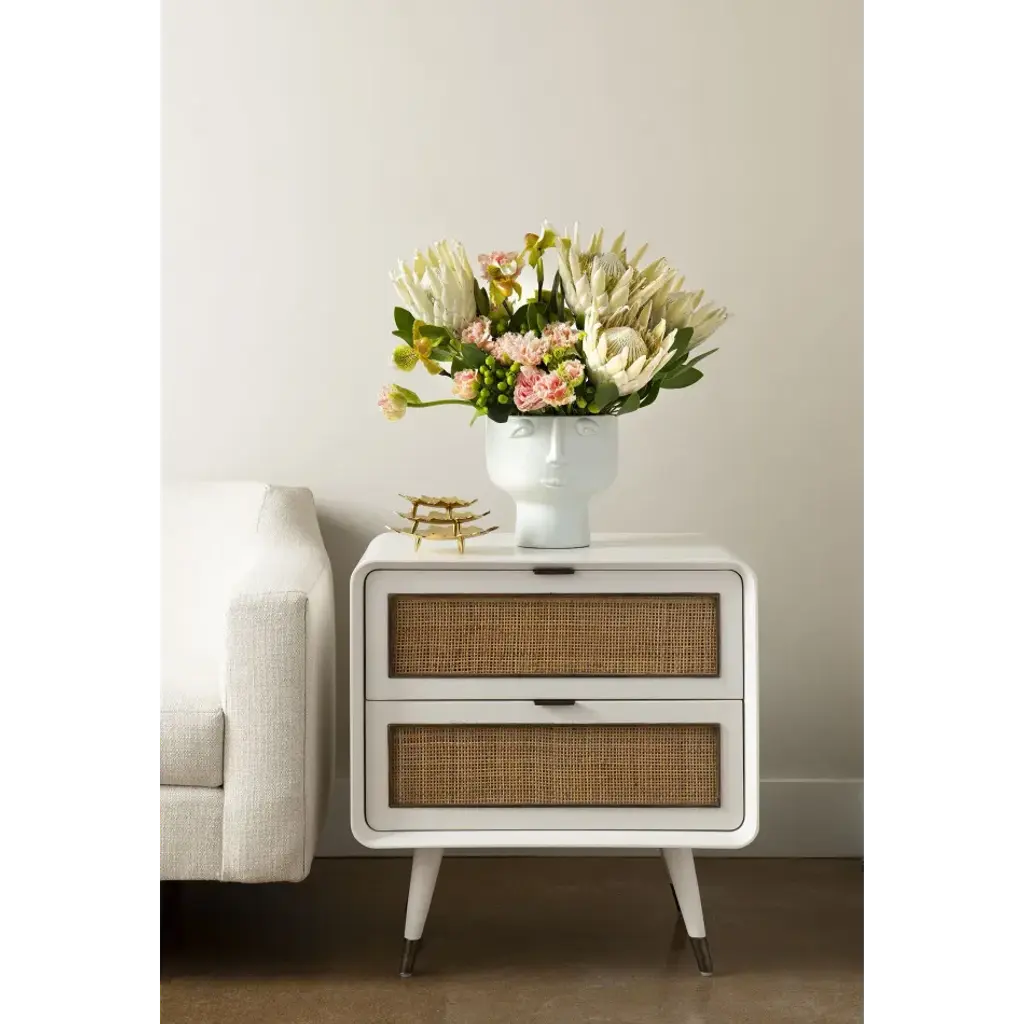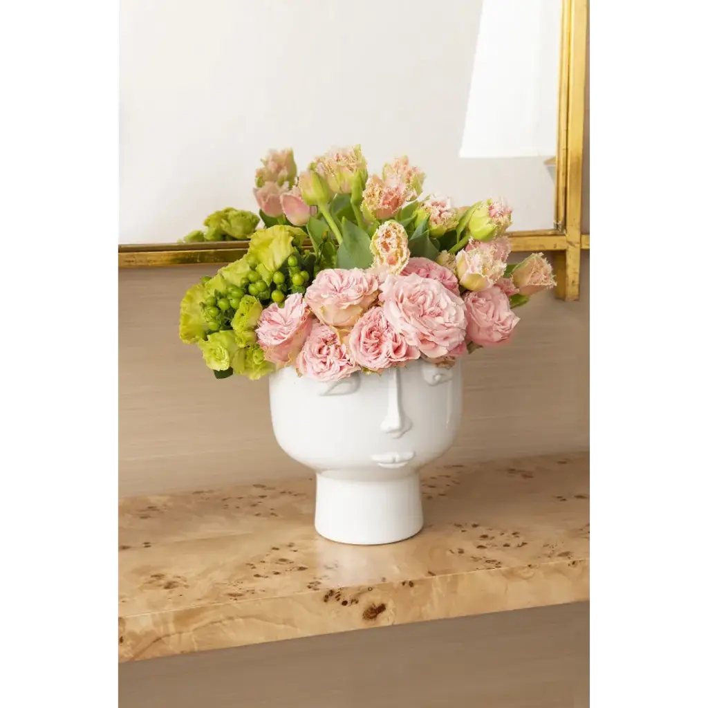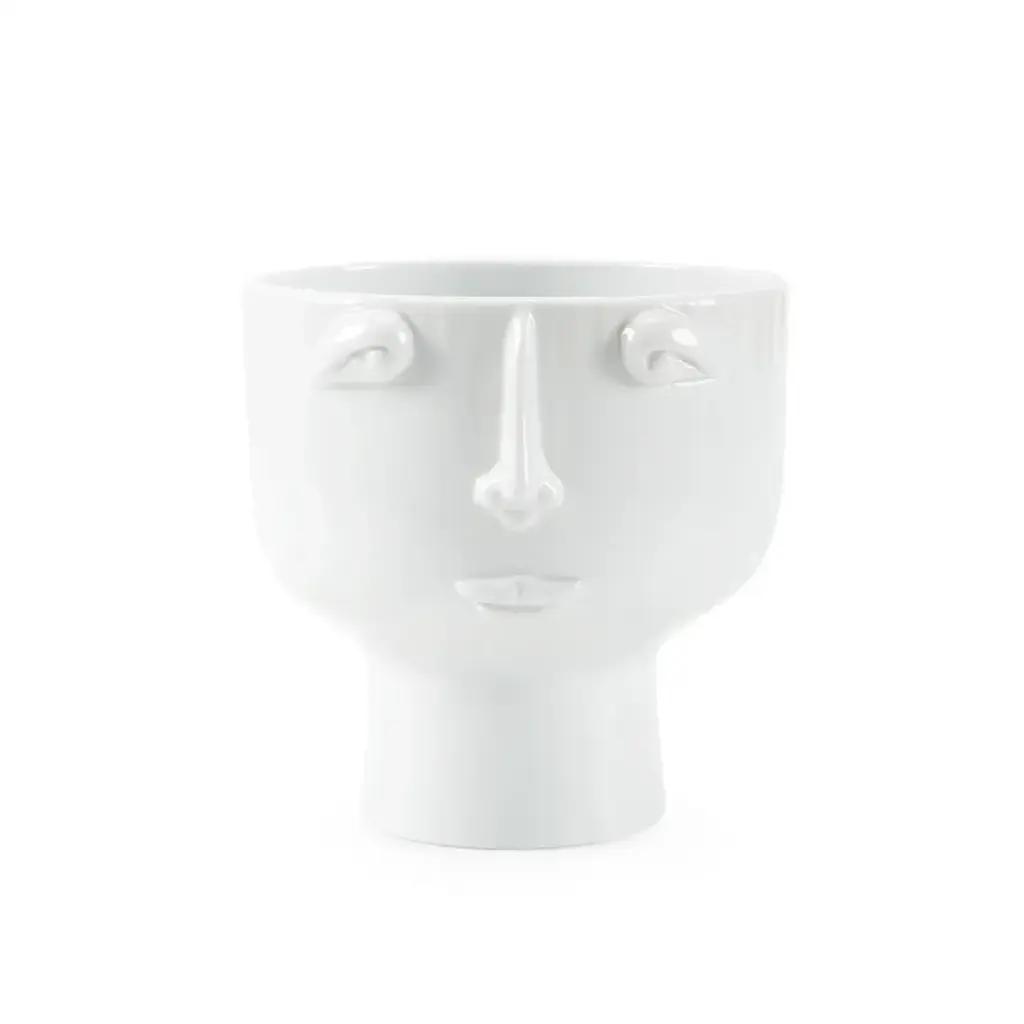 For playful and modern tastes, the Nico Vase is a must. Crafted from fine porcelain with a lightly glazed finish, the vase is a surrealist embodiment of a face, boasting striking features, including a nose, eyes, and mouth. The whimsical details come together to communicate a bright and joyous expression. It tapers down into a thinner base, perfectly resembling a neck. While the Nico certainly has enough personality for displaying solo, it turns into a truly fabulous masterpiece when filled with a bouquet—think of it as giving it a new floral hairstyle each time you switch it up.