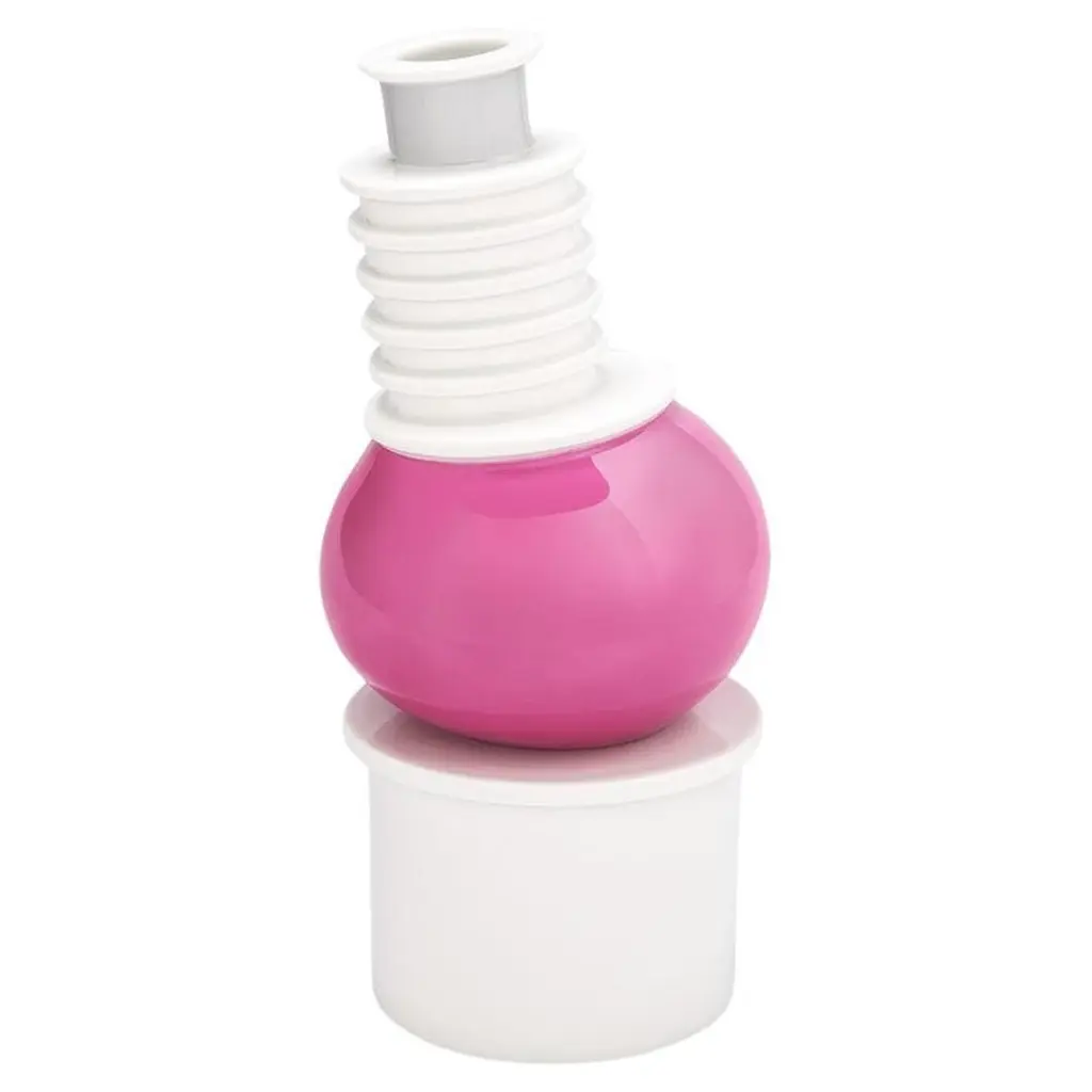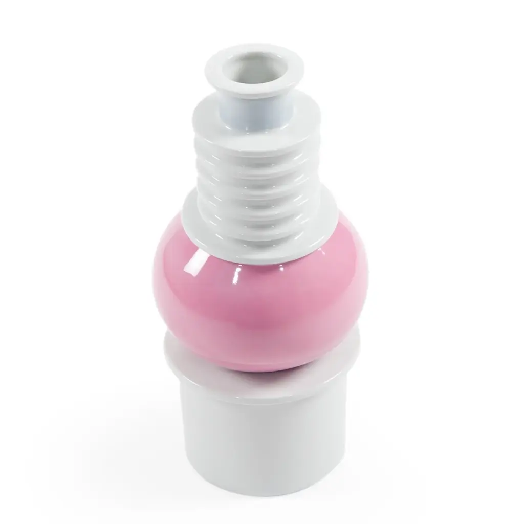This superb decorative object was designed in 1983 by Ettore Sottsass and crafted of porcelain. A cylindrical base with a flared mouth supports a spherical pink element on which rest a ridged mouth at a slight angle. The result is charming and eye-catching, making this vase a stunning sculptural addition to a contemporary interior, either alone or combined with the other two designs of the same series, celebrating the large rivers cradles of ancient civilizations, Euphrates and Tigris.
