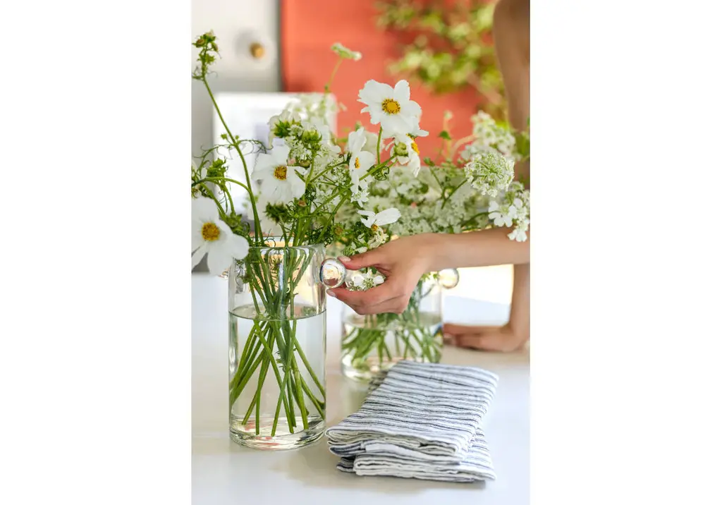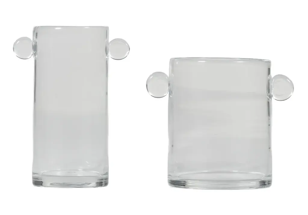 Handblown by skilled artisans, the Nodo Vases, one tall, one low, bring a sculptural elegance to any space. Crafted from clear, weighty glass with softly rounded handles, they're perfect for branches or blooms, but just as striking filled with collected treasures, sand, shells, stones. Whatever you place inside, these vessels turn the ordinary into art.