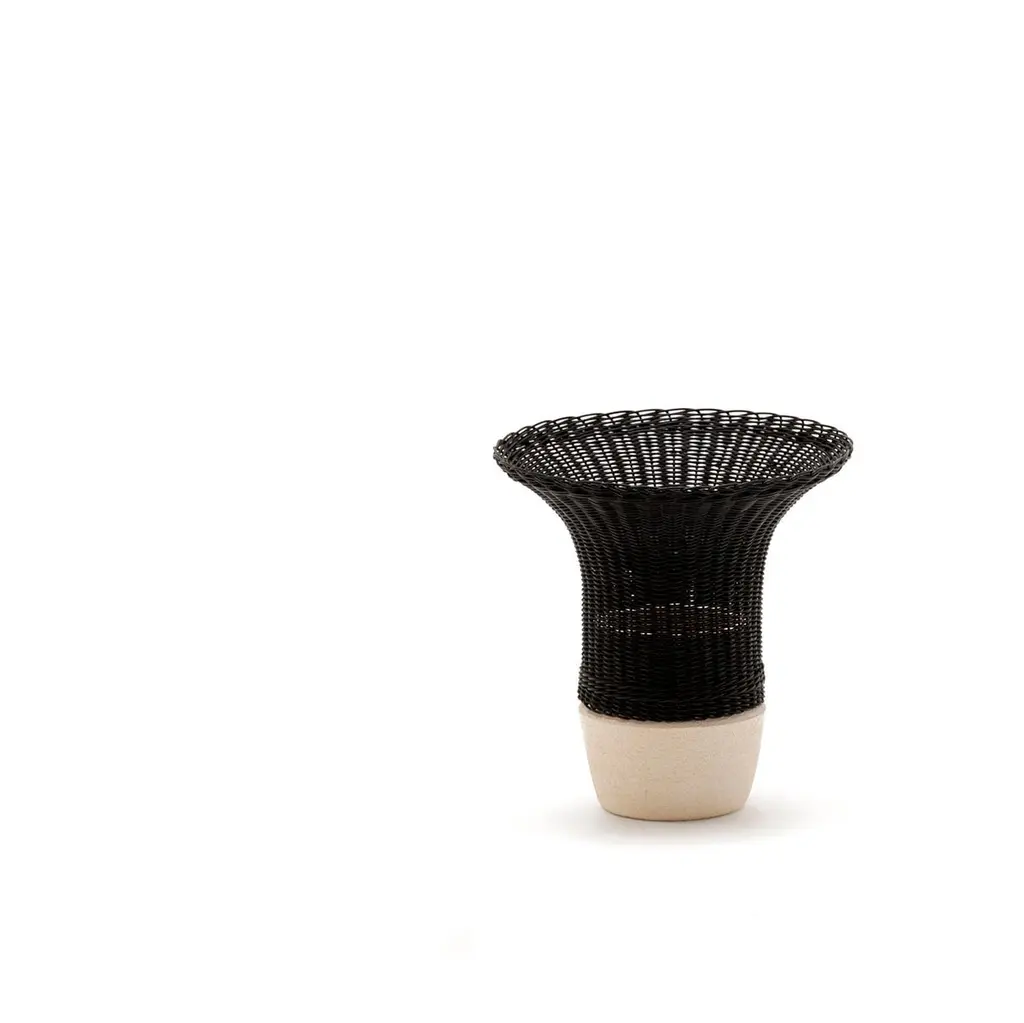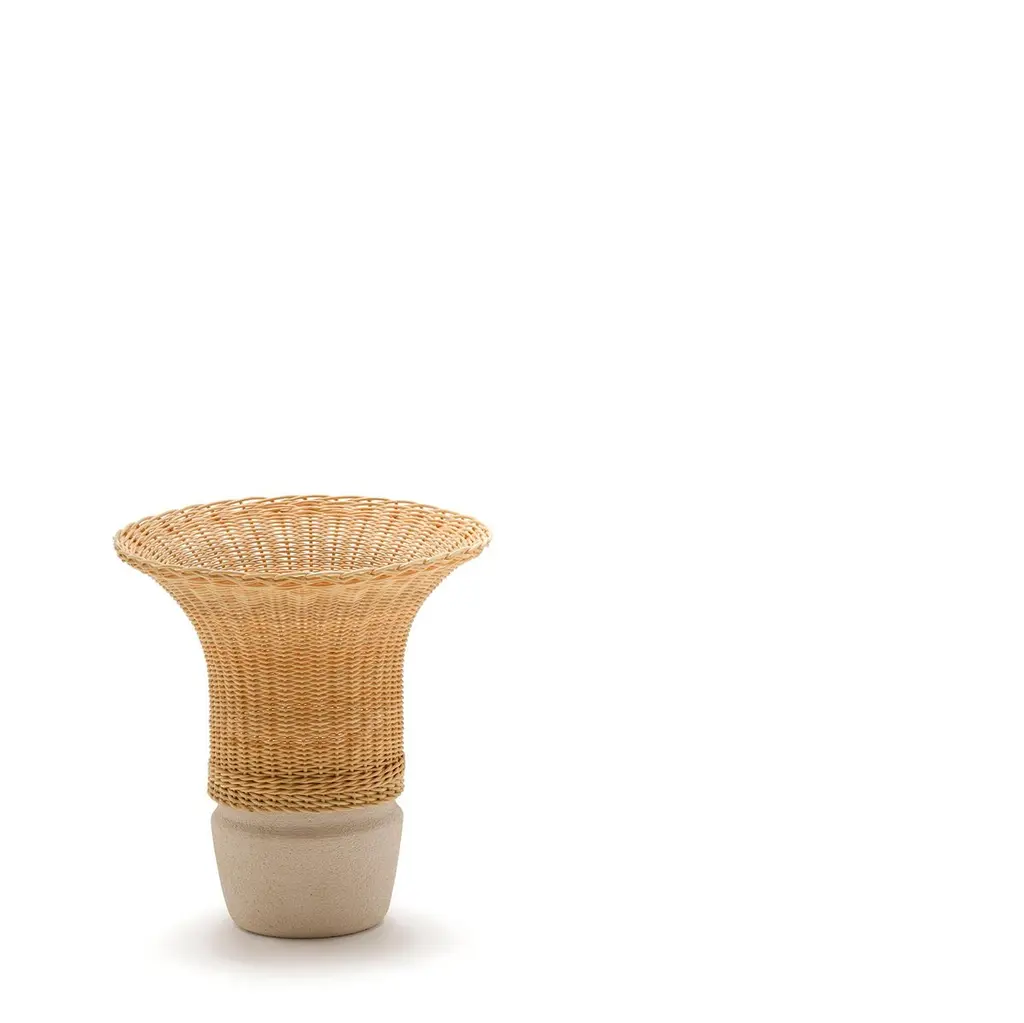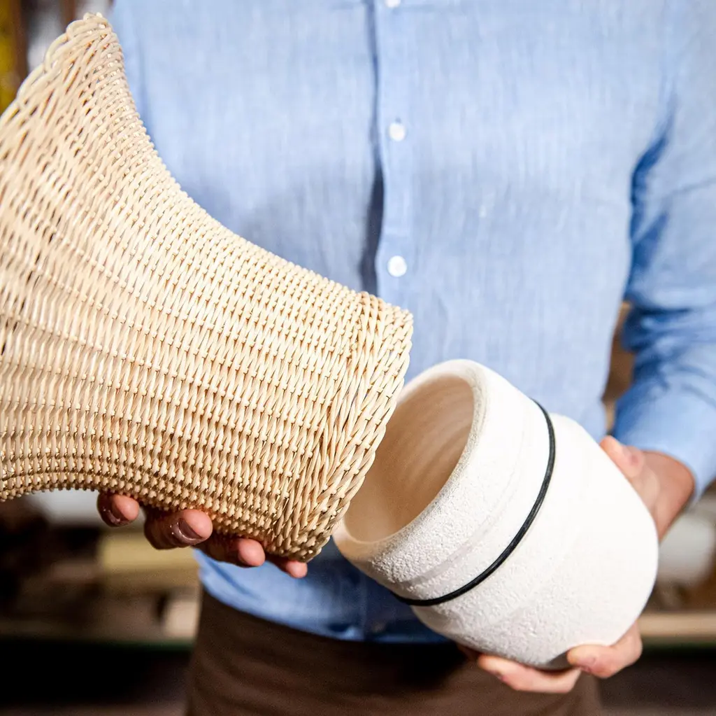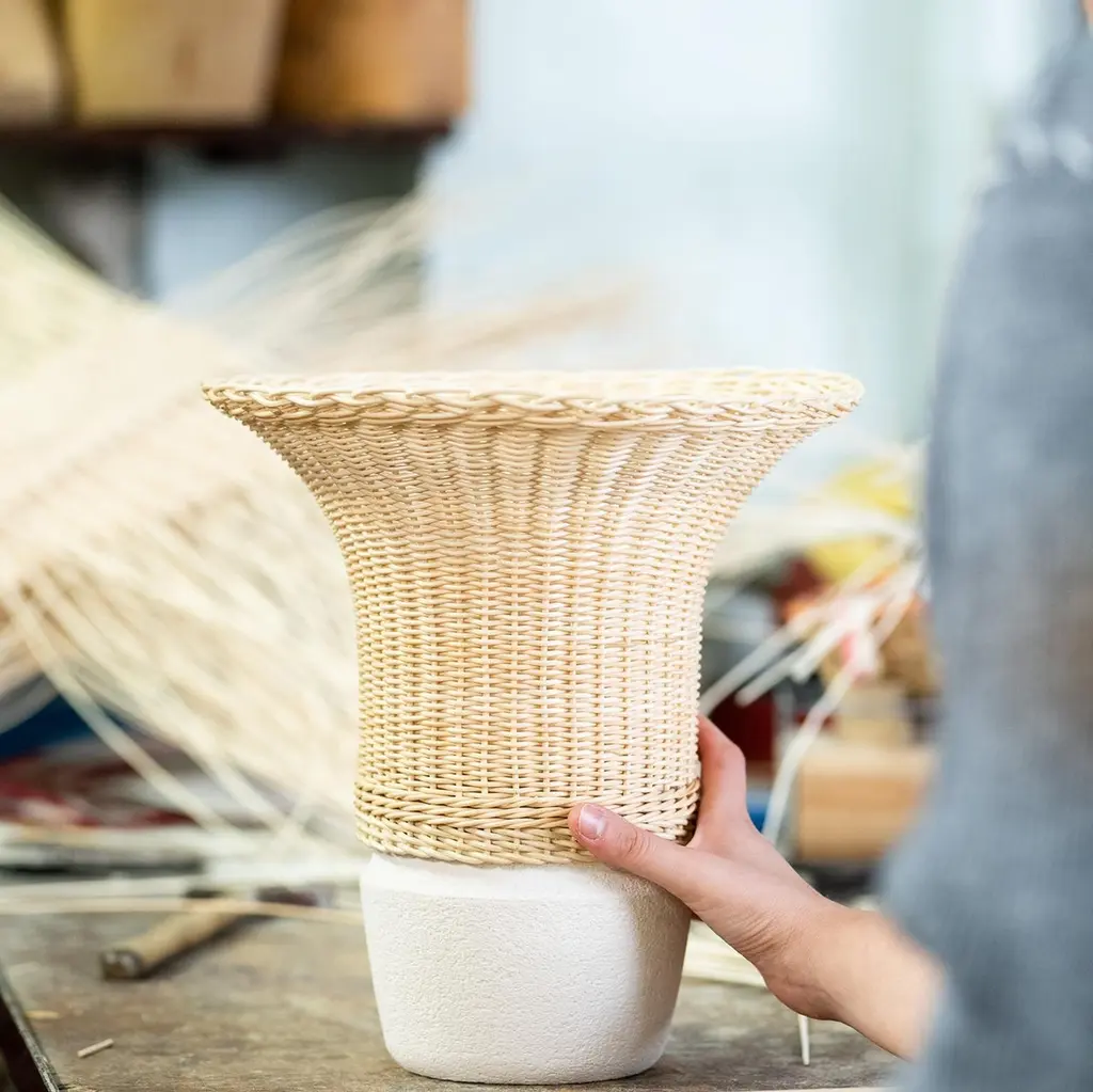 NodoThat’s item is the result of Bottega Intreccio Lab experimentation as atelier research which is grounded within in the territory, with its different arts and crafts competences. Bottega Intreccio relies on the experience of local craft workshops and on synergies with neighboring production districts. The firm acts as a catalyst of knowledge and experimentation for new weavers, but also for combinations of different materials and processes.“A solid form that, thanks to the juxtaposition of ceramic and wicker becomes lighter and more open towards the top. Two traditional materials that compensate for each other, interpenetrating and becoming contemporary.”A series of wicker vases, woven to wrap the white ceramic base and to create a rhythm of solids and voids. The use of ceramic material allows the vase to contain water for the flowers, and to be easily cleaned after use. A woven wicker band completes the base, which extends in a soft, harmonious form.Use and maintenanceAll the items are made with raw materials and are guaranteed for interiors.If it is necessary, they can also be installed outdoors as long as they aresufficiently protected from atmospheric agents and not directly exposedto the sunlight or water, in spaces like verandas, gazebos,arcades or protected spaces.The raw materials used for weavings could be not extremelyhomogeneous due to different physical properties and the items couldhave dimensions a bit different from descriptions listed in this document.The colors could change for the same reasons. Those features arethe demonstration of authenticity of each product that is unique andhandcrafted in Italy by Mogliano’s masters.Woven wicker is extremely resistant over the years, if it is stored in a dryplace and without excessive temperature changes, and it could also change coloror nuances due to its sunlight exposure based-on nature. The weavingby the craftsman is performed with soft and wet material, andthe material dries naturally with the passage of time losing its elasticity.For this reason, avoid excessive pressures, overloads of heavy weights or impacts.The bases or wooden parts are entirely in solid wood: with the aging they could change in size and present natural micro-cracks. Avoid direct and long exposureto the sun, completely avoid wetting.About the lamp usage, in normal condition the items don’t require special maintenance.TechnicalsAbout item technical details and bulbs specifications, pleaserefer to the technical data sheets.CleaningUse a soft cloth for cleaning. Don’t use any chemicals, acids, scourers or steel brushes.The base in natural wood must be cleaned and dusted using a soft cloth,even slightly damp. Immediately wipe again with a soft, dry cloth.For lamps cleaning, unplug the appliance from electric power before to proceed.Never immerse the device in water. Wicker is a natural material, so cleaning the wickerlampshade don’t get it wet nor use chemicals. Use compressed air to remove dust.