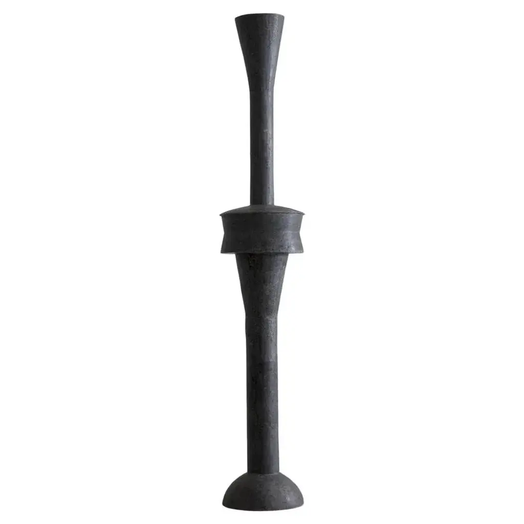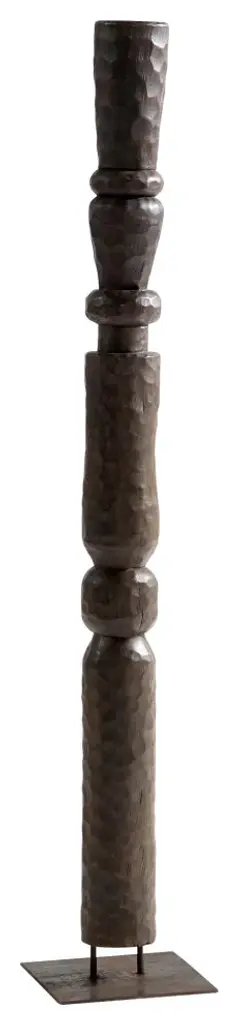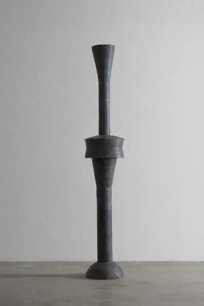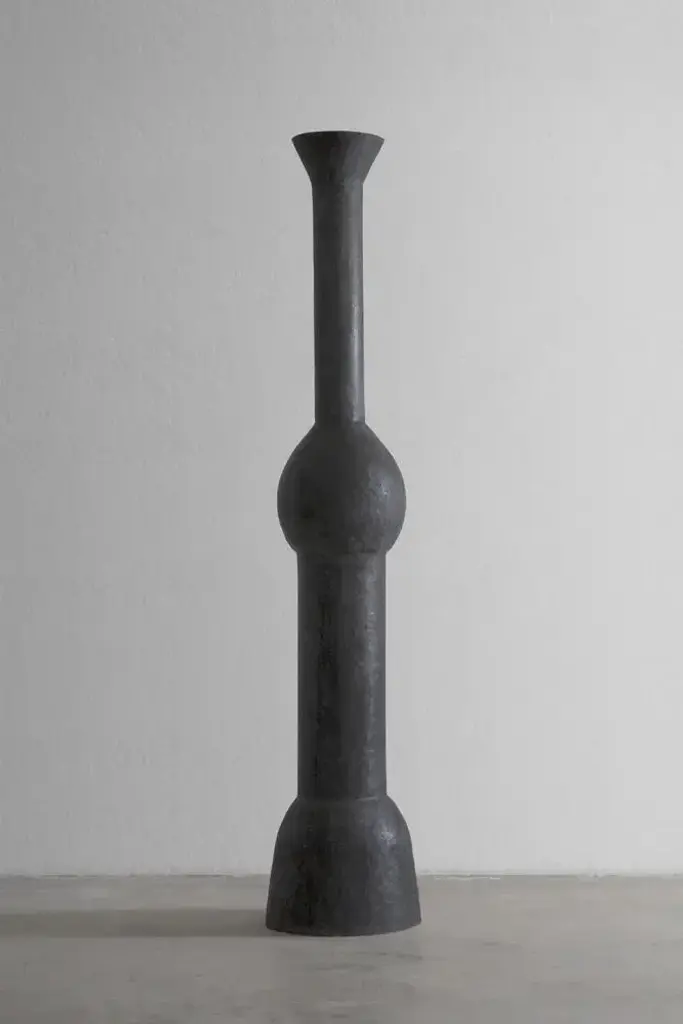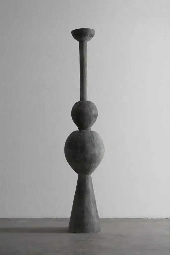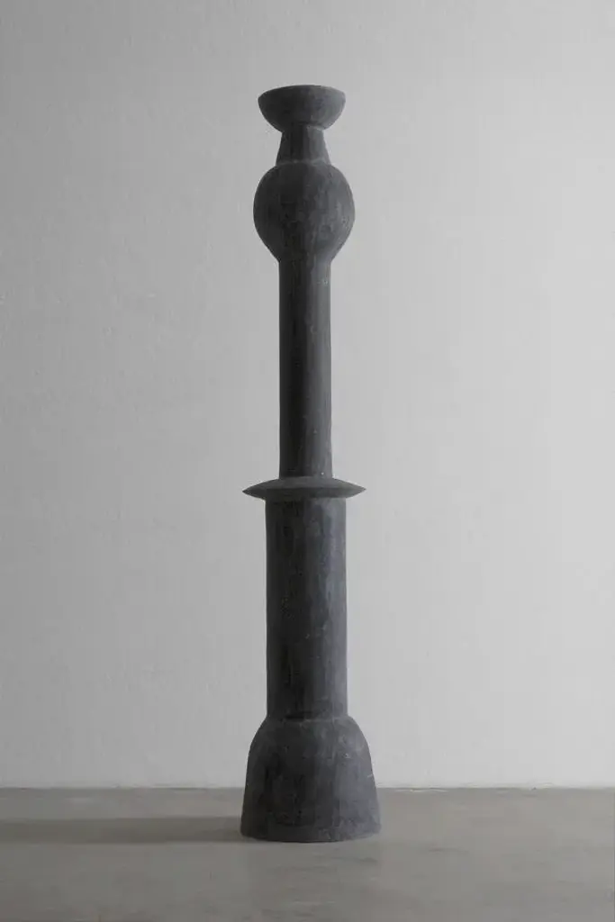 Nok 07 vase by imperfettolab dimensions: d40x w40 x h220 cm materials: fiberglass. Also available in different models. Please contact us. A collection of ornamental vases of enigmatic charm. Different geometric shapes that follow each other, as in an imaginary climb to the sky. A combination of juxtapositions and contrasts on significant heights which gives the eye a feeling of perfect and solid balance. Arranged side by side, these elements enrich the environment with ancestral magic. They are reminiscent of rows of ancient warriors lining up, calm and fearless, preparing for the dance that preludes battle.