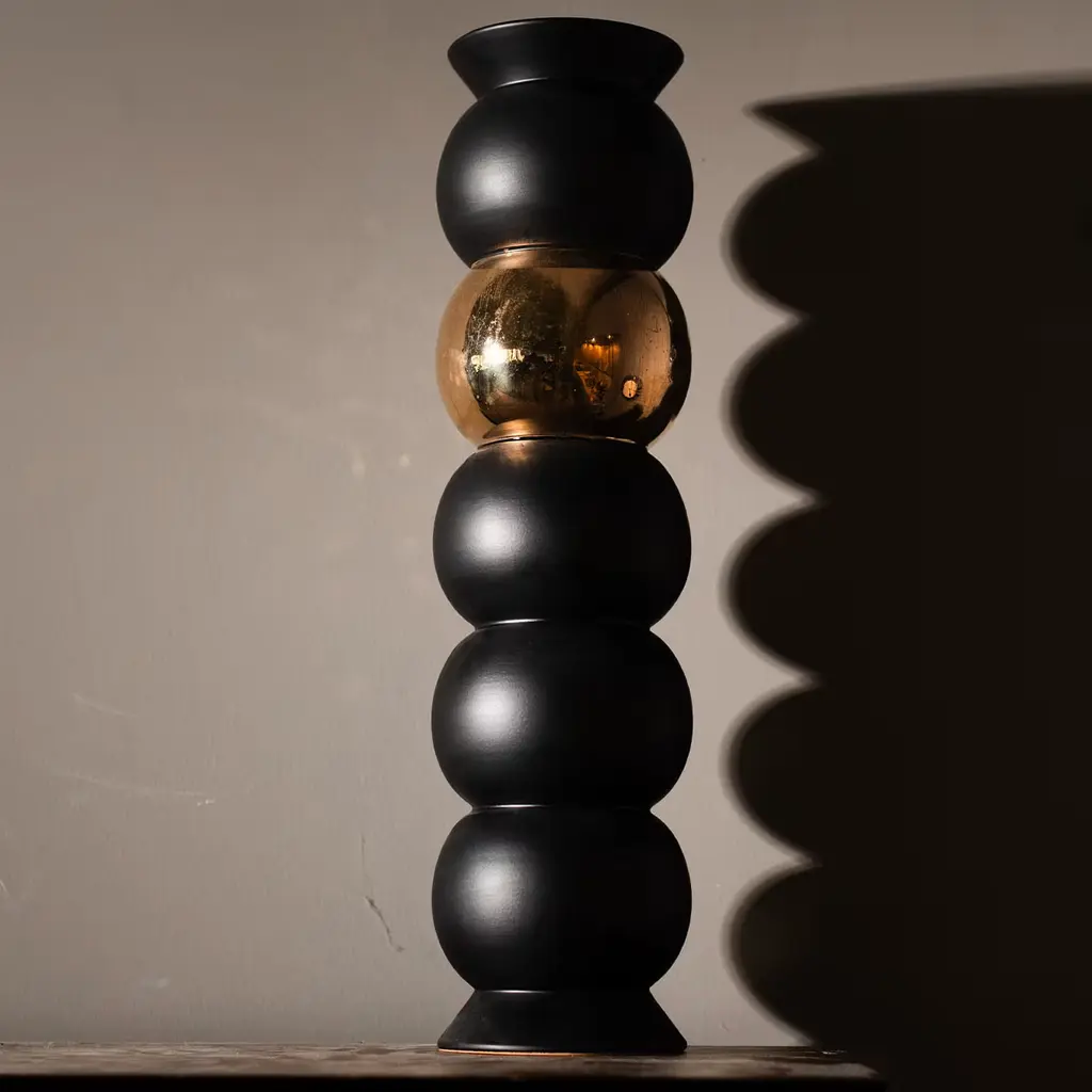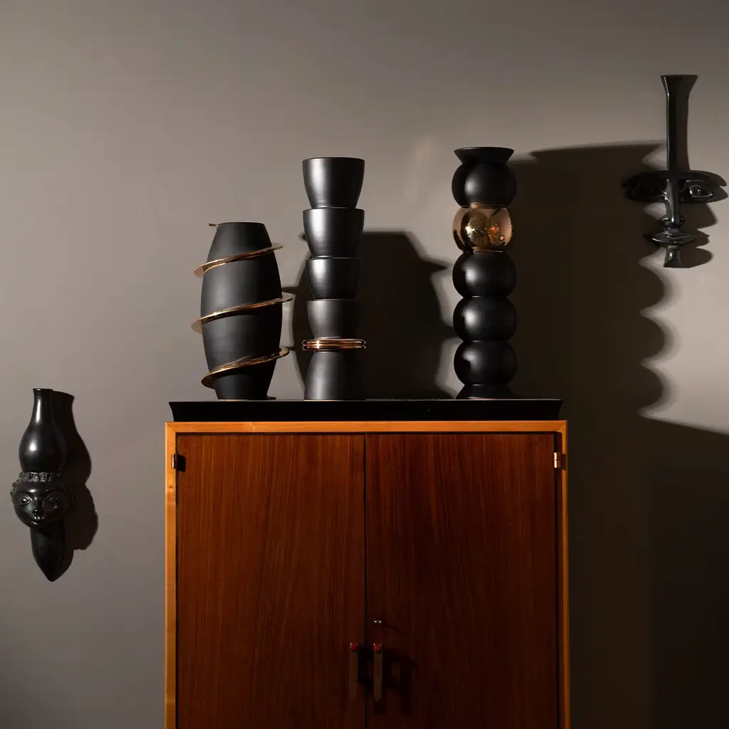 Classic terracotta glazes dance in a sensual rhythm, where the charm of the unexpected emerges. This large handmade clay vase features a matte black glaze and golden accents. Designed by Ugo La Pietra.