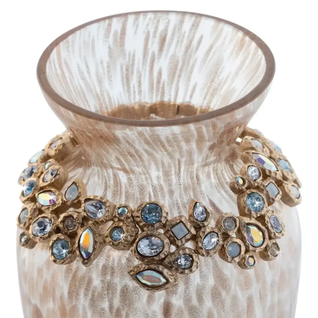 A golden wreath of opal Swarovski crystals crowns this striking hand-blown glass vase. Crystal-clear and shimmering champagne glass swirl together with one-of-a-kind results. Each individual vase its own unique handmade work of art, ready to showcase fresh blooms or to be displayed as an elegant and eye-catching addition to any decor.