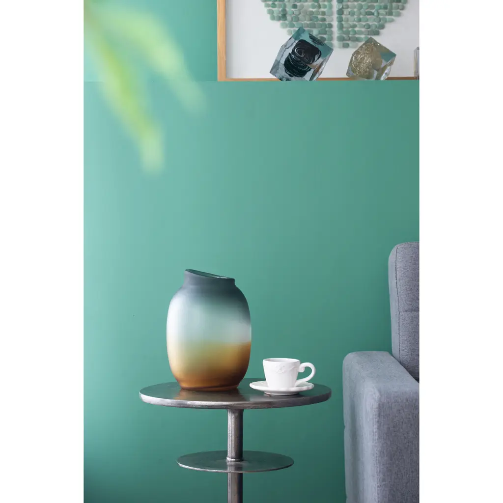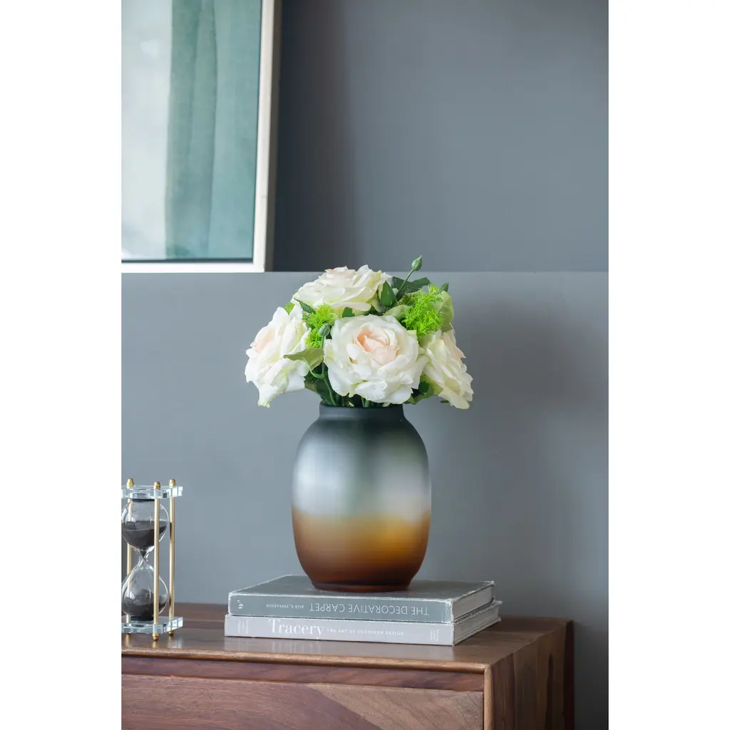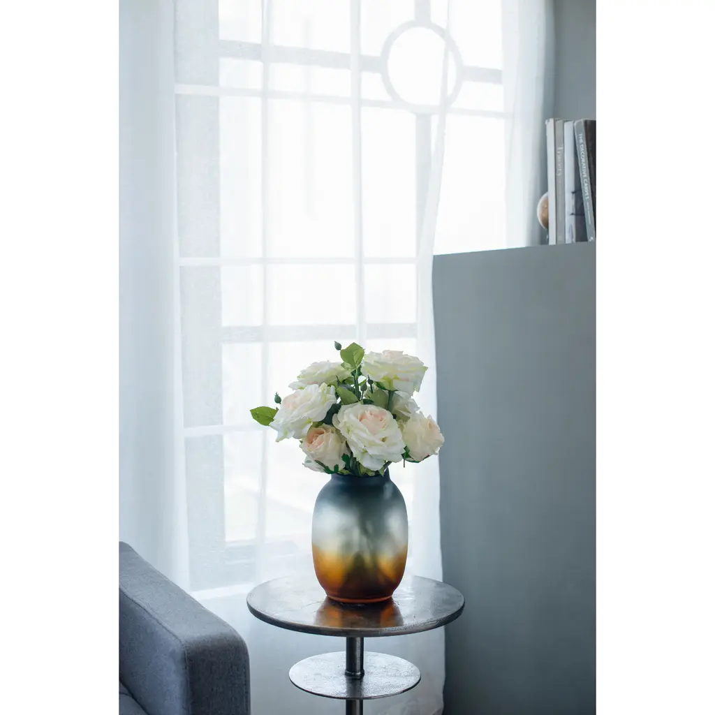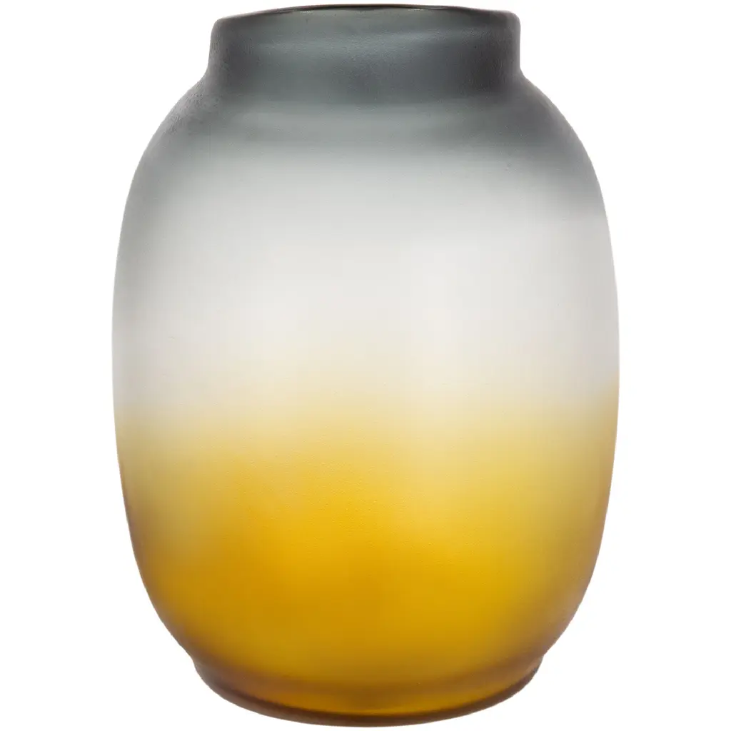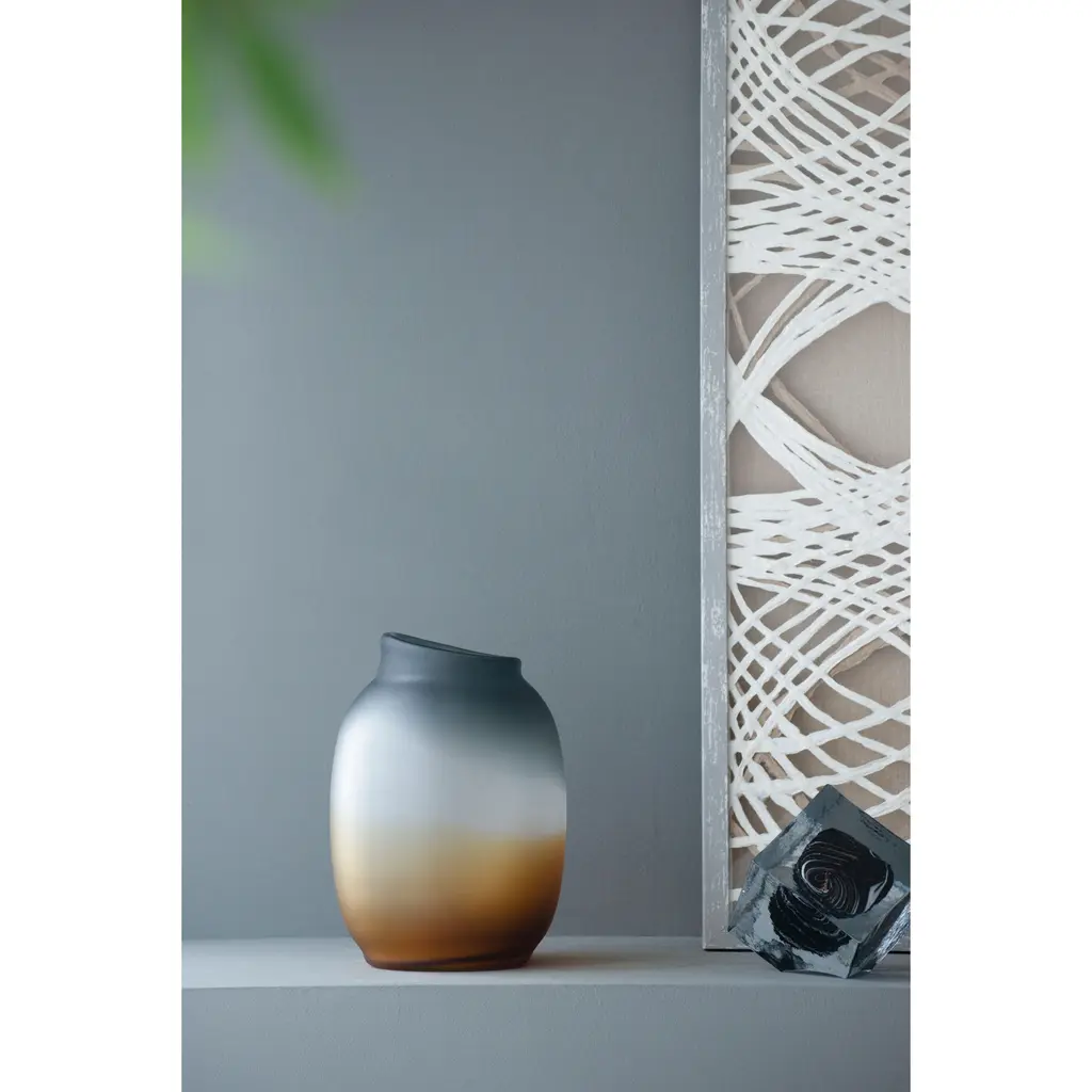 Display the Normand handcrafted glass vase in your transitional design to bring an eye catching accent to the room. The soft silhouette of the vase helps to accentuate the detailing of the vase along with the fading of the orange base to the black opening. Displayed empty or filled with soft florals, the Normand vase collection brings in a new design element to your store.