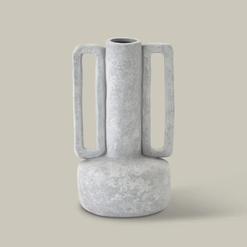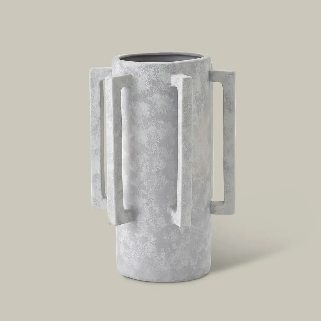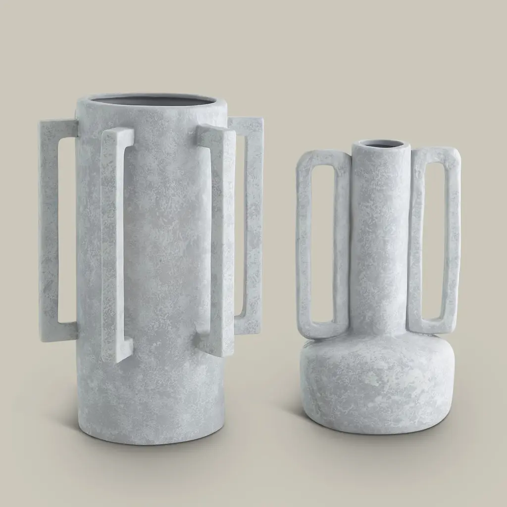 The Normandie and Bretagne Vases showcase a unique and modern design that effortlessly blends functionality with artistic beauty. The vases feature multiple square-shaped handles, adding a geometric and sculptural element to its overall aesthetic. With its sleek silhouette and impeccable craftsmanship, these vases becomes a captivating centerpiece, elevating any floral arrangement or standing alone as a contemporary work of art. Available in three washed finishes - light grey, dark grey, or natural. Hand-wash. Product is Watertight.