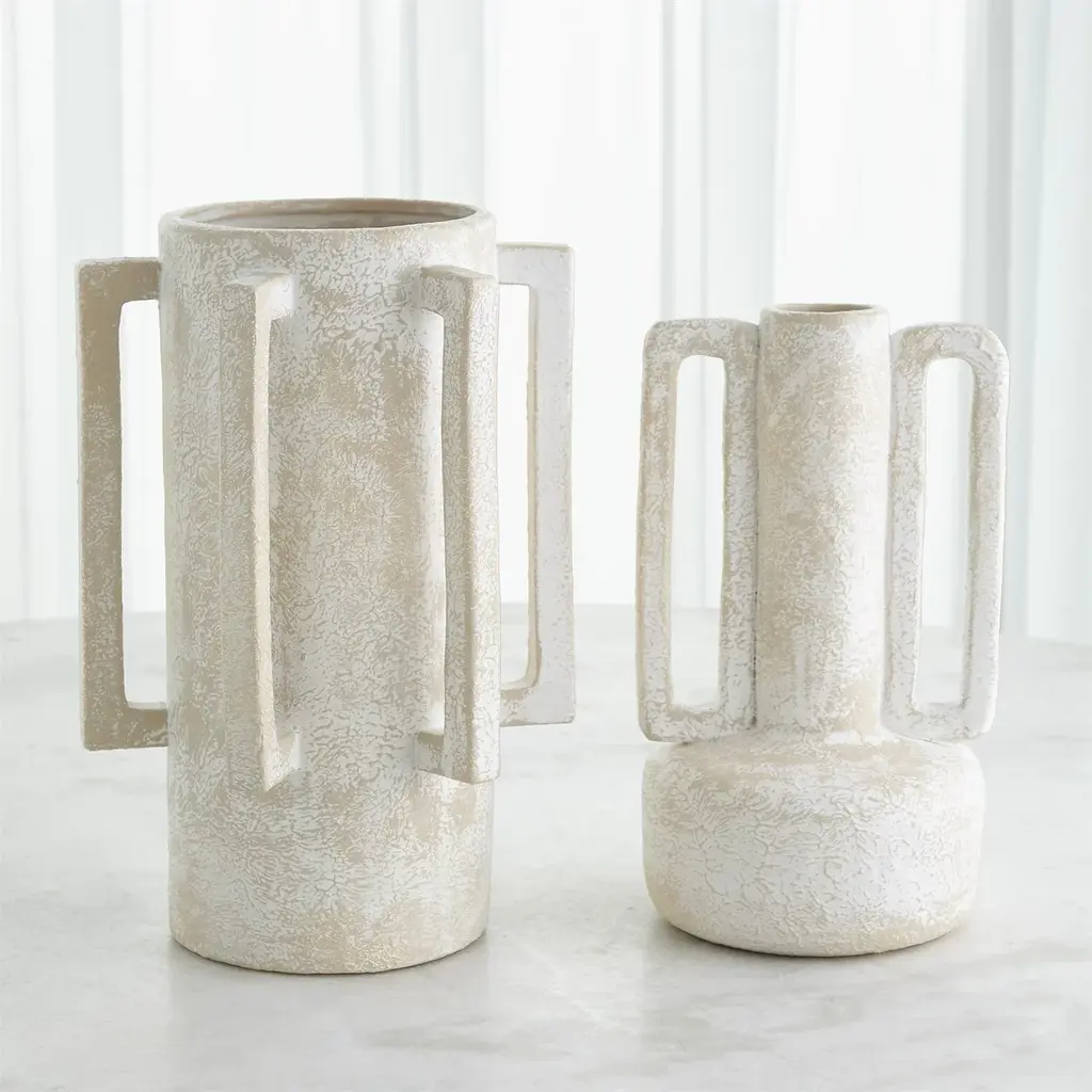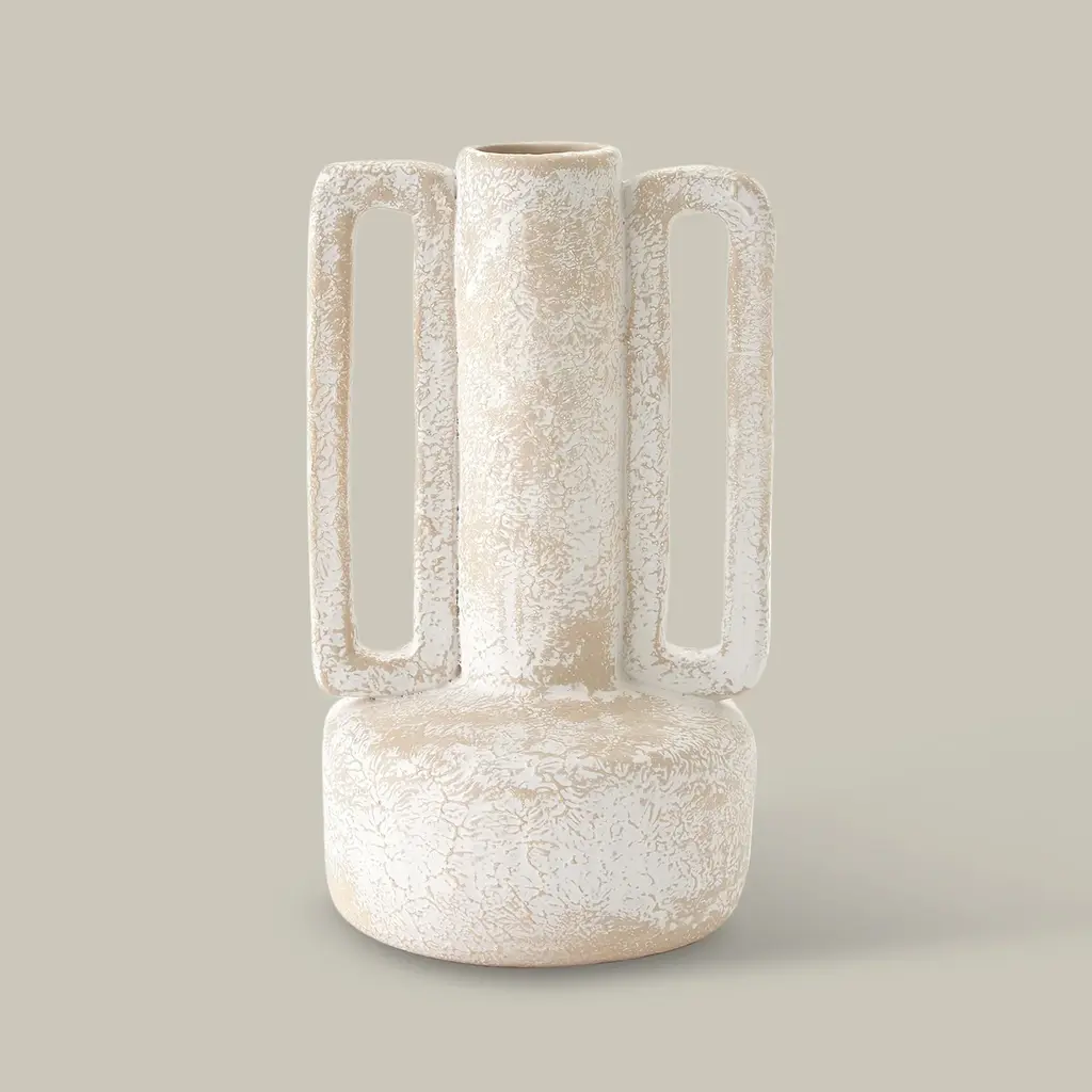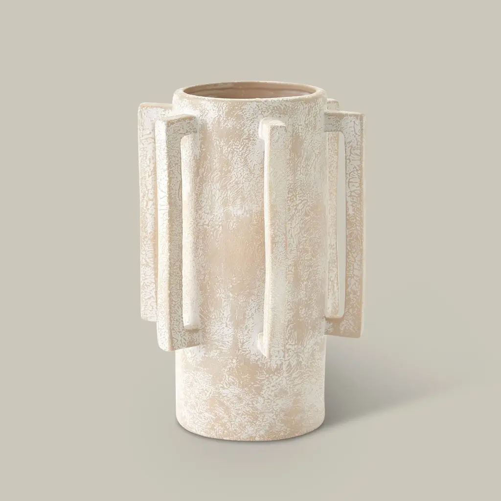 The Normandie and Bretagne Vases showcase a unique and modern design that effortlessly blends functionality with artistic beauty. The vases feature multiple square-shaped handles, adding a geometric and sculptural element to its overall aesthetic. With its sleek silhouette and impeccable craftsmanship, these vases becomes a captivating centerpiece, elevating any floral arrangement or standing alone as a contemporary work of art. Available in three washed finishes - light grey, dark grey, or natural. Hand-wash. Product is Watertight.