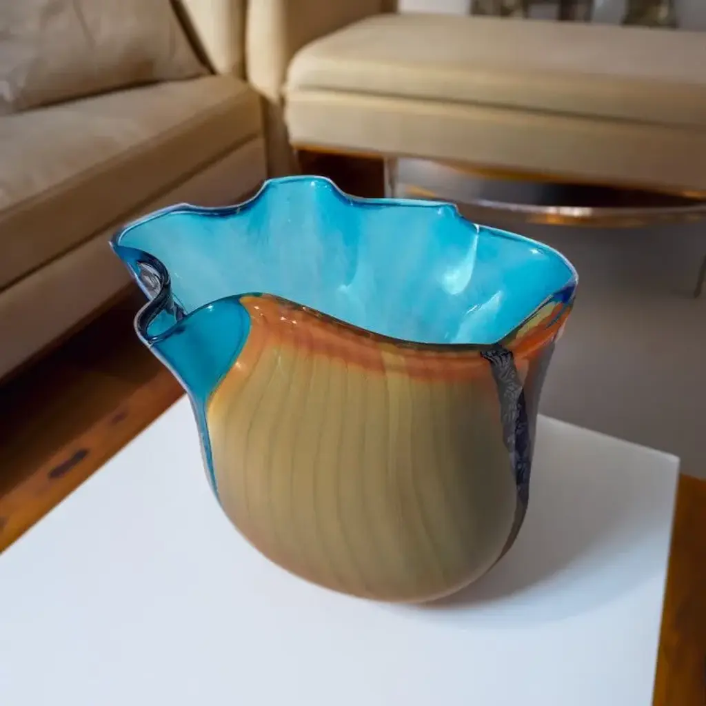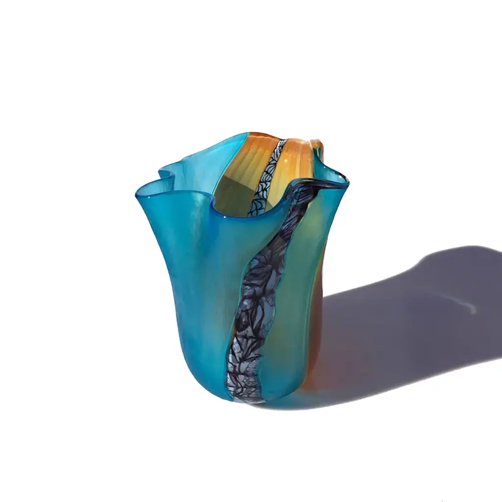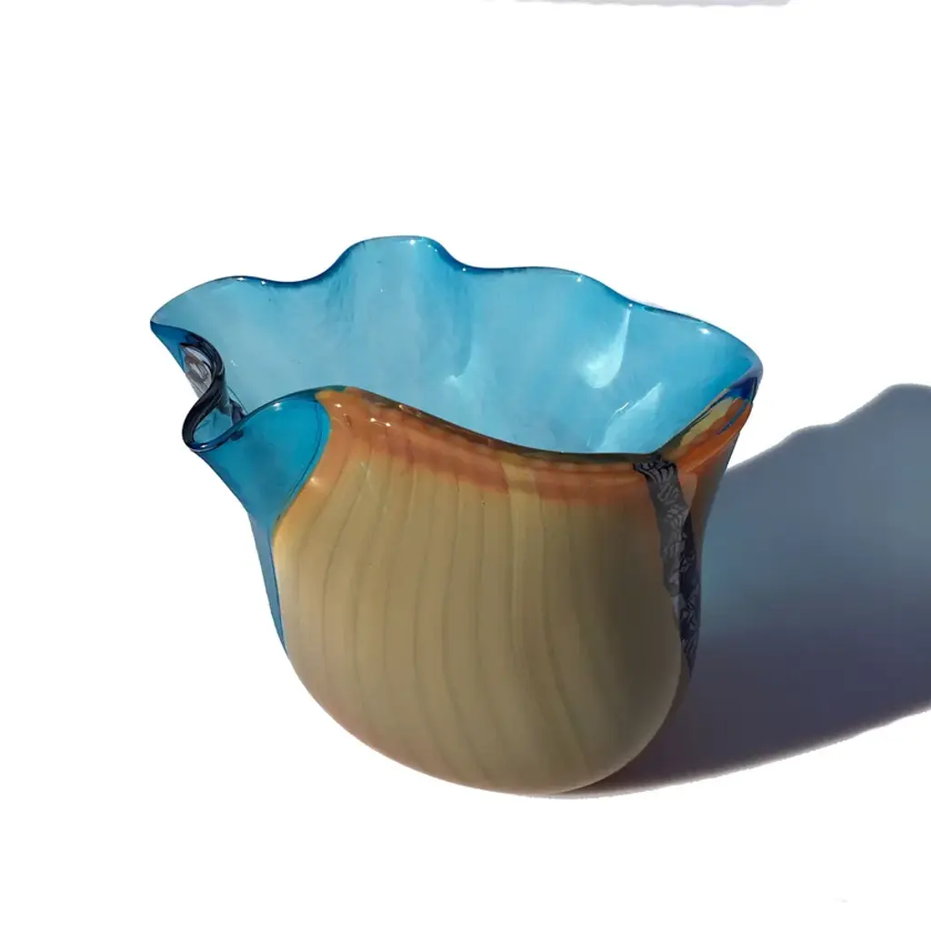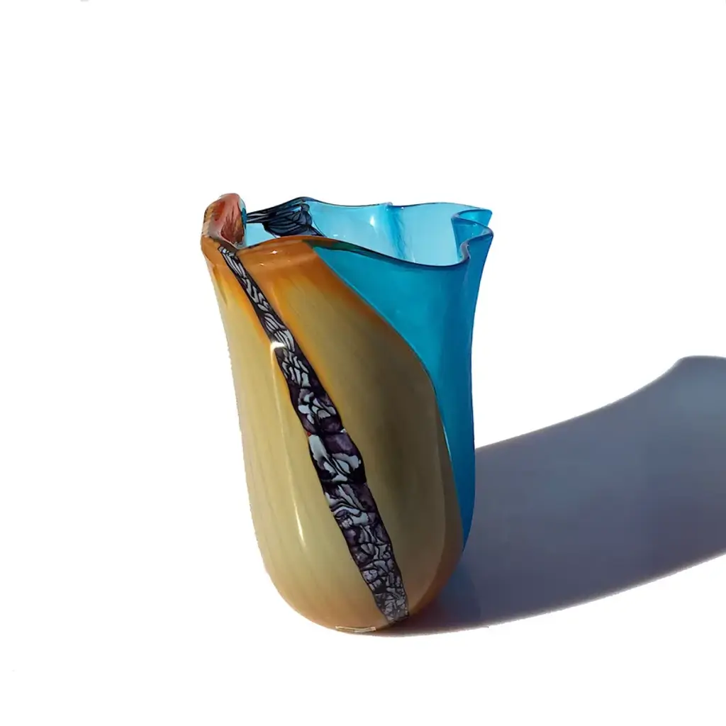 OASES is a pleasant Murano Glass vase with handkerchief design shape light blue and amber nuances. Think about this artistic glass item to let your guests speechless.Here you can find unique handmade glass vases in original Murano glass. They are the product of a long tradition of Venetian glass craftsmanship that has been going on for centuries. They are authentic works of art that perfectly combine the tradition of Murano glass processing and the innovation of contemporary Italian design. All YourMurano products are artisanal and of the highest production quality. Non-substantial variations in shape, size, color, and/or minor imperfections are inevitable and are typical of manual glasswork, highlighting the artisanal craftsmanship.