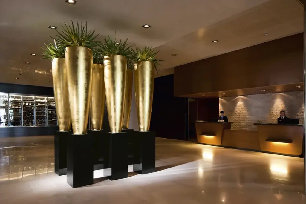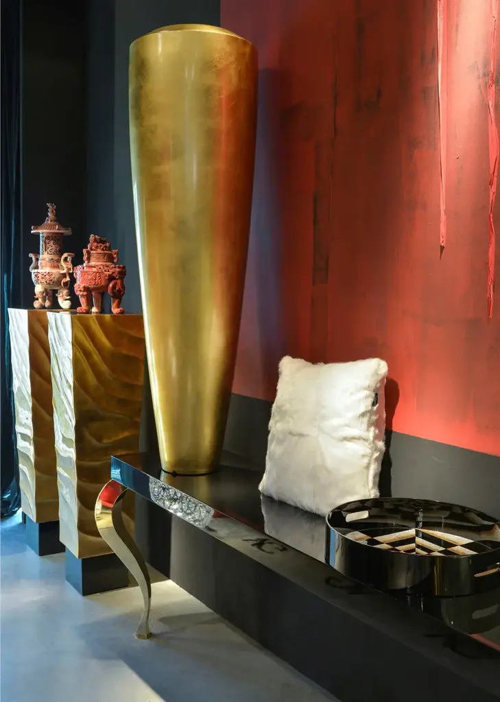 OBICE FOGLIA ORO | Polyethylene vase with gold leaf finish, ideal for interior decoration of private villas or luxury hotels, as well as weddings and events settings.