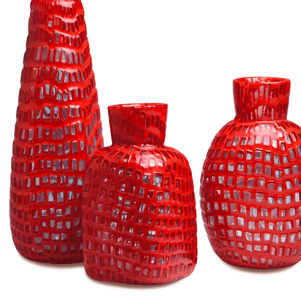 Based on an exclusive design by Ludovico Diaz de Santillana and Tobia Scarpa, this vase is available in three sizes and two colors, red, and white. It is handcrafted of mouth-blown glass with a bottle shape showcasing a highly graphic pattern obtained with the "murrine" technique.