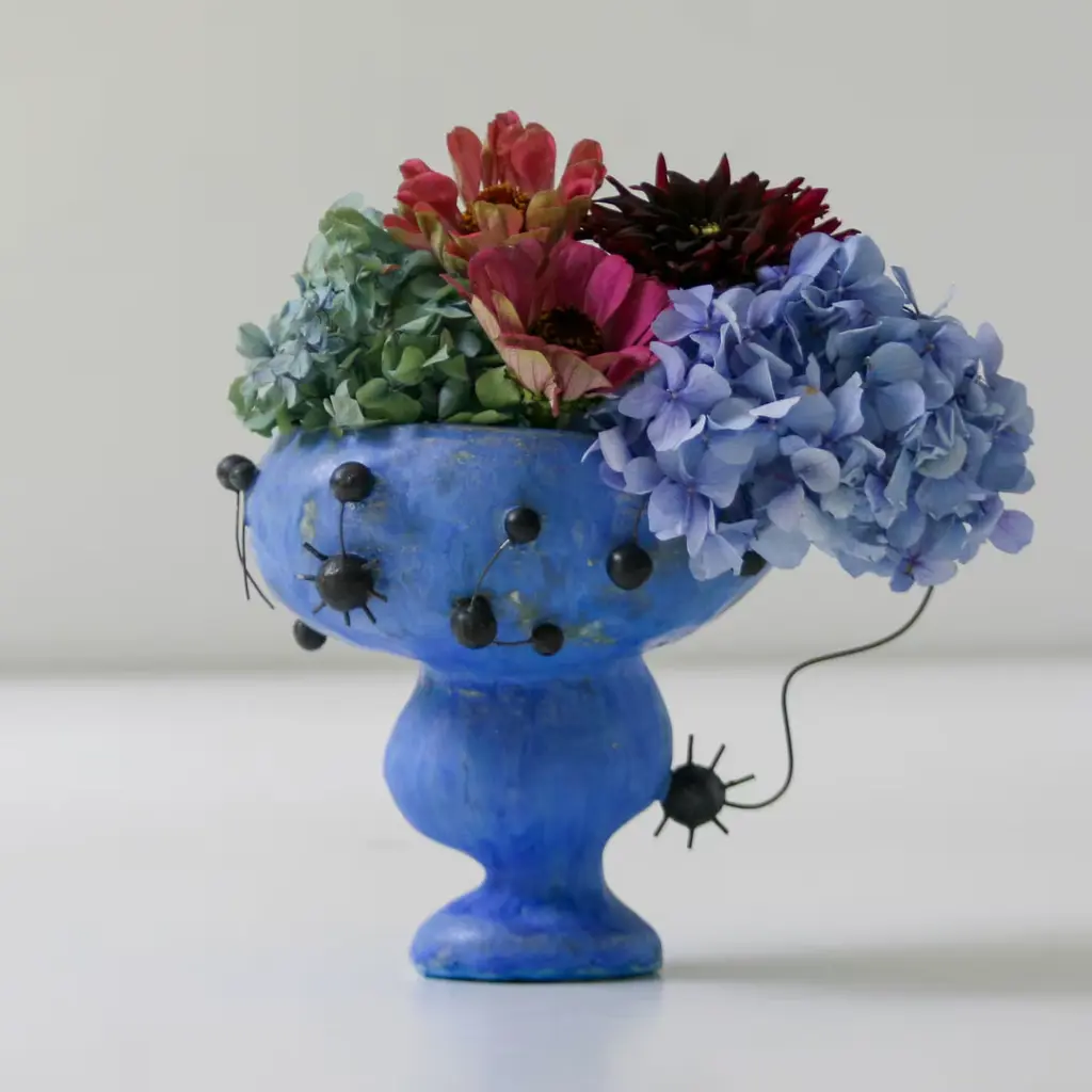 The Oh Joan sculptural vase draws inspiration from the poetic forms of Joan Miró, showcasing unique volumes crafted with the colombino technique. Its robust stoneware body contrasts with delicate black metal wire accents that add dynamic lines and textural interplay. Finished with a semi-gloss glaze, it offers rich color depth and radiance, making it an artful centerpiece or a vibrant accent in neutral settings without overwhelming the space. One-of-a-kind piece.