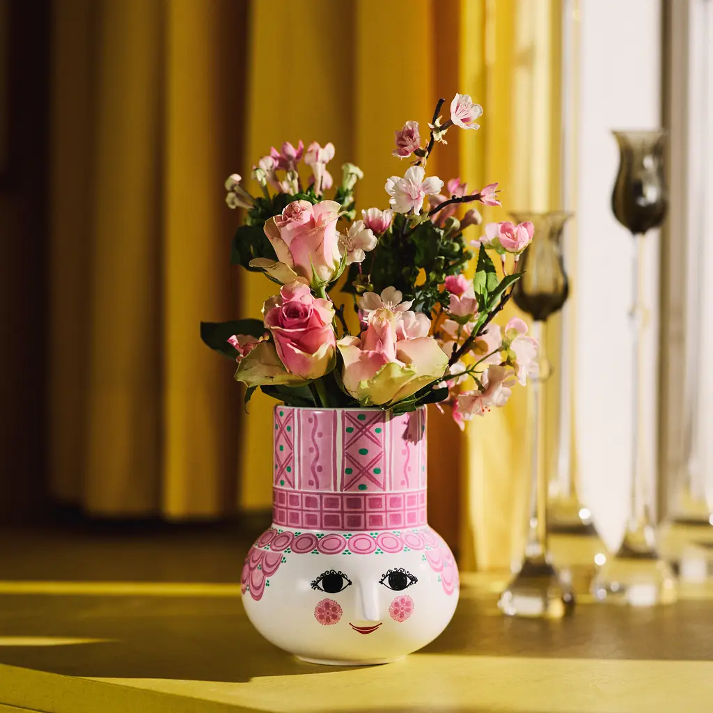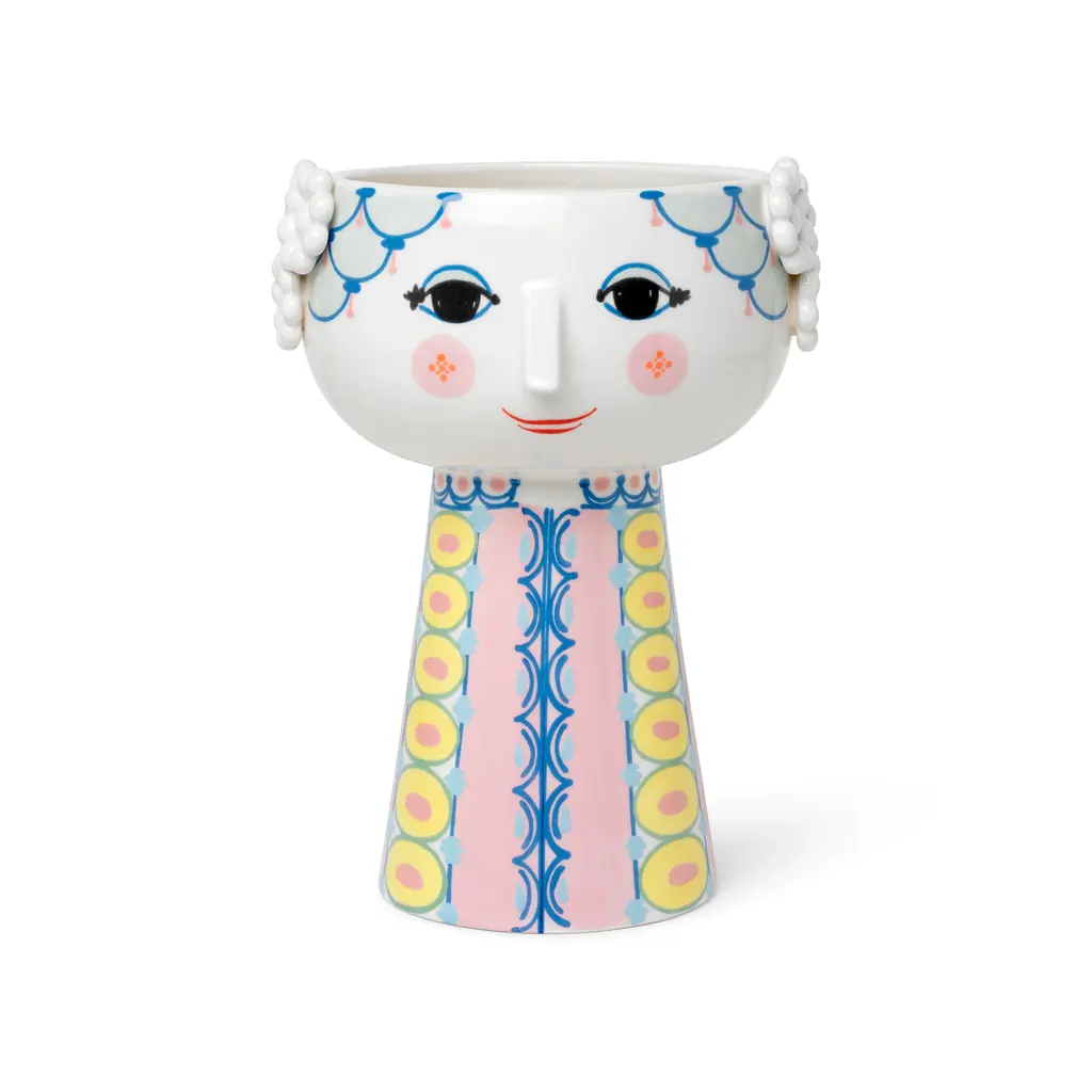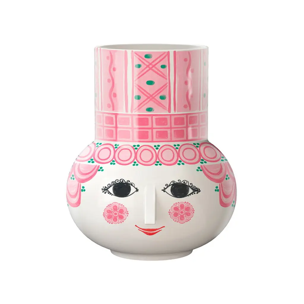 The Bjørn Wiinblad Olga Vase in pink stands 5.9″ tall and brings a playful tone to shelves, tables, or windowsills. Made from glazed ceramic, the vase features Wiinblad’s unmistakable illustrated face—complete with almond-shaped eyes, pink cheeks, and a small, serene smile. The decorative pattern on the cylindrical top is inspired by original works created by Wiinblad at the Nymølle ceramics factory. Compact but full of character, it’s a cheerful piece whether used for fresh flowers or simply displayed on its own.