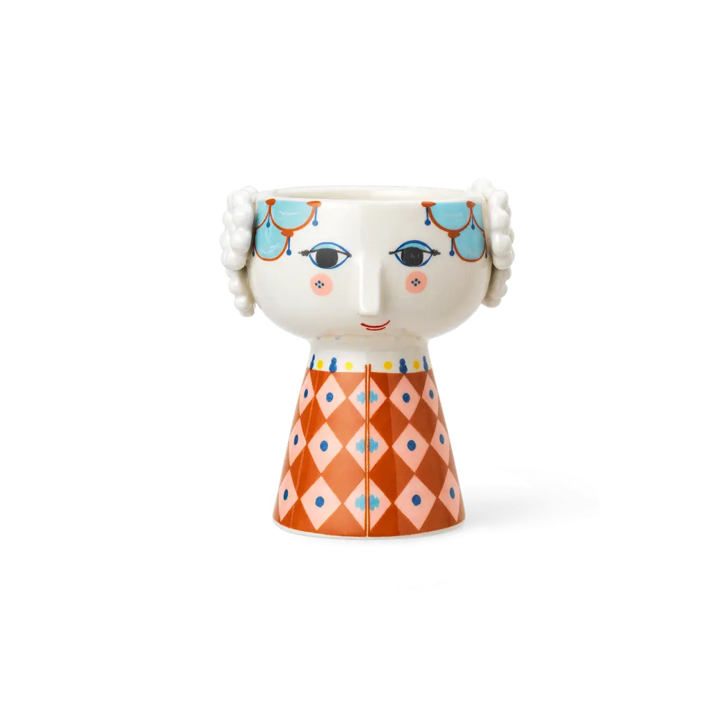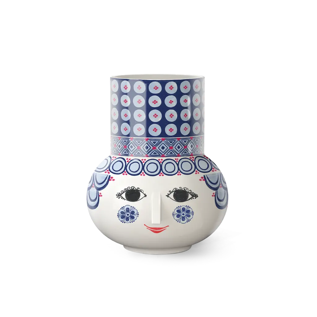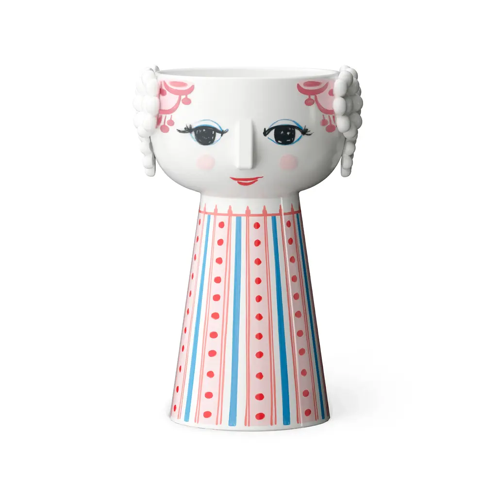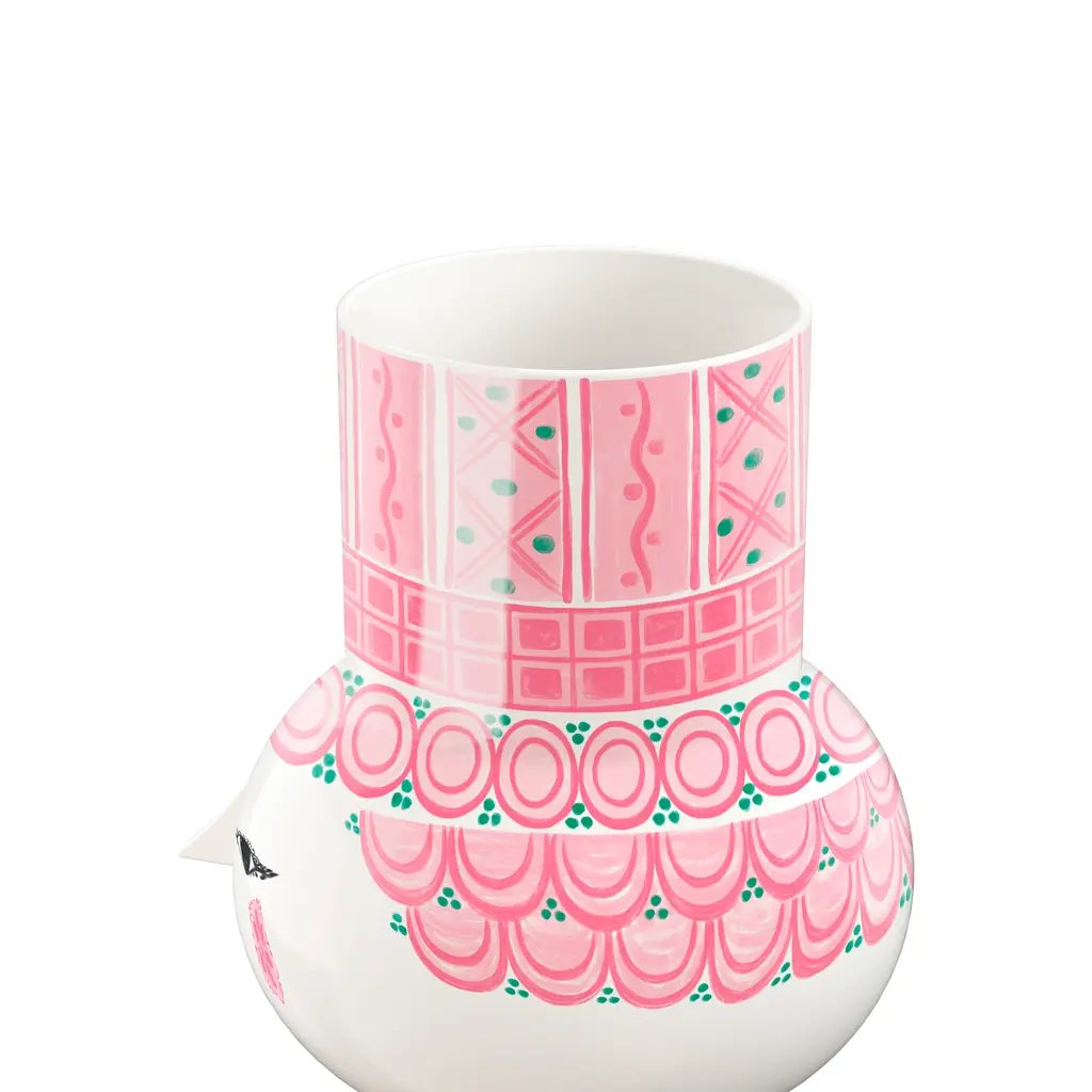The Bjørn Wiinblad Olga Vase in pink stands 5.9″ tall and brings a playful tone to shelves, tables, or windowsills. Made from glazed ceramic, the vase features Wiinblad’s unmistakable illustrated face—complete with almond-shaped eyes, pink cheeks, and a small, serene smile. The decorative pattern on the cylindrical top is inspired by original works created by Wiinblad at the Nymølle ceramics factory. Compact but full of character, it’s a cheerful piece whether used for fresh flowers or simply displayed on its own.