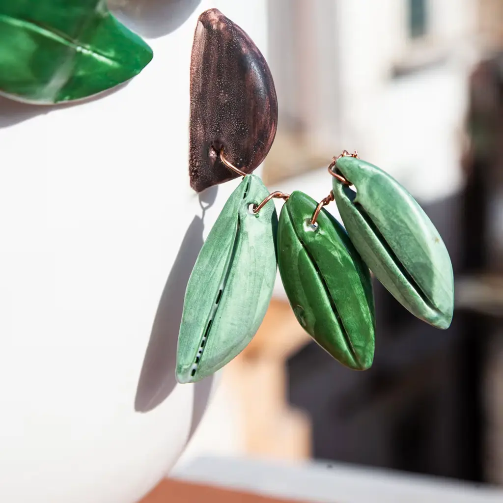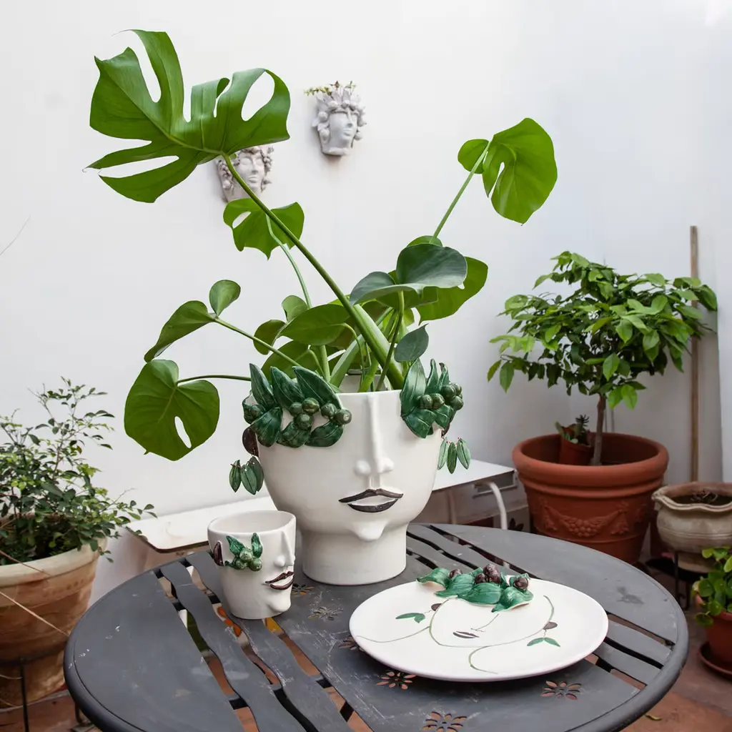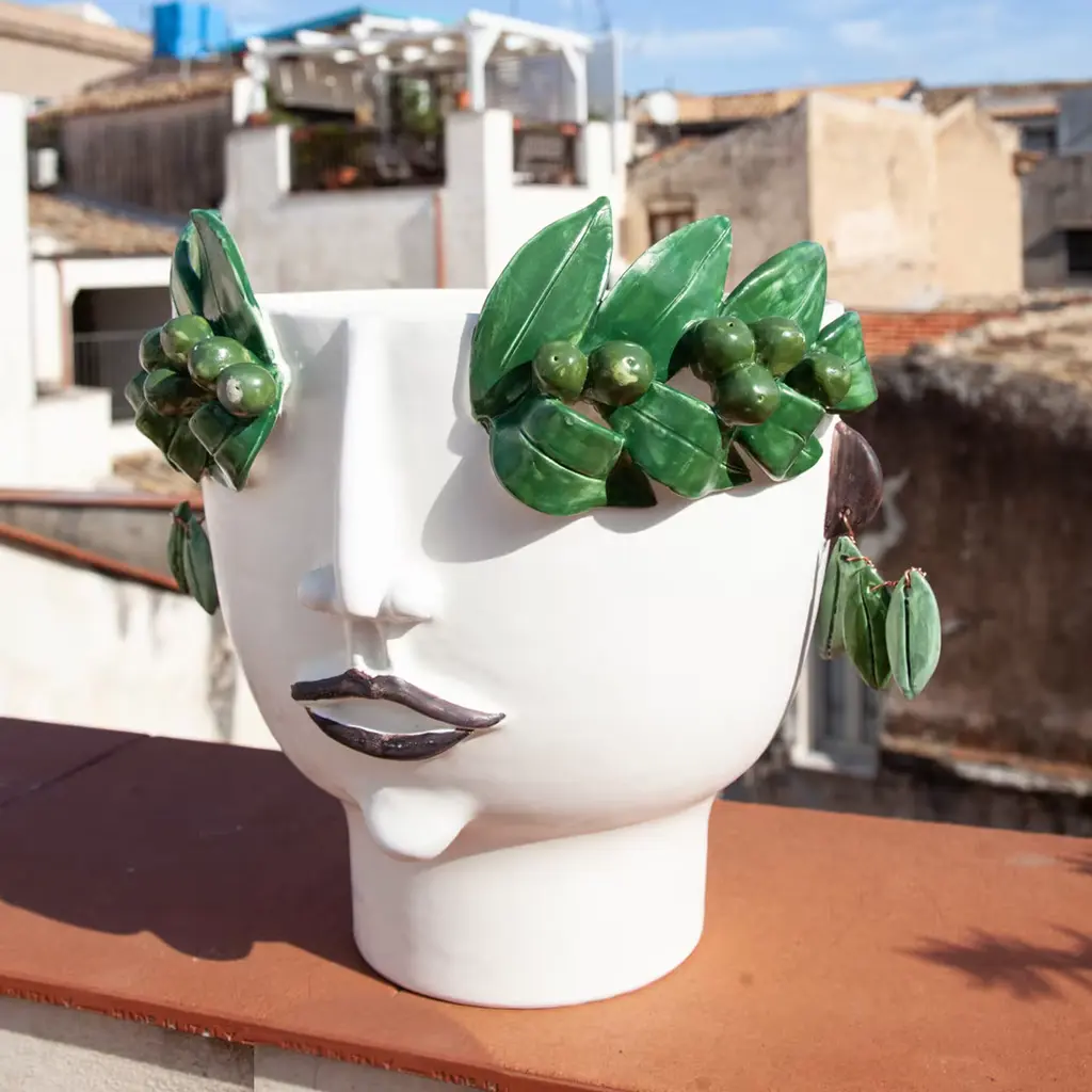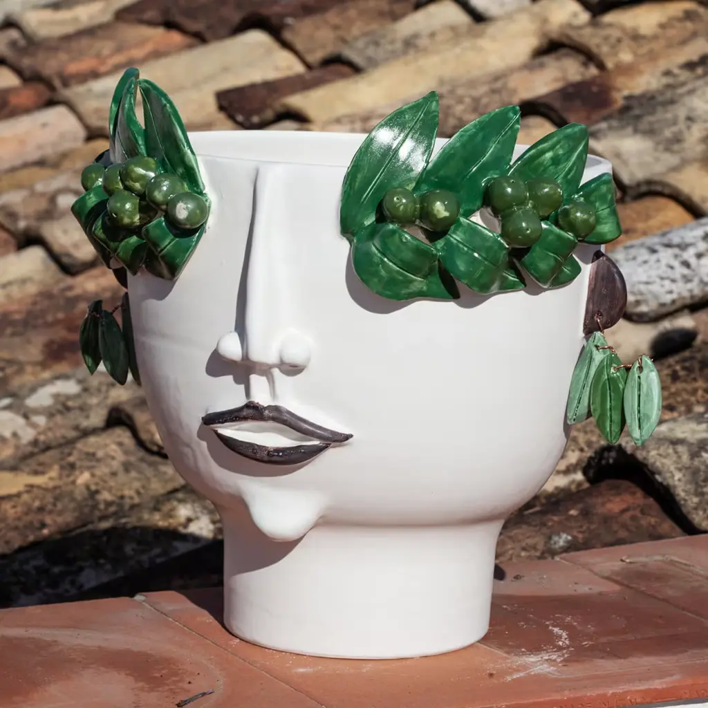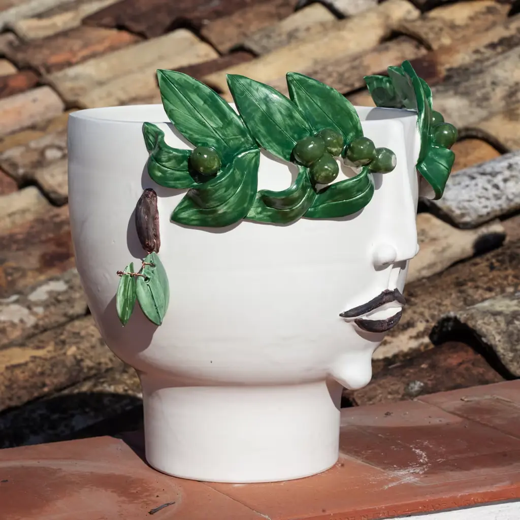 Handcrafted of matte white ceramic by artist Patrizia Italiano, this enthralling vase will make a superb statement in patios, terraces, as well as in refined interiors. The anthropomorphic design depicts female traits of a street vendor of olive oil - as confirmed by the green garlands of olive leaves and fruits gracing the top and the ear-like, protruding elements accented in black as the lips.