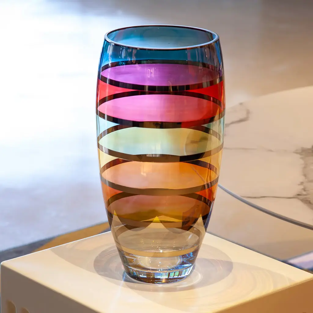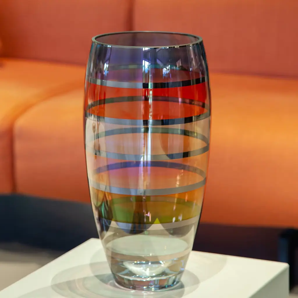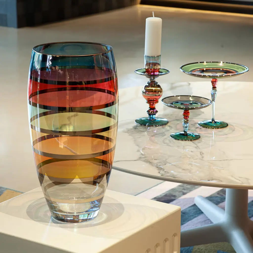 Playfully named after the Italian for olive due to its bulging body tapered towards the extremities, this vase boasts a bubbly design of stripes in different colors alternating with gleaming platinum rings inspired by the Olympics. Its eccentric design favors its merely decorative use. Part of the Olimpia Collection, it is also an homage to Milan's 2026 Winter Olympic Games.
