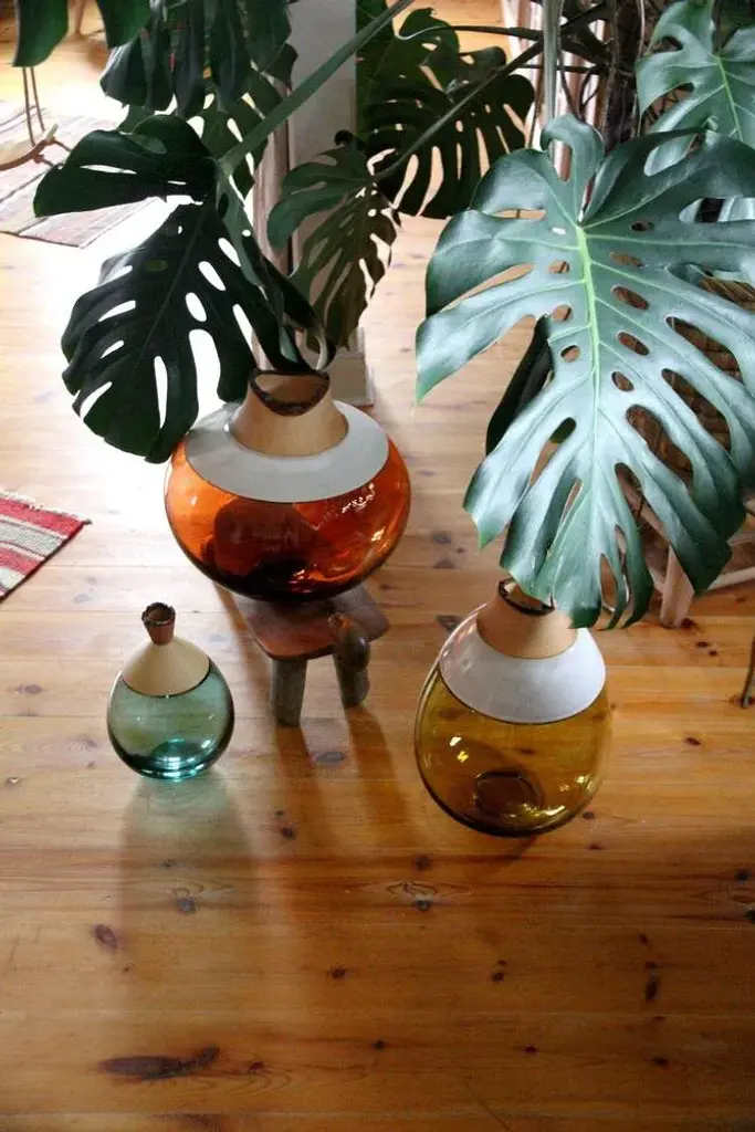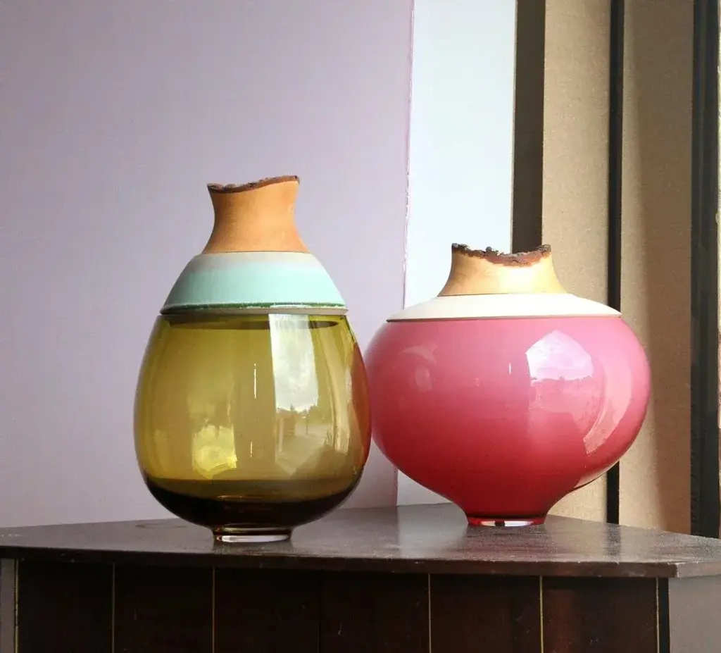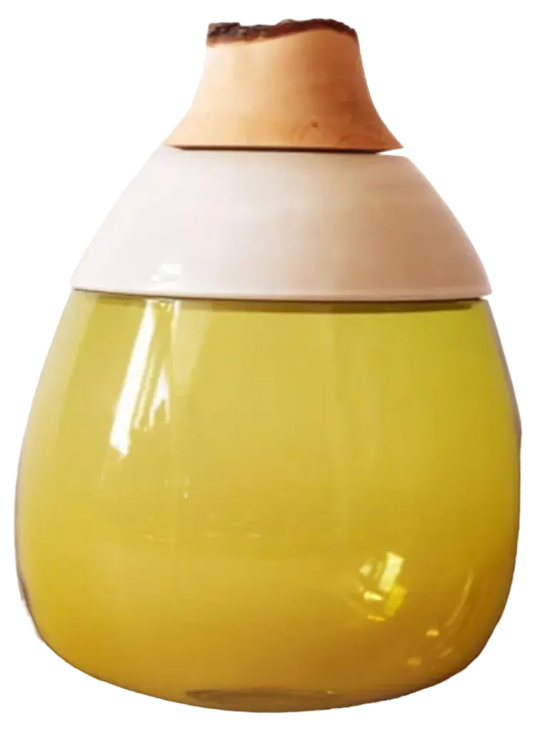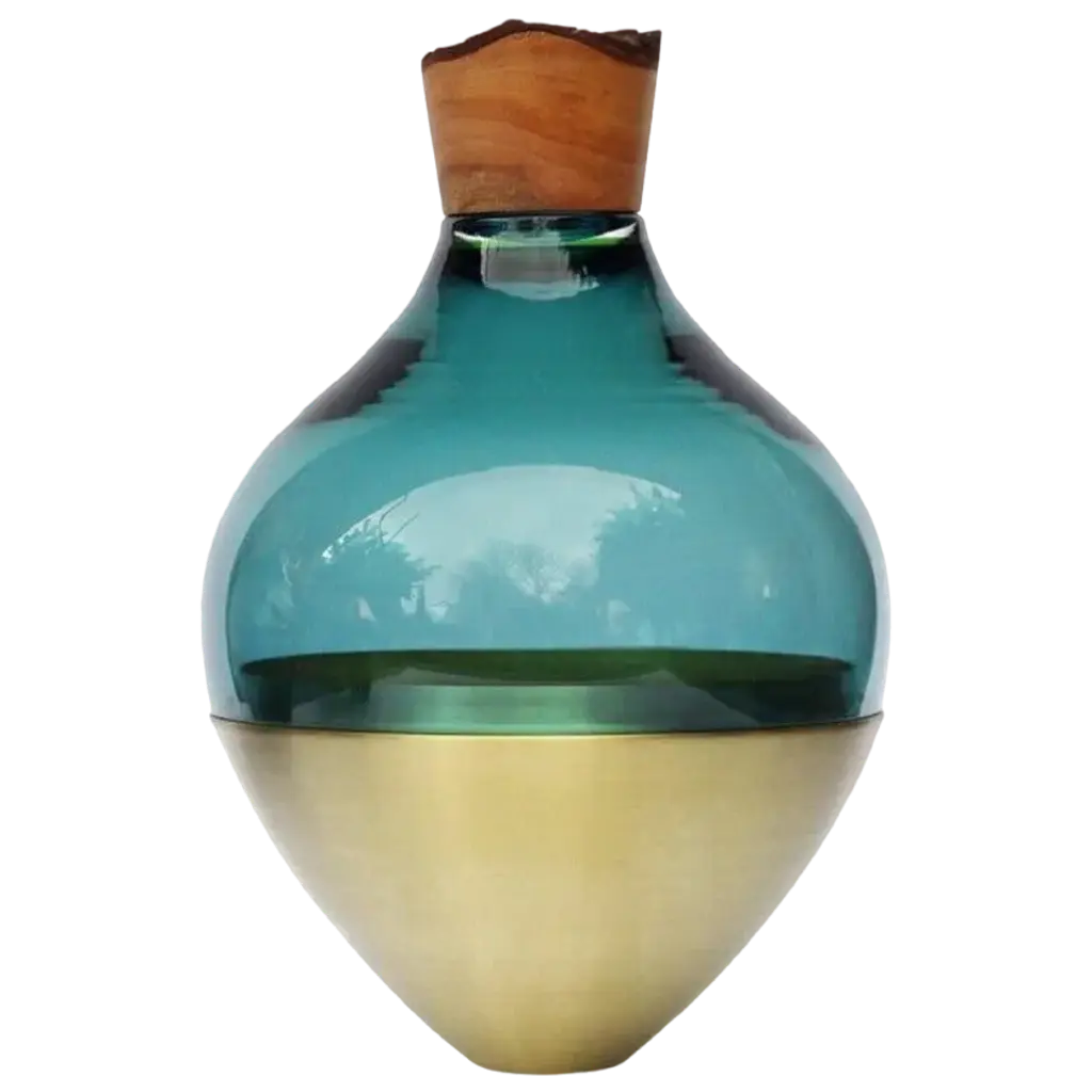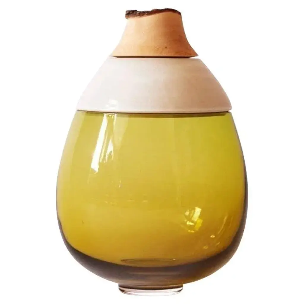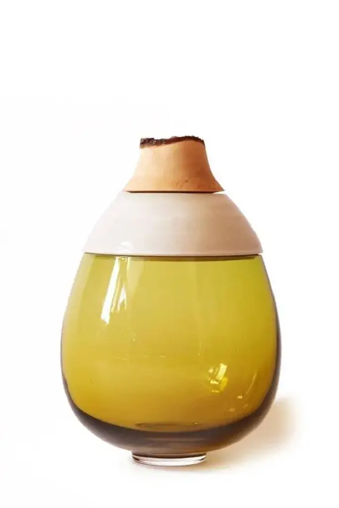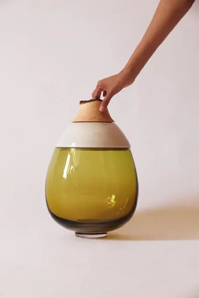 Olive paradise lilith stacking vessel, pia wüstenberg dimensions: d 25 x h 42 materials: glass, wood, ceramic available in other colors. A collection of two pieces, eve & lilith, combining large scale glass and stoneware ceramic with delightful glazes. Handmade in europe: handblown glass (czech republic), ceramic (handmade in scotland), hand turned wood (finland). The materials then come to our warehouse in north germany where they are fitted and assembled. This piece is attributed to the mentioned designer/maker. It has no attribution mark and no official proof of authenticity, however it is well documented in design history. I take full responsibility for any authenticity issues arising from misattribution