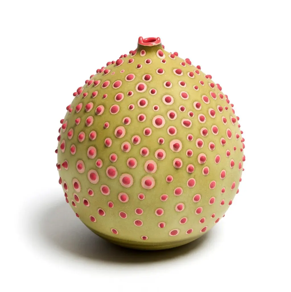Olive Petri vase by Elyse GrahamDimensions: W 13 x H 14 cmMaterials: Plaster, ResinMolded, dyed, and finished by hand in LA. CustomizationAvailable.All pieces are made to orderOur Microbe Collection is inspired by the unique galaxy of microorganisms living within each of us. We created a technique for dying and stippling each vase that evokes the nature of microbes as they grow and colonize . Each vase is hand-cast with hydrocal plaster inside of a unique balloon shape. The interior of each piece is poured with layers of resin, making it waterproof. Finally, each vase is hand-dyed with custom mixed pigments and finished with a unique pattern of dyed plaster protuberances. The exterior of each vase is sealed with a UV resistant acrylic coating. These vases are all handmade and will vary slightly in shape, size, color and pattern.Founded in 2014 and based in Los Angeles, the Elyse Graham Studio is a place where unusual materials and experimental processes are implemented to create a melding of art and object. We design by making—with an emphasis on capturing the unique properties of the materials we use through exploration and innovation. Each piece we make is non-repeating and completely individual. We have intentionally designed every process we use — from how we mix our colors to how we cast our forms to highlight and celebrate the time-based, made by hand quality of our work. All of our pieces require a specific kind of care and attention at every level of production. At the core of our studio is our endless fascination with inviting the unknown into our work and exploring our passion for creating pieces that tell a story— about the materials they are made of, the artists who make them and the homes they live in. Each piece is a journey, come along with us.MEET OUR TEAMElyse Graham is the founder and creative director of the studio. Driven by Elyse’s unique vision of building a studio that fosters and emphasizes connection, play, and experimentation (of people, processes, and in turn the objects created and shared) our small team works closely and collaboratively on each project. Elyse received a BA in sculpture and semiotics at Brown University. After years of making sculpture and running a business in jewelry design, Elyse decided to merge her separate practices and redirect her attention toward collectible design in 2013. The creative trajectory of the studio is heavily influenced by Graham’s background in fine art, specifically her interest in process-driven and material-based artwork. The studio’s vocabulary of shapes, patterns, and forms comes from a lineage of unconventional processes Graham has developed and built for working with plaster and resin. Graham shares her studio as well as her home with her husband, Lewis Mauk and their daughter, Eero. Miller Robinson is head of our production department. From pigmenting and casting materials for all of our products in plaster and resin to graphic and production design, they wear many hats in our studio. Miller joined our team in 2014 and has been an integral part of designing many of our experimental processes that have lead to the creation of our unique MetaMATERIAL. Like Elyse, Miller has a background in material and process-oriented making, which led to an instant connection and collaborative understanding between the two. Miller received their BFA from Otis College of Art and Design with a focus on painting, installation, performance, and writing. Their individual art practice focuses on the preservation and potentialities of underrepresented histories and encompasses objects, garments, actions, tattooing, and books. Their personal work has been exhibited in Los Angeles at the Southwest Museum, Los Angeles Municipal Art Gallery, Heritage Square Museum, and with Los Angeles Contemporary Exhibitions (LACE), as well as HORESEANDPONY Fine Arts in Berlin.Lewis Mauk is our studio and operations engineer. Working on facilities and production design as well as engineering and leading all of our large-scale constructions and installations, Lewis’ unique set of technical skills gives form and structure to our studio’s unconventional ideas and processes. Lewis has been working behind-the-scenes since the creation of the studio but joined our team full-time in 2020. Consistent with the rest of our team, Lewis has a background in process-driven fine art and has extensive training in woodworking, printmaking, and photography. He received a MFA from CalArts and has worked across the fields of education and fabrication. Lewis’ combined interest in the creation of personal archives mixed with his commitment to sustainable life practices, has brought a focus and important emphasis on designing studio projects and processes that imagine ways to reduce and reuse studio material fragments.