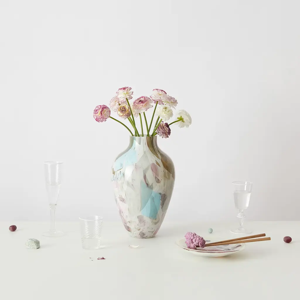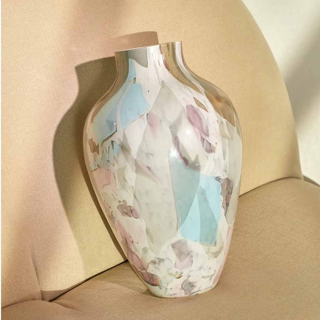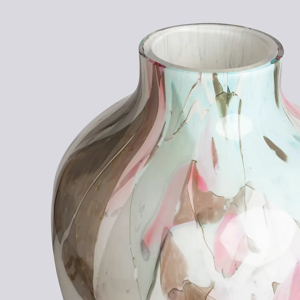 The Olla Winter Tall Vase, crafted by skilled Murano artisans, beautifully embodies winter's serene palette. Delicate gray, pink, and light blue hues are arranged on an ivory base with exceptional craftsmanship, evoking tranquil snowscapes and frost-kissed mornings. This captivating vase serves as an elegant focal point, adding charm to any space. Each piece is a unique testament to Murano’s rich glassmaking heritage, passed down through generations, preserving timeless artistry.