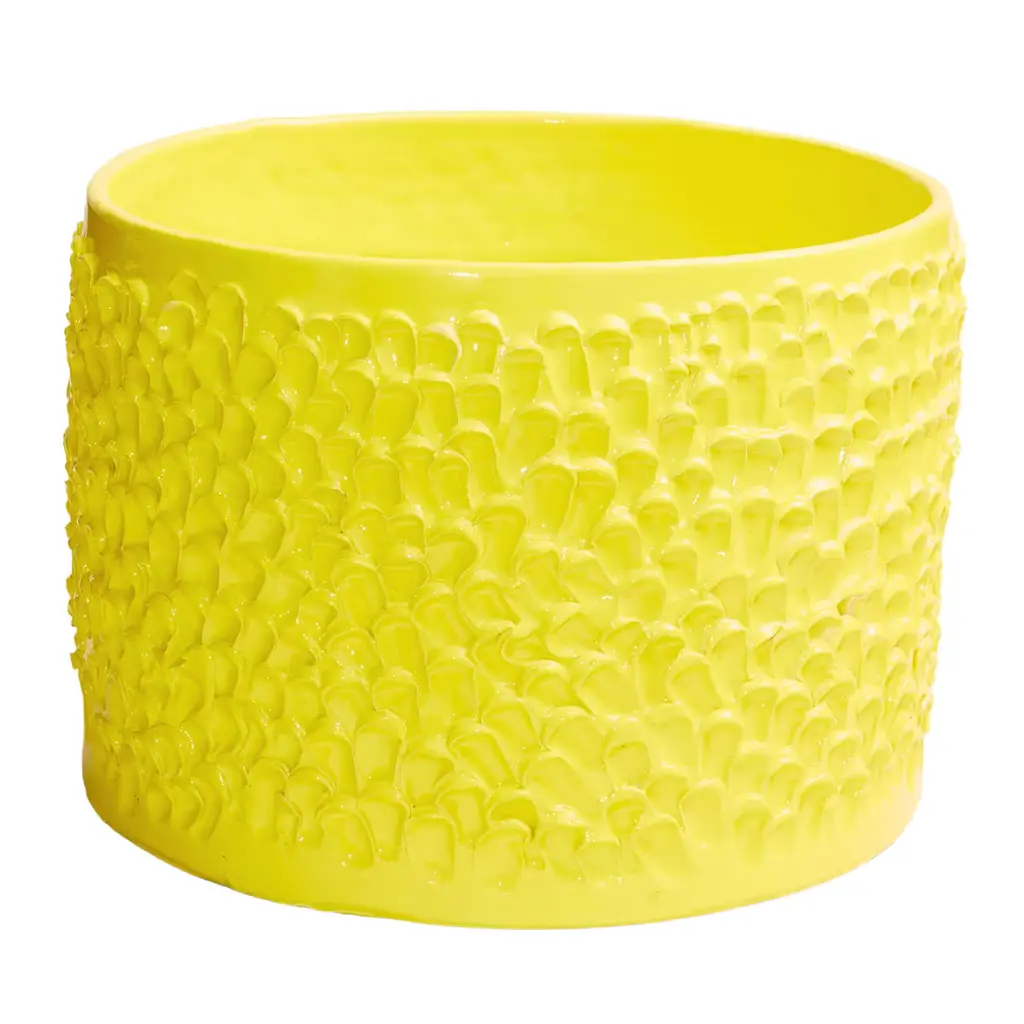 This vibrant canary yellow vase is a stunning decorative element, perfect for both classic and contemporary interiors. It can hold a plant with an inner vase or stand alone as a striking piece. Suitable for outdoor display if protected from frost, it offers full customization with any RAL color and comes in a semi-gloss or polished finish. Handcrafted without molds and part of the limited 'Onda series', its flowing texture adds elegance and exclusivity to any space.