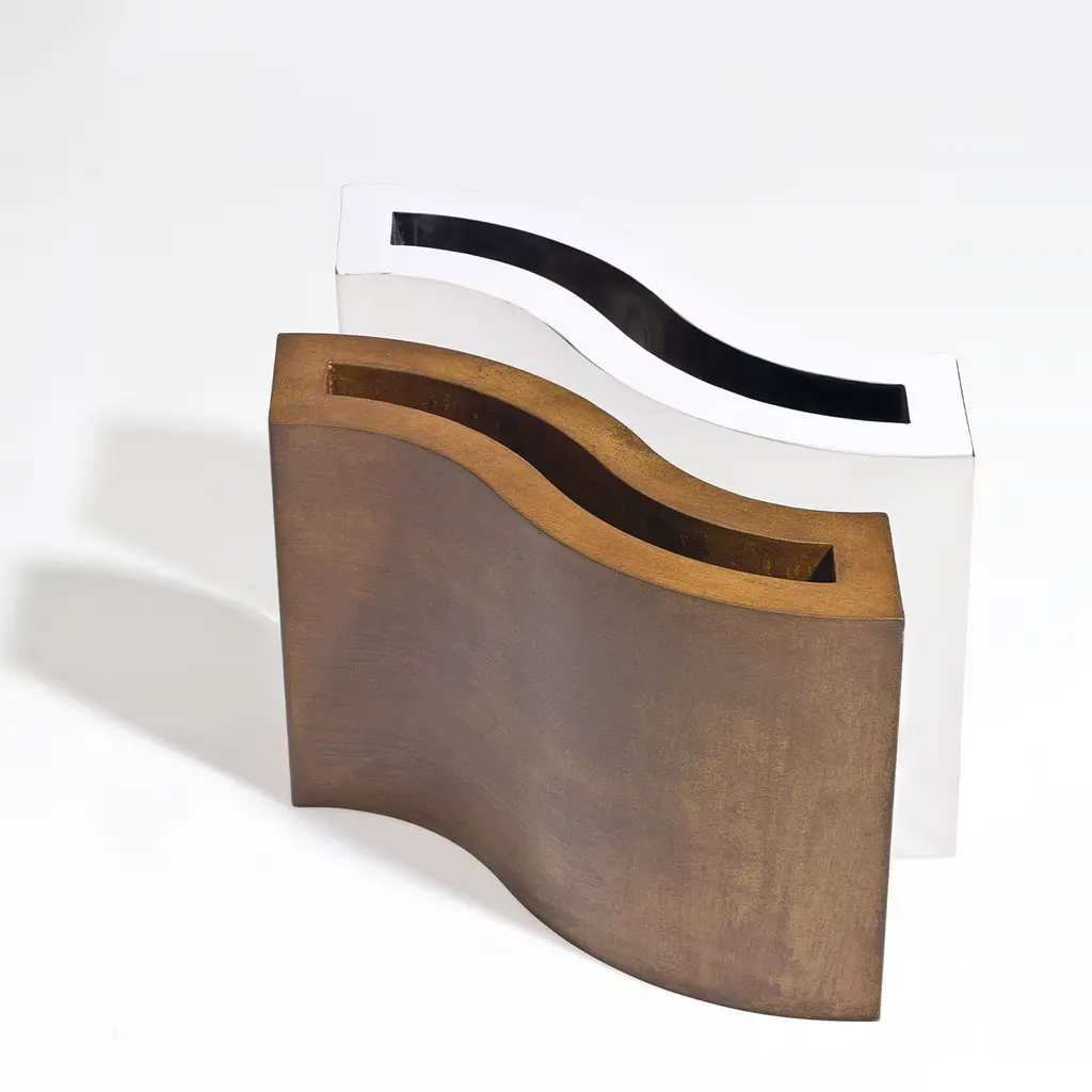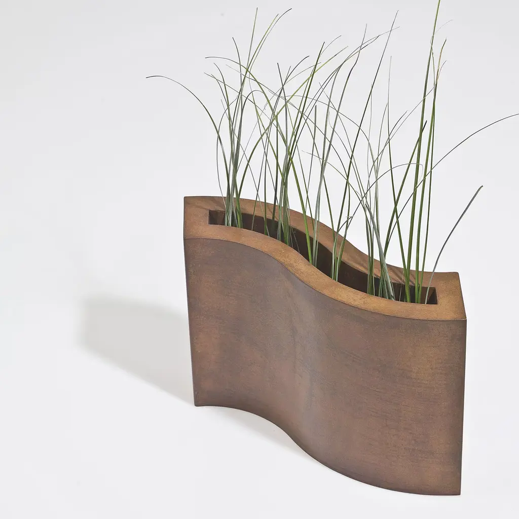 Ondina is a pre-oxidized corten steel decorative vase designed by Robert Evans. The harmony of contrasting forms elevates the concept of material elegance, bringing modern sophistication to both indoor and outdoor spaces. This handcrafted vase adds a playful touch to any setting, enhancing the environment through the contrast of noble materials and refined formal configurations.