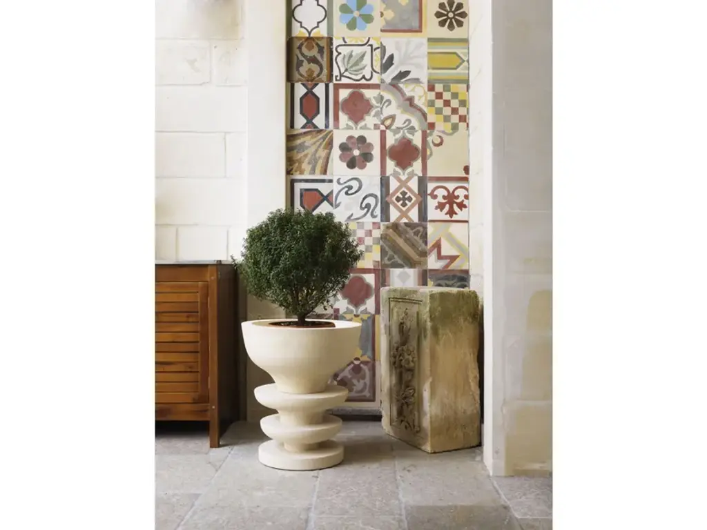 Ondulation is a Lecce stone vase. Pimar natural stone takes the shape of a series of structures similar to undulating towers. The result is a "family " of remarkable objects comprising a table, a stool and a vase, entirely made from stone thanks to the turning technique. They may perform everyday functions in outdoor spaces but also lend themselves to providing indoor furnishing solutions.