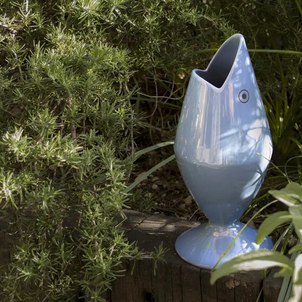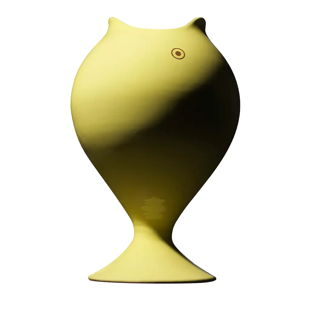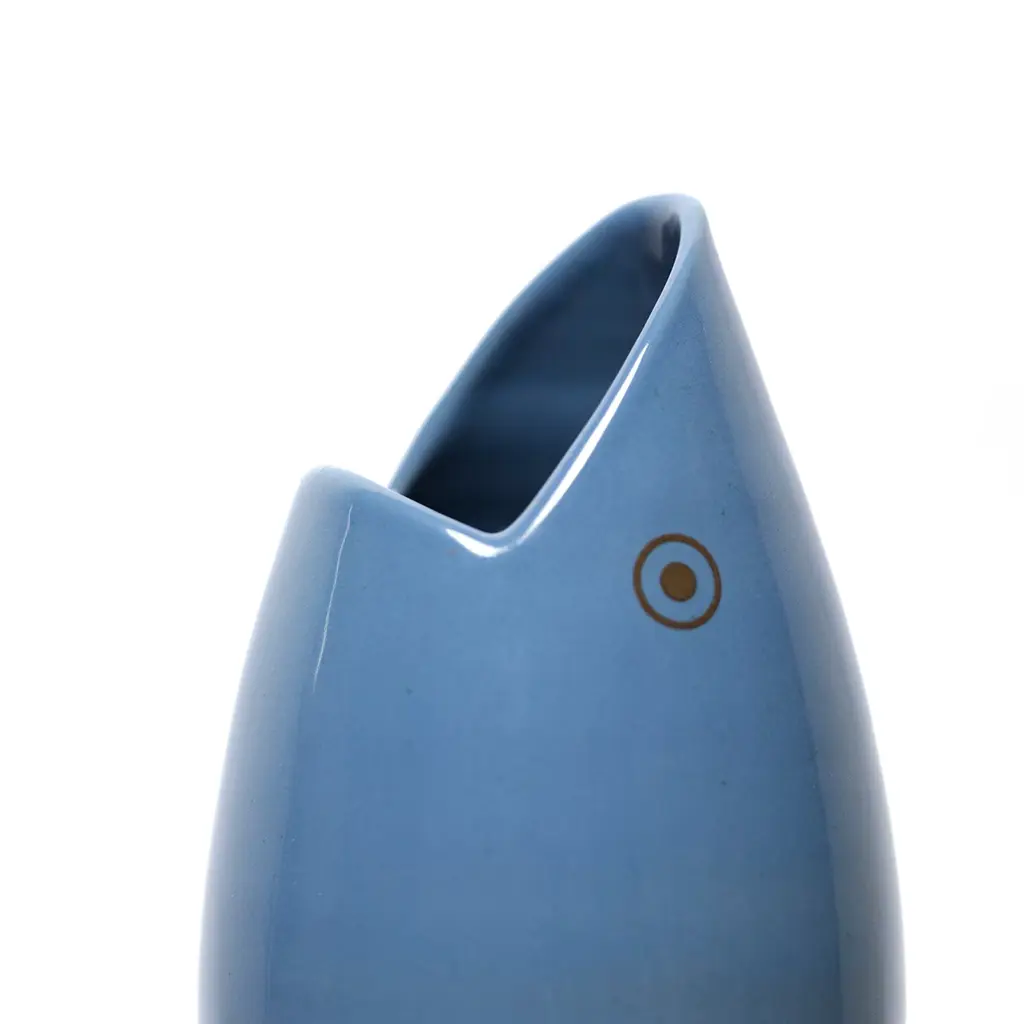 Inspired by tuna, this ceramic vase glazed in a fresh lavender hue makes for the ideal solution to arrange floral compositions adorning entryway consoles or dining tables. The hand-painted eye on the side and the wide mouth reveal its distinctive whimsical character. Please browse the Artemest catalog for similar designs.