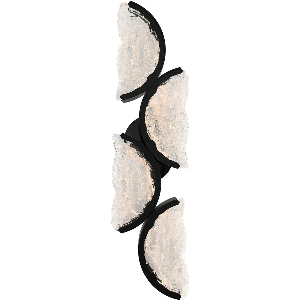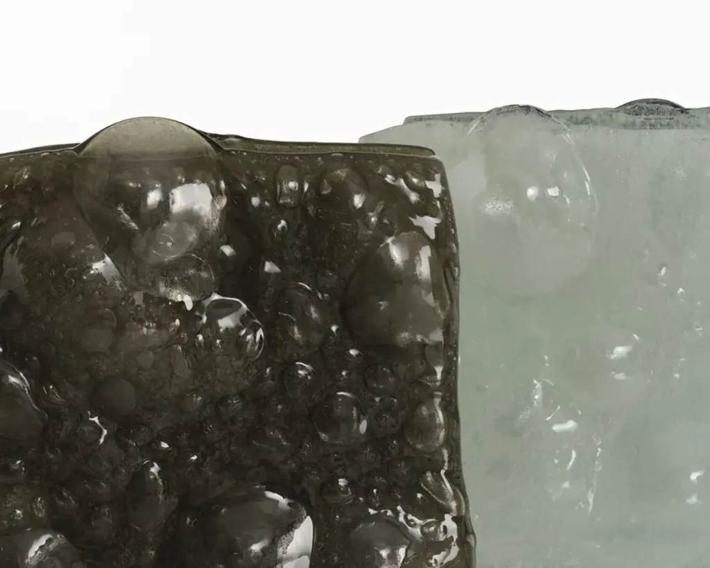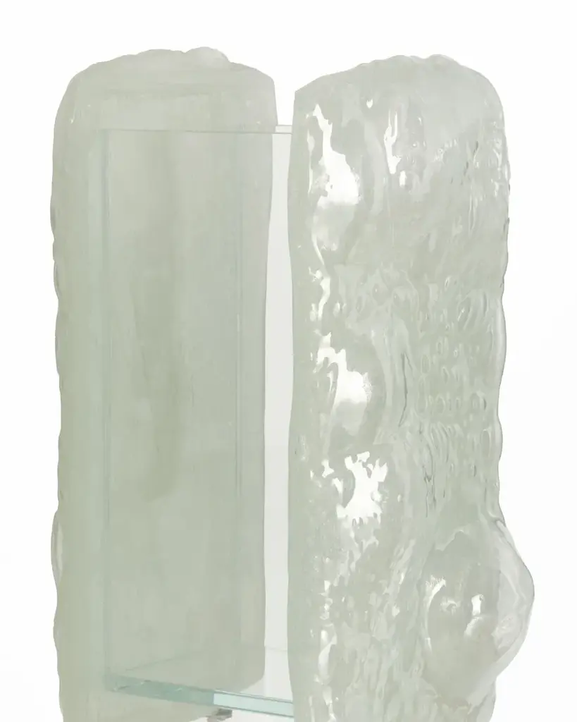 OPALIA is a collection of vases characterized by two side panels made by melting glass offcuts with special additives, resulting in irregular glass masses rich in bubbles and with wavy surfaces.These highly sculptural elements are then bonded to float glass sheets to form water-tight basins.Available in extra-clear or bronze glass.