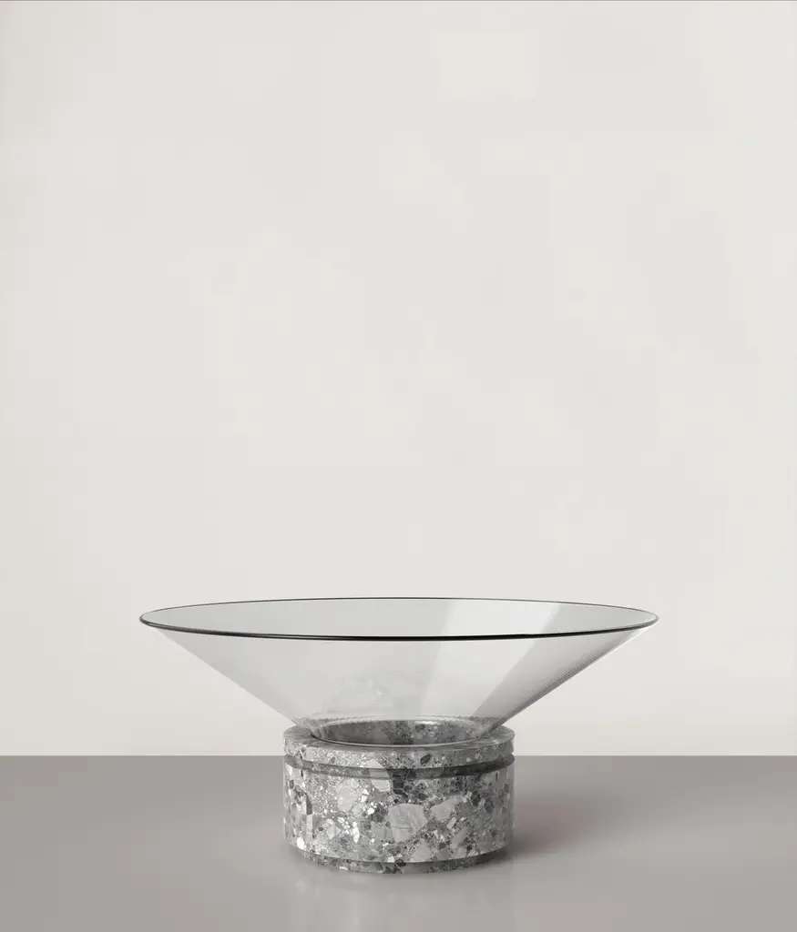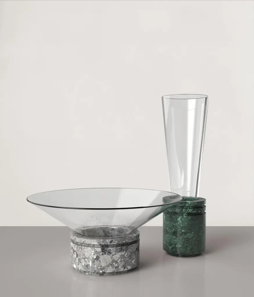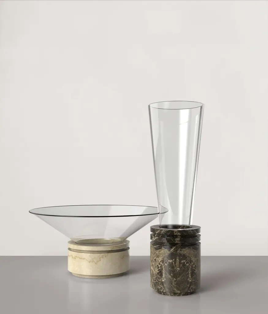 Opera V1 vase by Simone FanciullacciLimited edition of 150 pieces. Signed and numbered.Dimensions: D 35 x H 16.5 cmMaterials: Oreo grey + shiny glassOpera is a 21st century collection of sculptural vases made by Italian artisans. It is part of the collectible design language Opera that has been developed by the Edizione Limitata’s art research team in Milan. The piece arouse from a study on revolution solids and hundreds of harmonic shapes tests. The results resemble instruments from a different culture with a long story that will be narrated in a new interior.An elegant, lyrical language, where the conical shape of glass, a sharp material, subdues a soft base firmly planted in the marble ground.Geometrical shapes are assembled into a rational reflective composition that provides a distinctive point of view to the surrounding interior. Nori’s language plays with its chiaroscuro contrasts in a spontaneous way and its organic forms exchange light with each other with extreme lightness.Edizione Limitata, that is to say “Limited Edition”, is a brand promoting and developing objects which combine a unique design with the tradition and quality of made in Italy.Edizione Limitata celebrates love for design, details and dialogue between different materials and it constantly pursues to strike a balance between shape and matter, project and production.The collection is the result of such a conception: objects which are able to become part of everyday life and tell a story of passion and research.Edizione Limitata is a brand curated by Simone Fanciullacci.