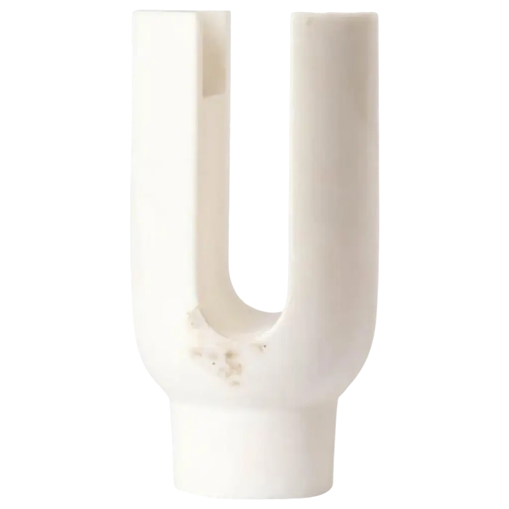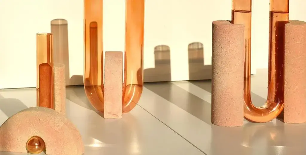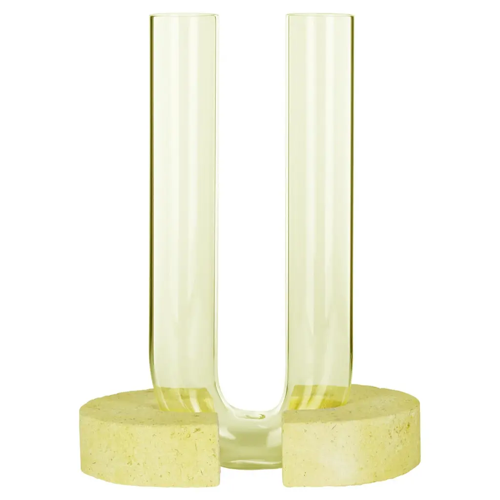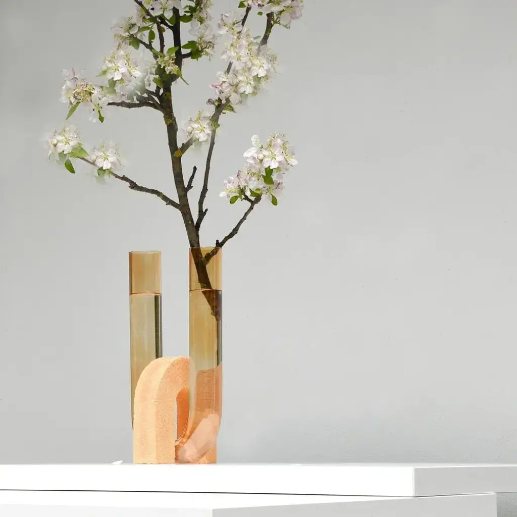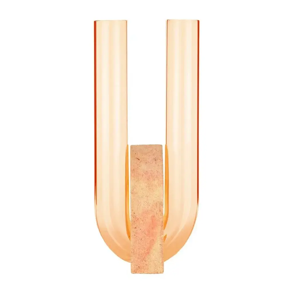 Orange-orange cochlea della liberazione soils edition vase by coki barbieri dimensions: w 14 x d 14 x h 30 cm. Materials: handcrafted stone made with matera stone fragments, sedimentary rocks of the italian apennines and pure water, pink and yellow mineral pigments from italian soils, orange painted borosilicate glass. Cochlea della liberazione - soils edition - orange-orange cochleae vases collection is inspired by the life cycle of the snails and captures their growth when the invertebrate's body (represented by the curved glass) develops upwards from the embracing shell symbolized by semicircular shells handcrafted from fragments of historical stones only found in matera (città dei sassi, unesco world heritage, european capital of culture), recovered and reprocessed following a sustainable production cycle. The surface of the handcrafted stone piece is treated with an ecological substance developed by coki.