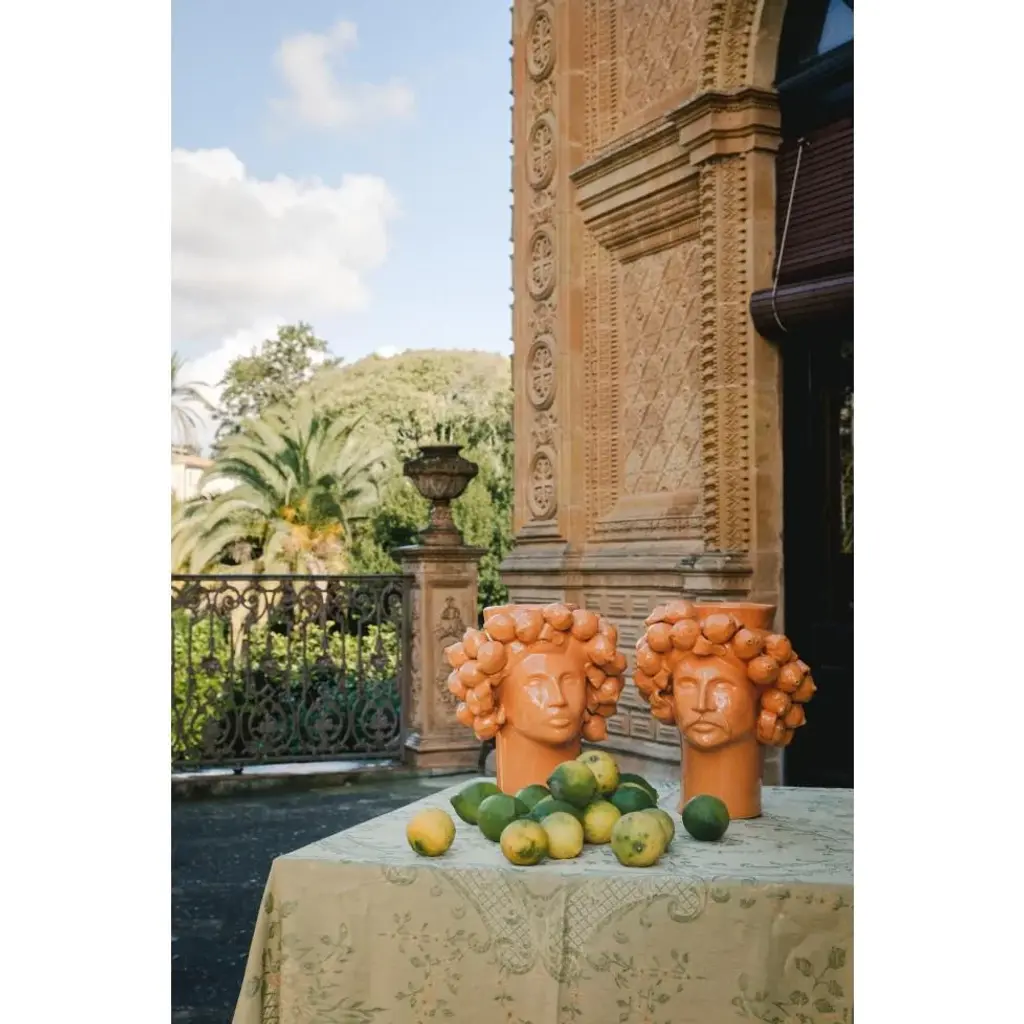 Solimano and roxelana are our moorish heads from caltagirone. Anyone who knows crita is aware that our moors have names, stories, dreams and a charm that from the east, through the mediterranean breeze, lead straight to sicily. Solimano and roxelana in giardino are the expression of that skill that only the ceramics of caltagirone are able to express\. Inspired by the citrus gardens of sicilian villas and embraced by a sumptuous citrus crown, the turbans of suleiman and roxelana become a triumph of plasticity and royalty. Oranges, lemons and leaves follow each other in a circle, decorating our moors heads with the most beautiful crown possible. Crita's heads, as always, are colored with highly sought-after and innovative colors. Colors of sicily that have the most contemporary vision of tones capable of making a home magical. Details & dimensions • material: ceramics • dimensions (in): w 10.2 x d 10.2 x h 7.8 • dimensions (cm): w 26 x d 26 x h 20 • handmade in italy